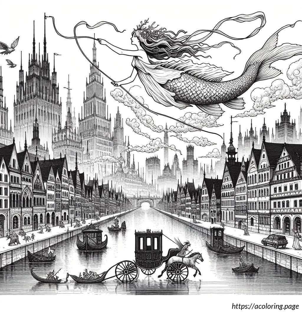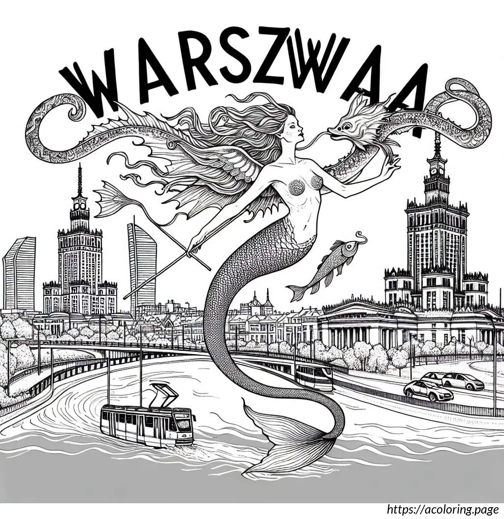 The image is a black and white illustration depicting a stylized scene of Warsaw, Poland. At the top, the word “WARSZAWA” (the Polish name for Warsaw) is prominently displayed in bold, decorative letters. Below this, a fantastical character resembling a mermaid with flowing hair and a long fish-like tail flies across the sky, holding onto one of the letters.