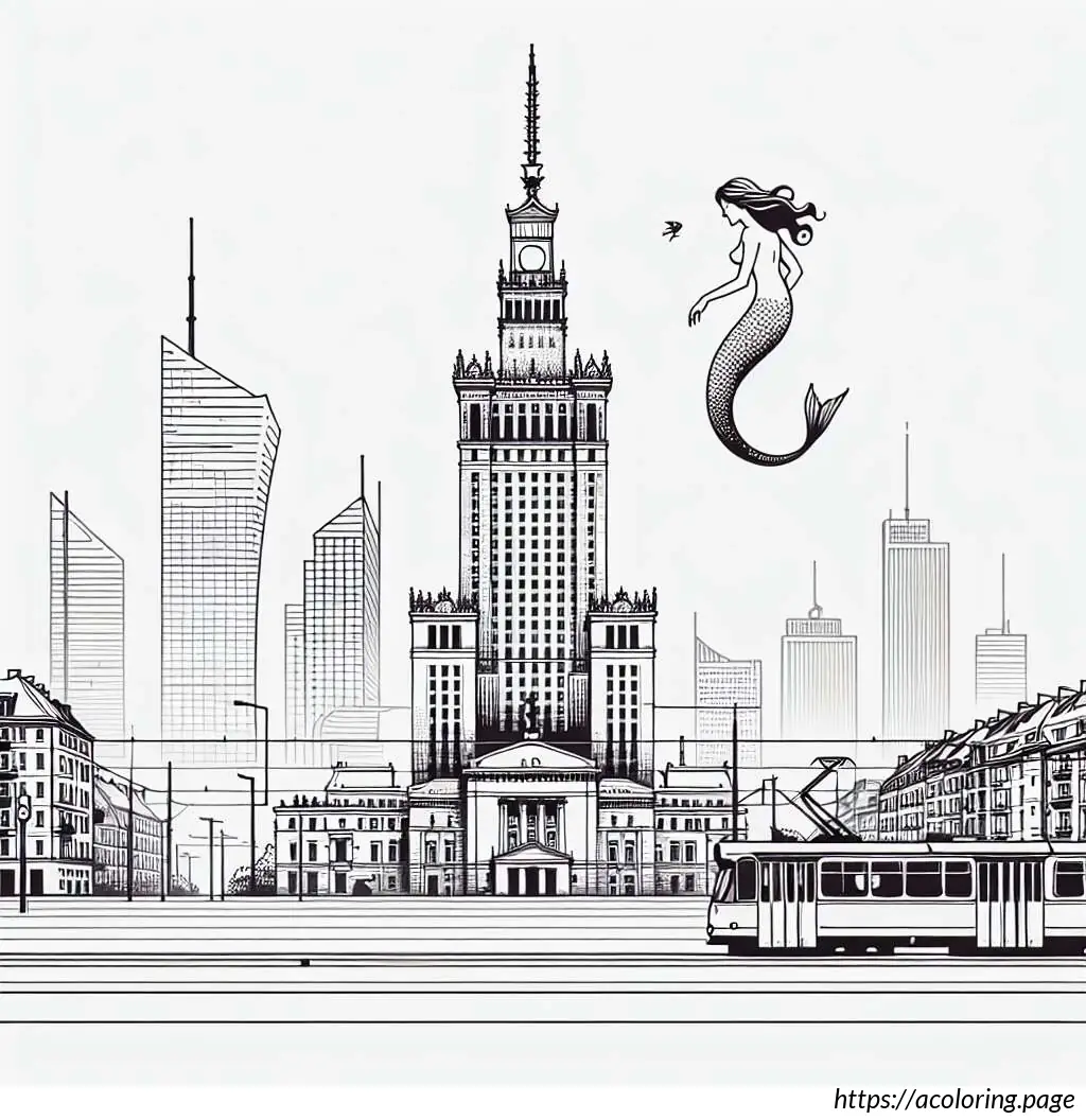 The cityscape includes iconic architecture such as a tall building resembling the Palace of Culture and Science, which is a well-known landmark in Warsaw. Other elements of the city, like mid-rise buildings and traditional European structures with visible rooftops and windows, fill the background.