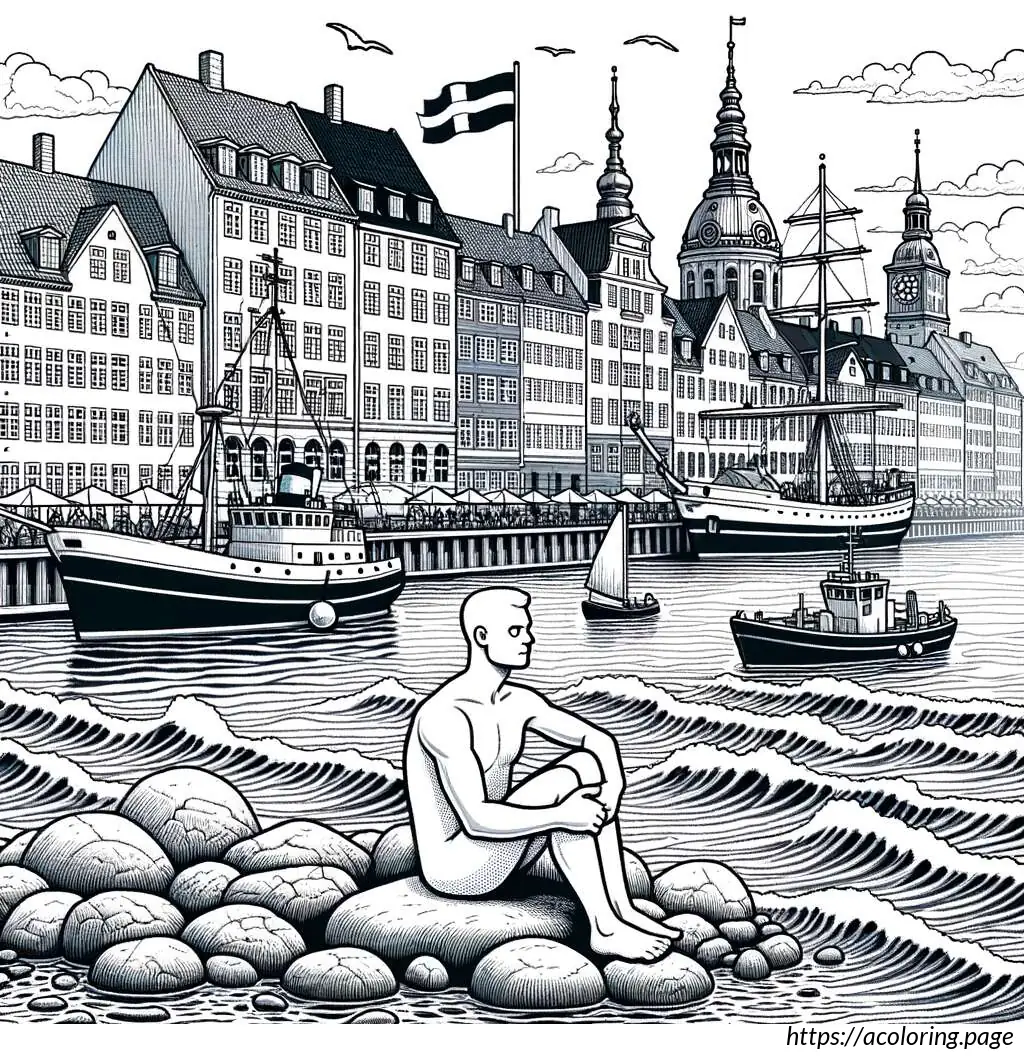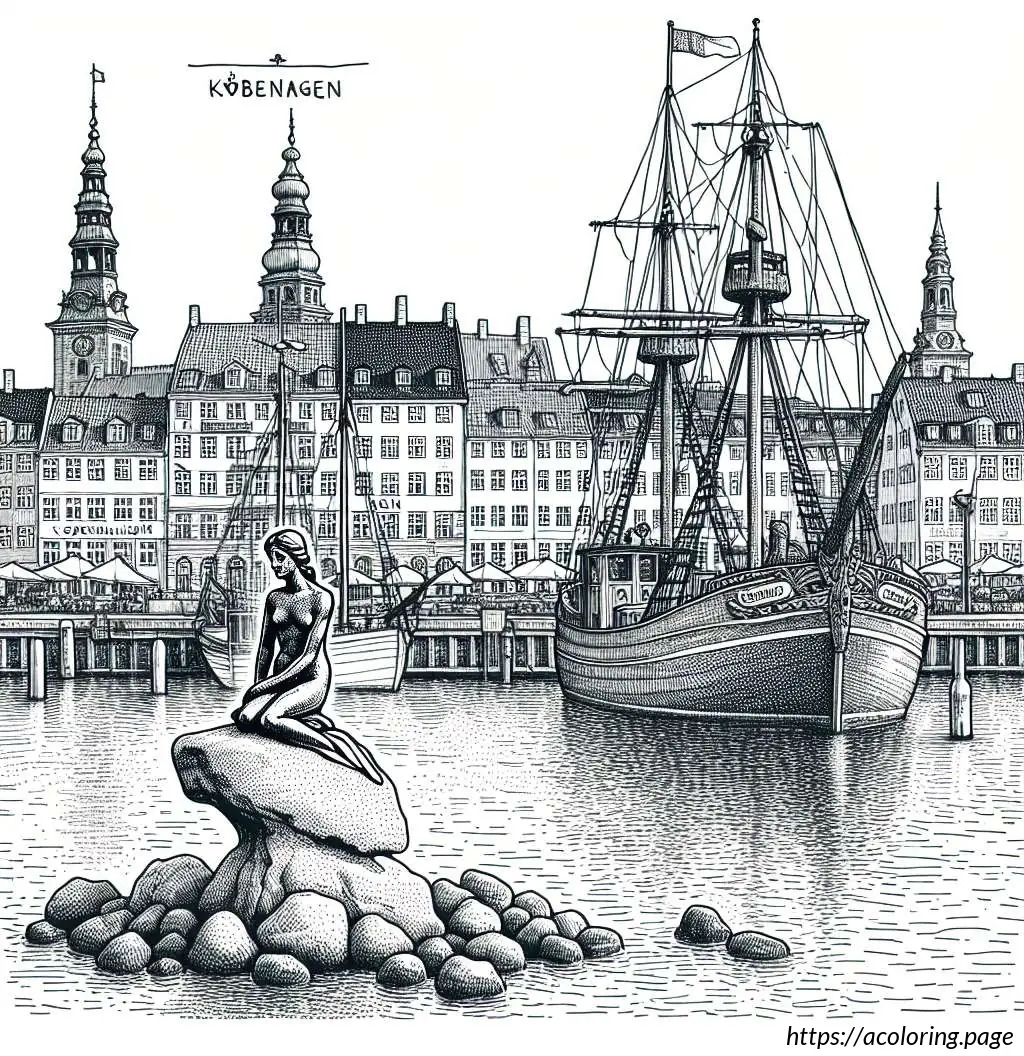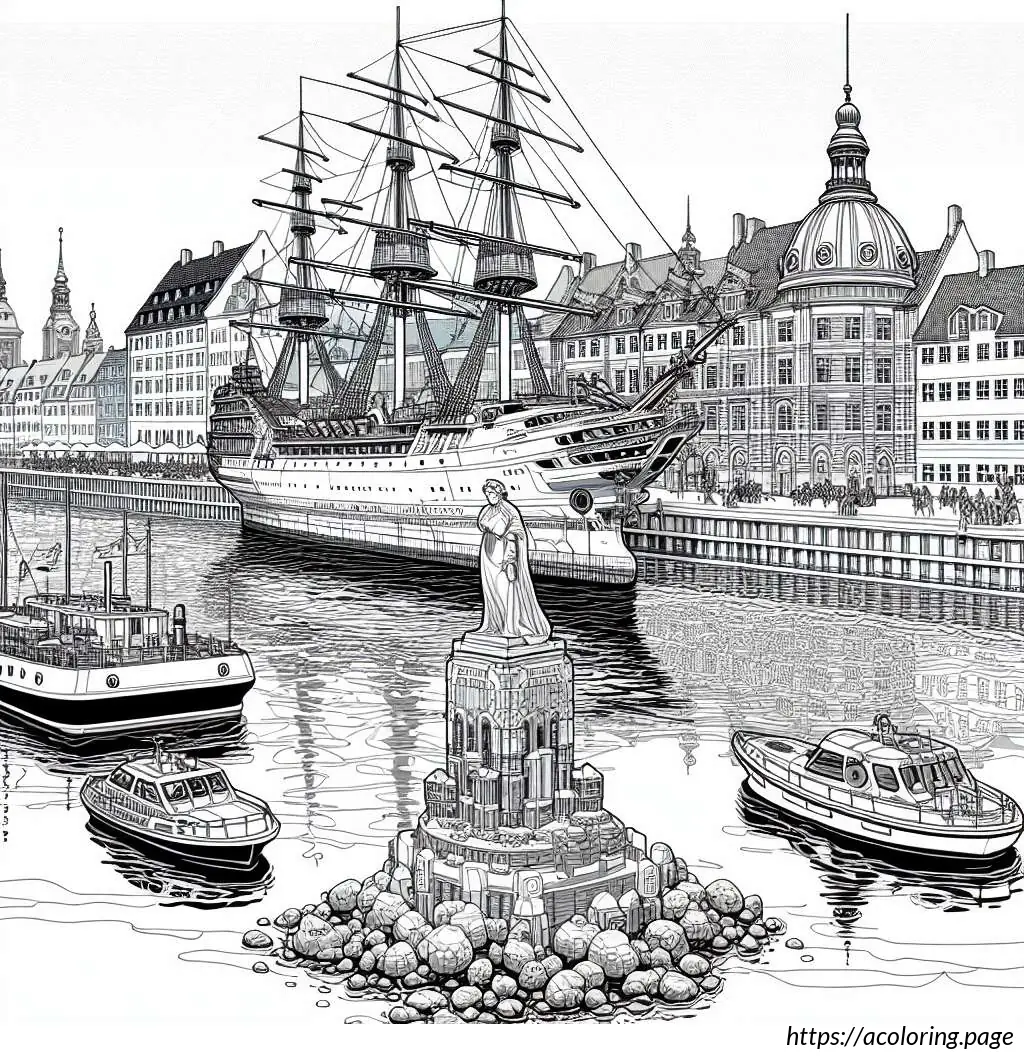 Environment and Details: The sea in front of the mermaid statue and the ships, with little wave detail. Above the scene, the sky seems clear, suggested by the absence of any clouds or weather elements in the illustration.