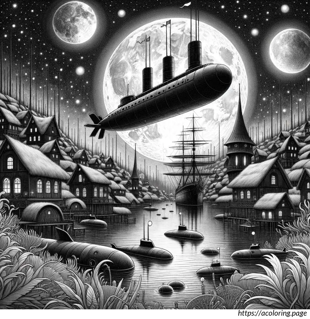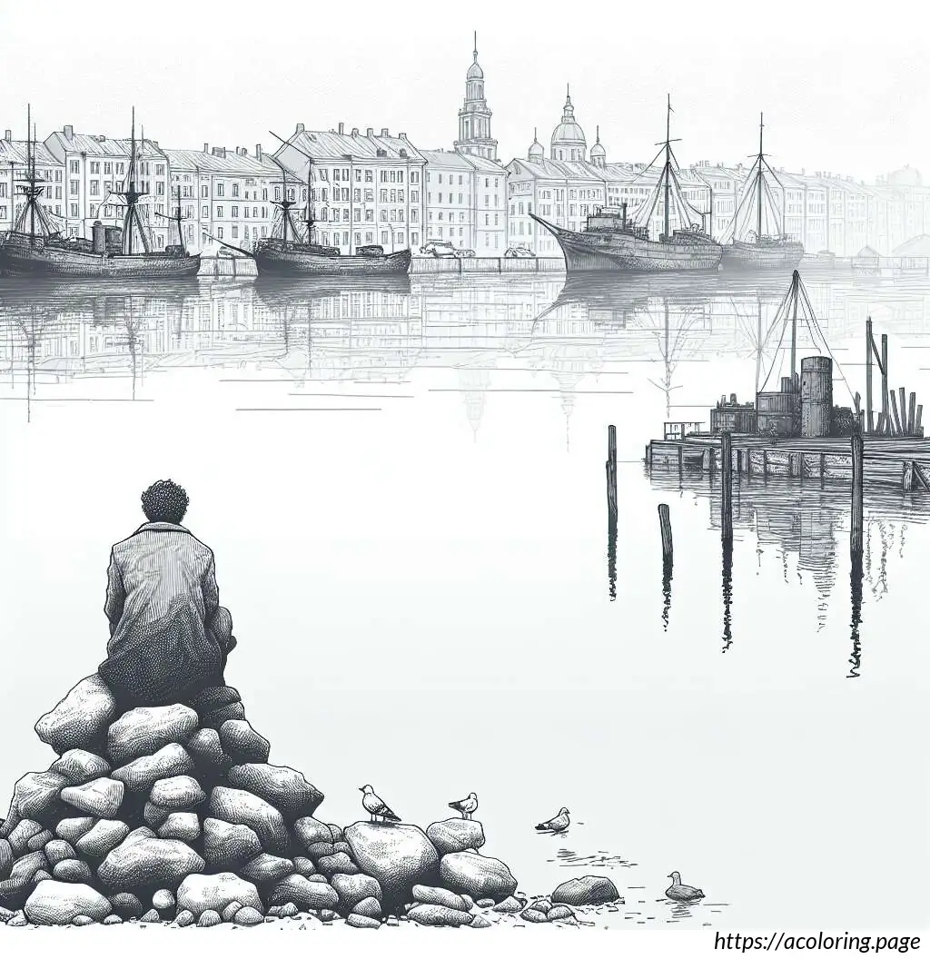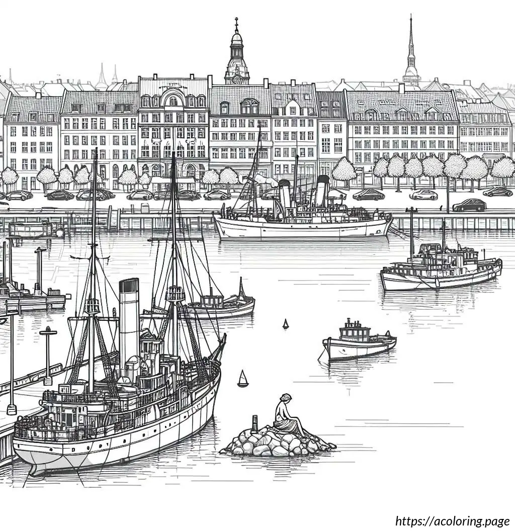Environment and Details: The sea in front of the mermaid statue and the ships, with little wave detail. Above the scene, the sky seems clear, suggested by the absence of any clouds or weather elements in the illustration.
