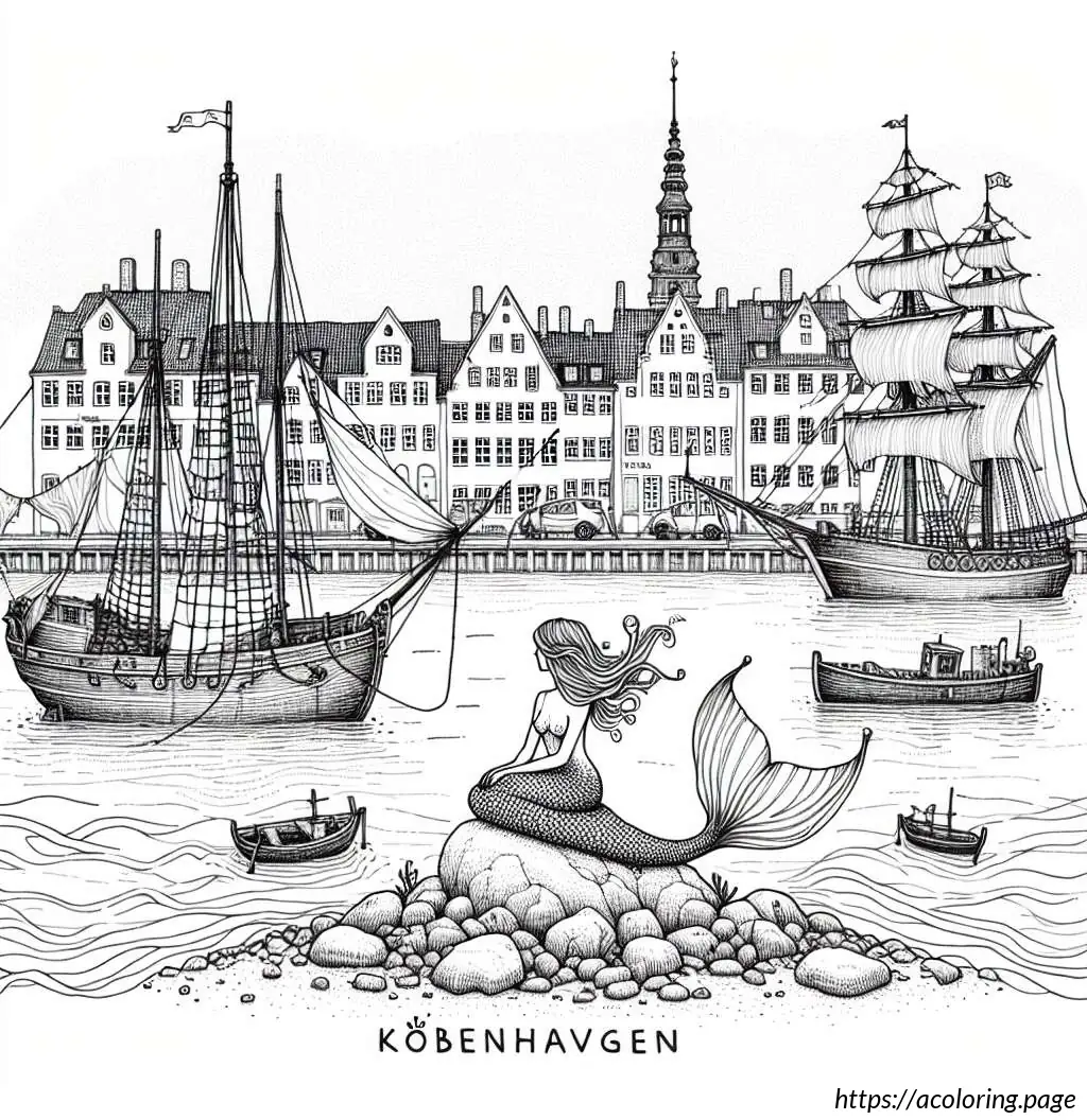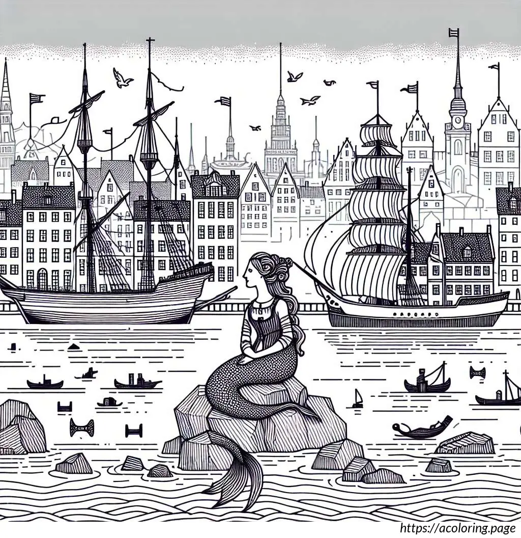 Middle ground: Several ships are illustrated. One, closest to the mermaid statue, looks like a modern vessel with what might be smoke or steam coming from a stack. There’s also a larger, old-fashioned three-masted sailing ship behind it. Flags are visible on the ships, adding a sense of location and perhaps identity.