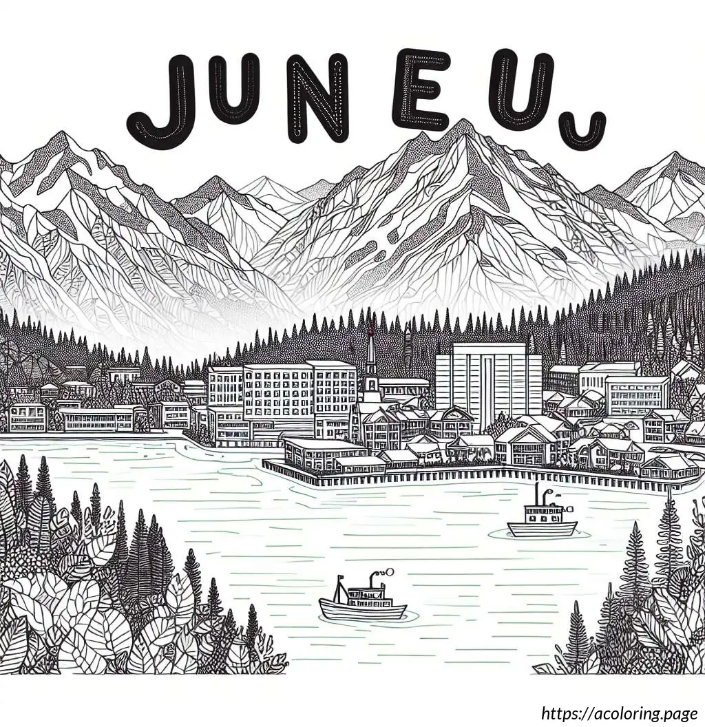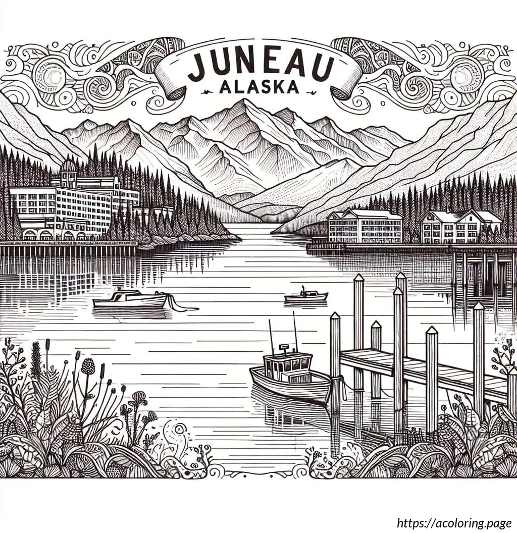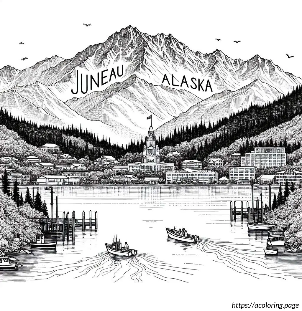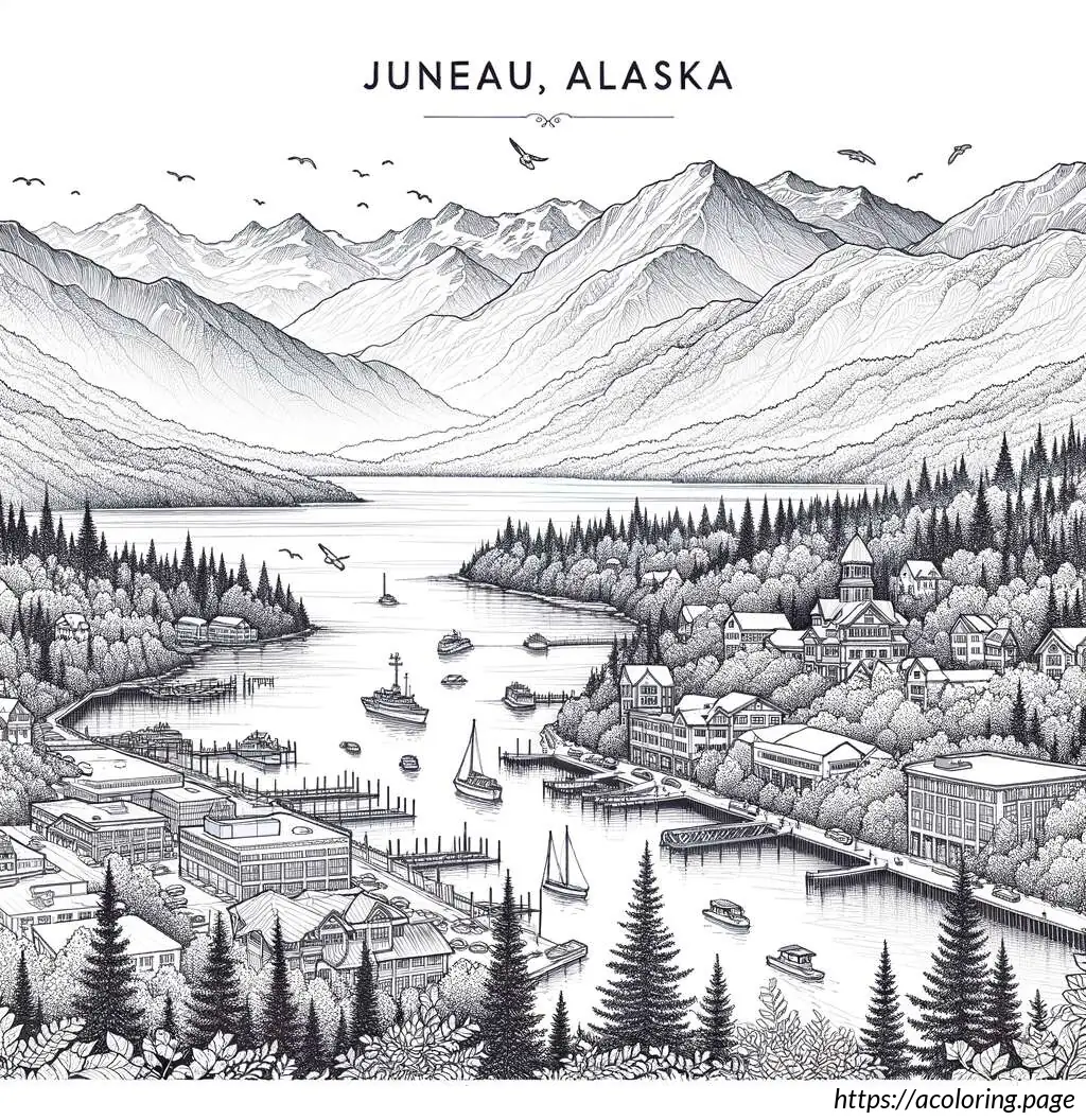 The drawing captures a blend of the natural beauty of Alaska’s rugged landscapes and the human settlement that defines Juneau. This type of illustration could be used for educational, decorative, or promotional purposes, given its detailed yet accessible artistic style.