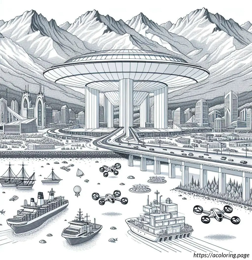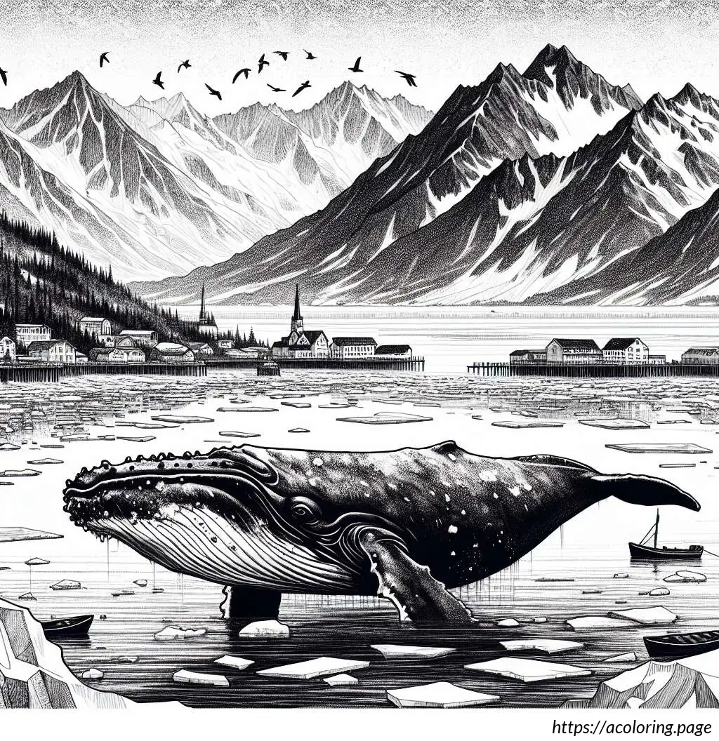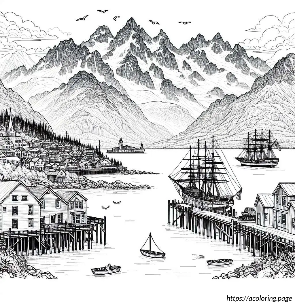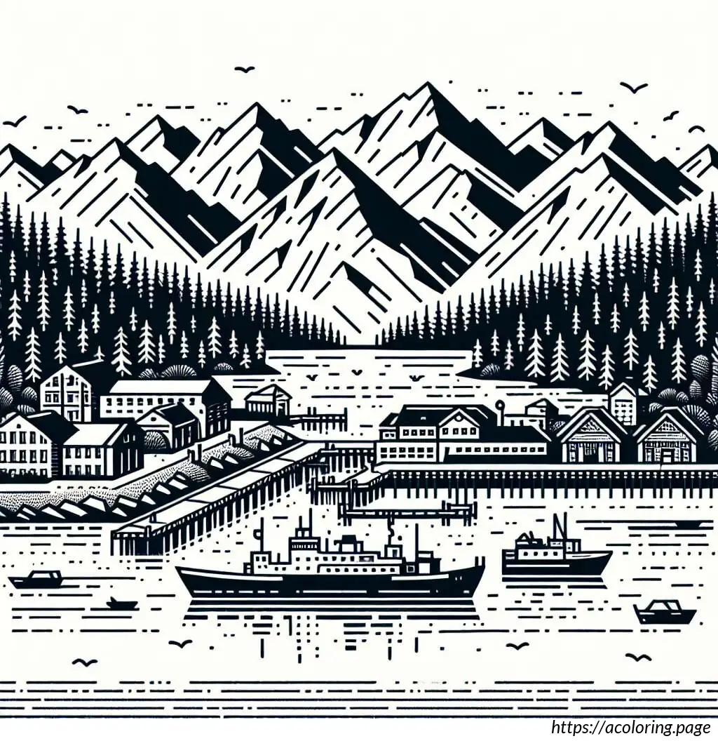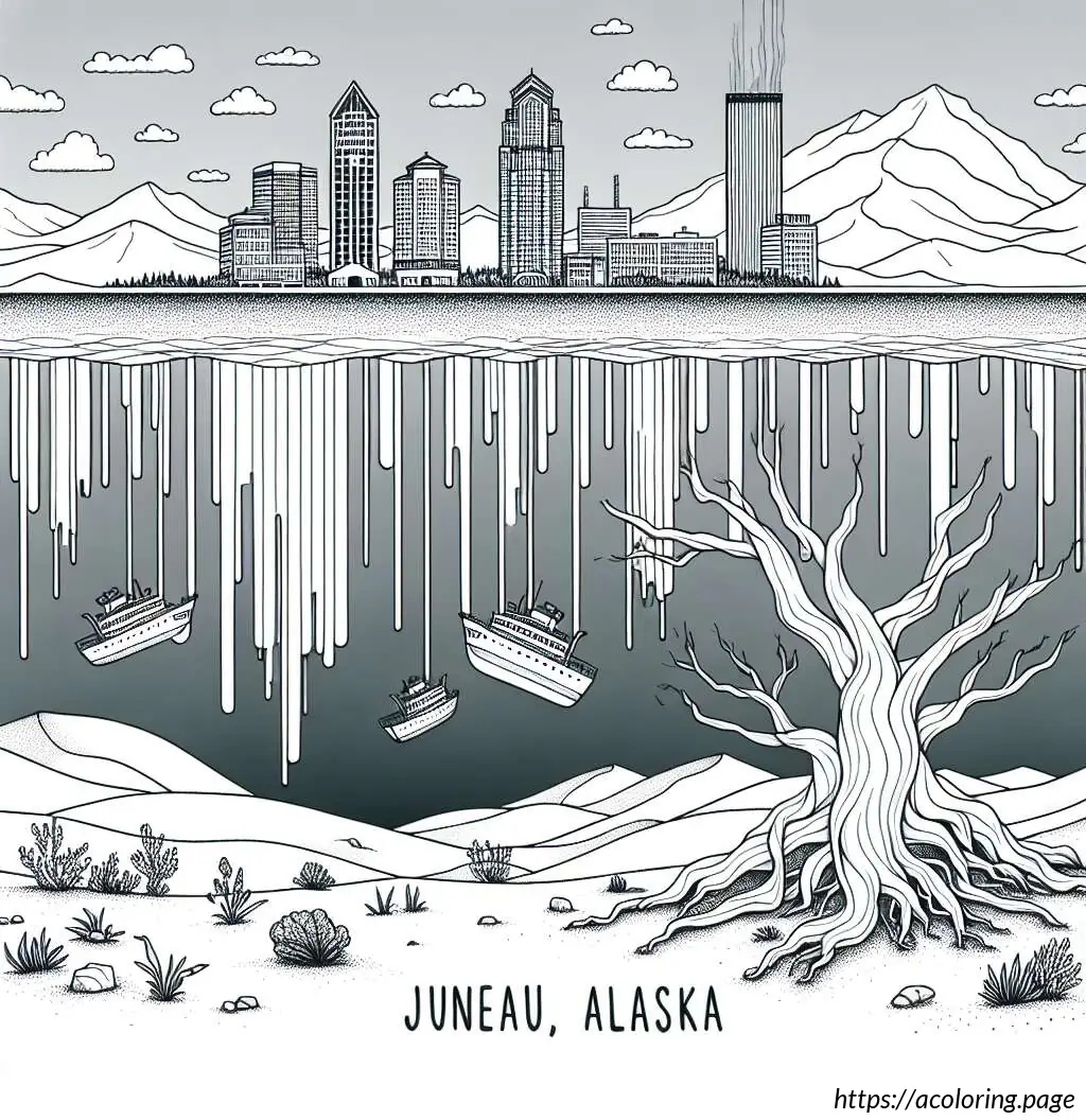 The drawing captures a blend of the natural beauty of Alaska’s rugged landscapes and the human settlement that defines Juneau. This type of illustration could be used for educational, decorative, or promotional purposes, given its detailed yet accessible artistic style.