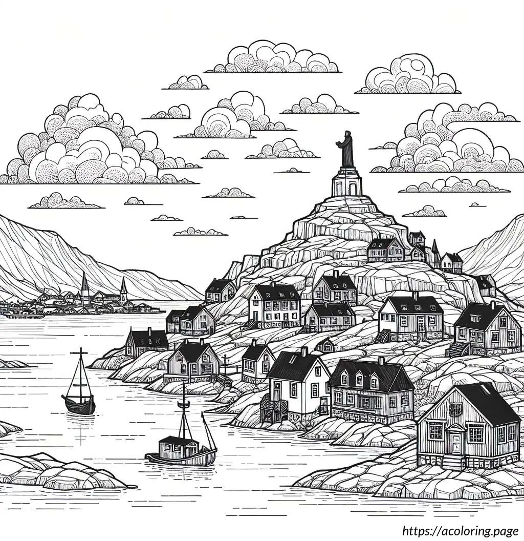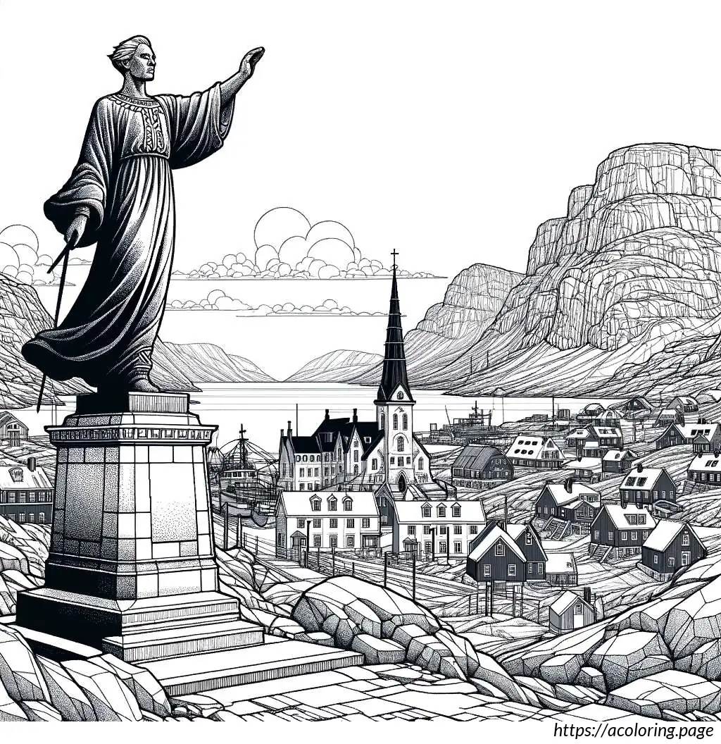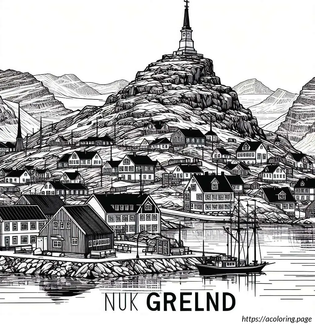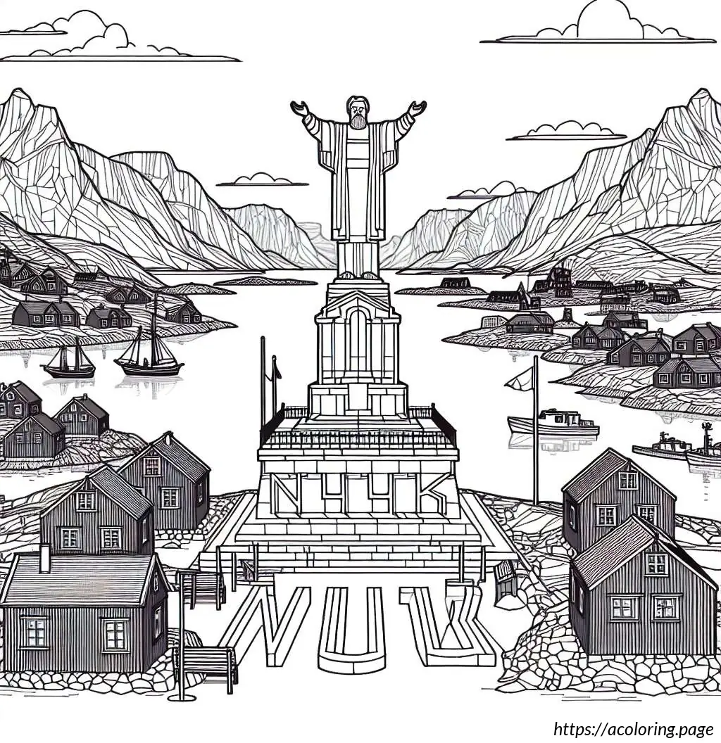 The image is a black and white illustration depicting a scenic view of Nuuk, Greenland. In the foreground, there is a statue of a figure in robes with an outstretched arm, perched on a large pedestal. Behind the statue, the landscape features various buildings, including houses and a church with a prominent spire. The terrain includes rocky hills and a few scattered clouds in the sky. Below the scene, the words “Nuuk Greenland” are written in bold, stylized lettering, appearing to emerge from the landscape itself. The style of the drawing is reminiscent of a coloring book, with clear outlines and spaces that invite coloring.