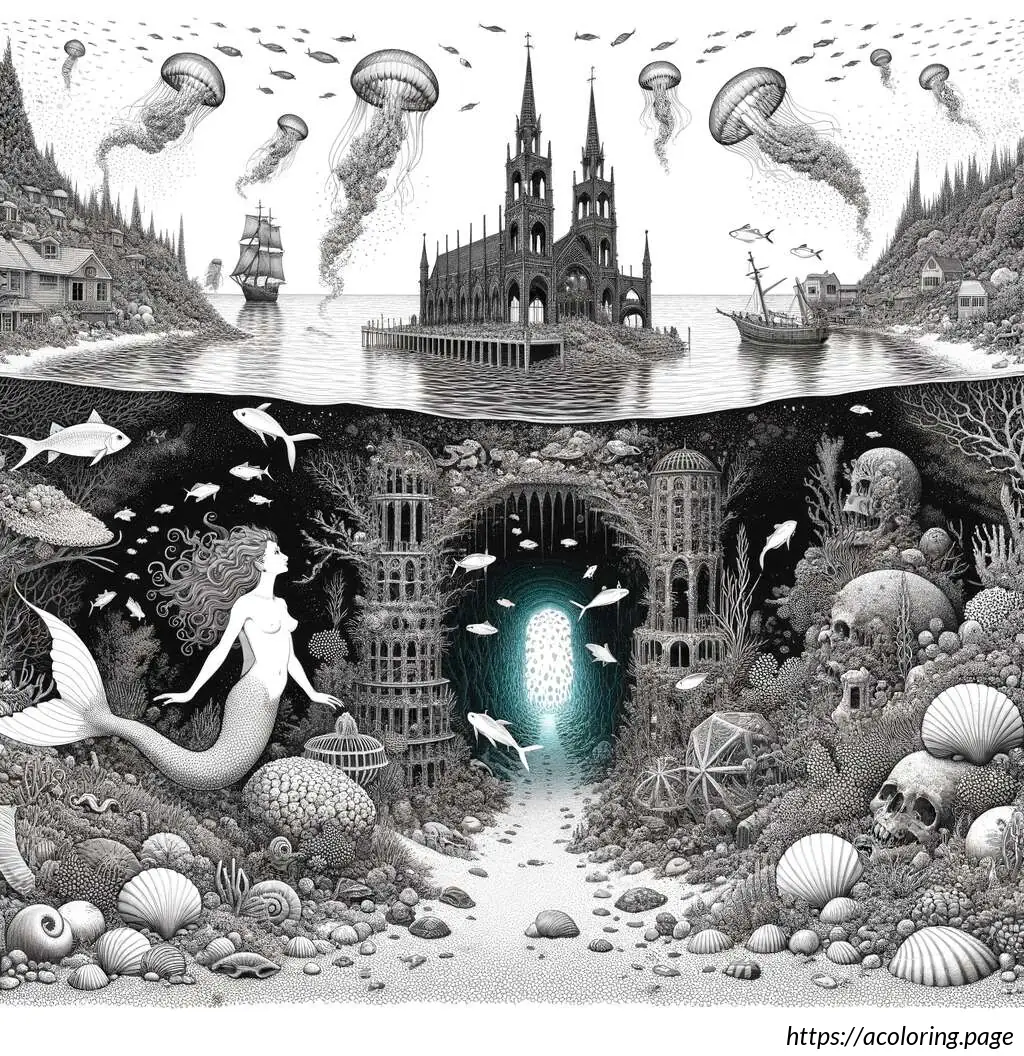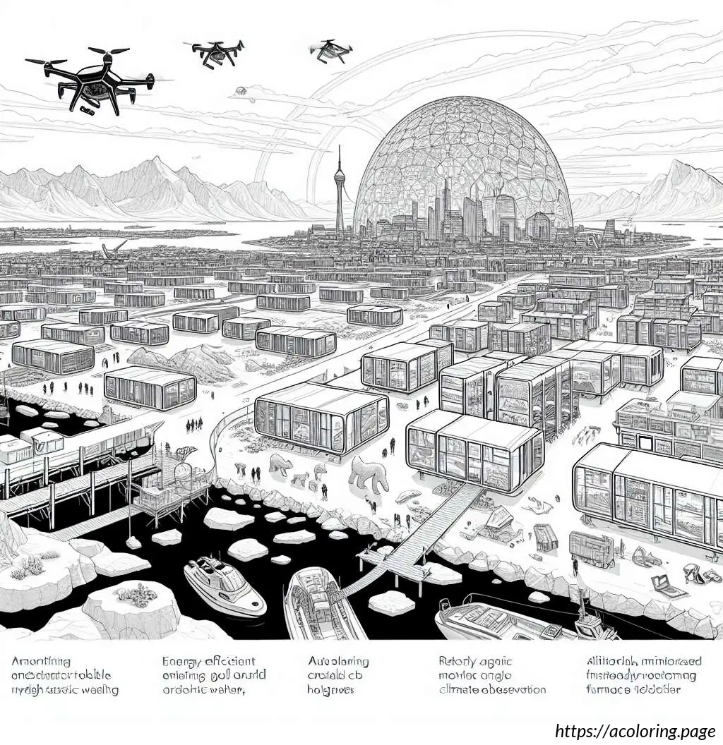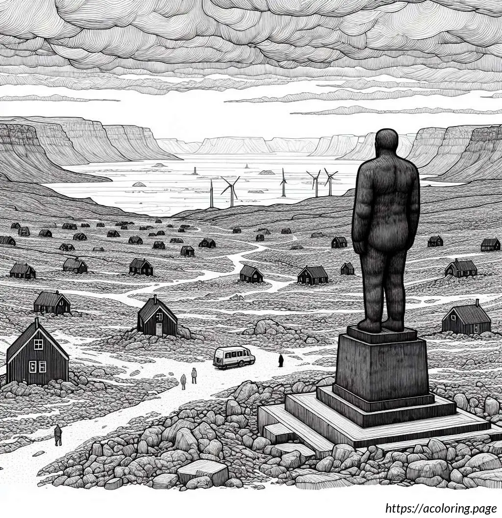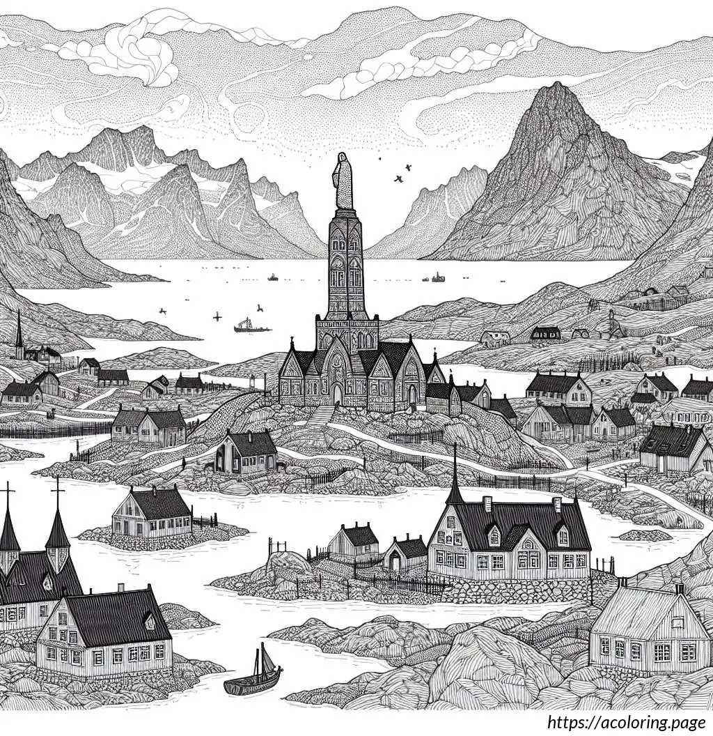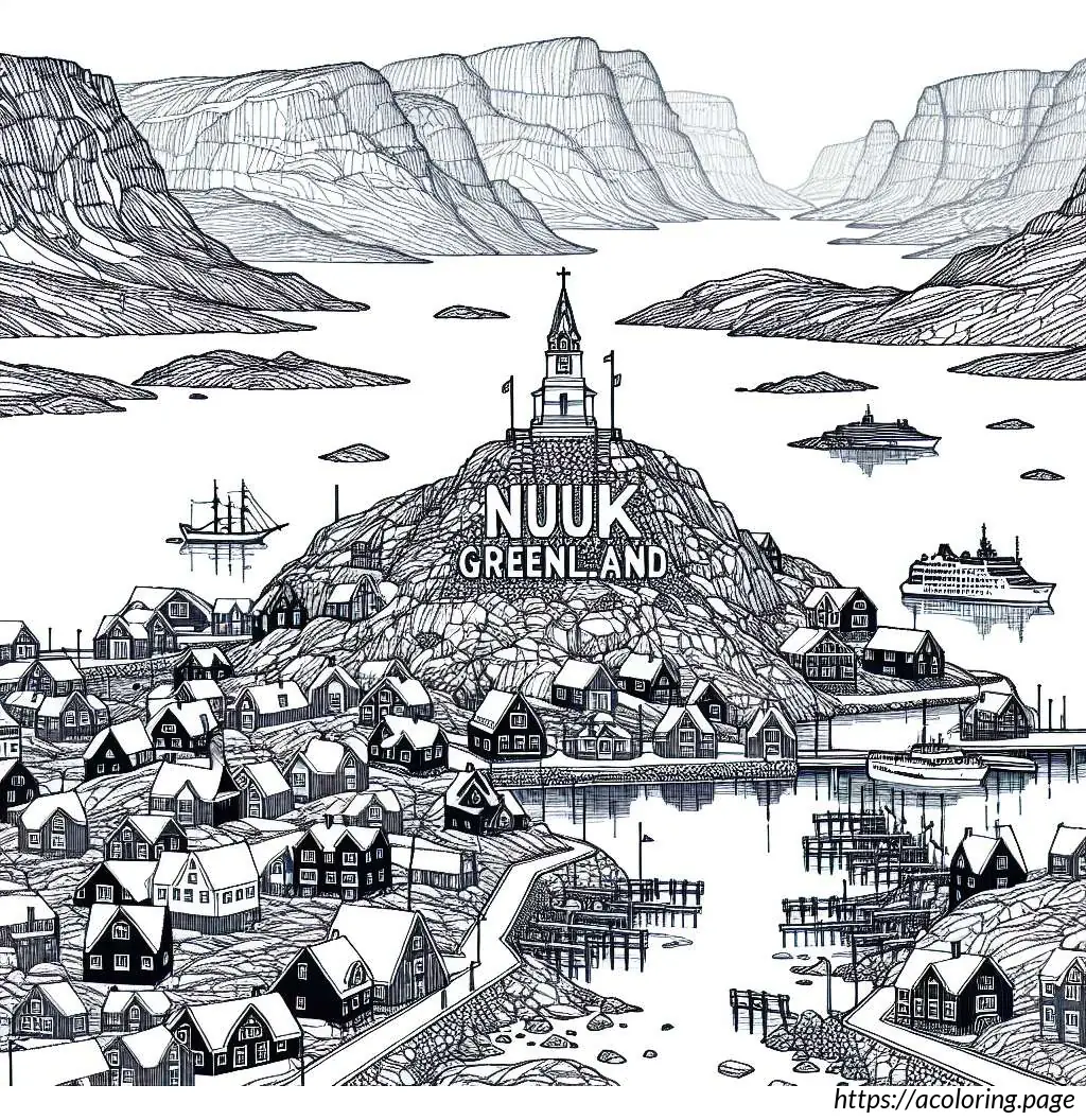 The image is a black and white illustration depicting a scenic view of Nuuk, Greenland. In the foreground, there is a statue of a figure in robes with an outstretched arm, perched on a large pedestal. Behind the statue, the landscape features various buildings, including houses and a church with a prominent spire. The terrain includes rocky hills and a few scattered clouds in the sky. Below the scene, the words “Nuuk Greenland” are written in bold, stylized lettering, appearing to emerge from the landscape itself. The style of the drawing is reminiscent of a coloring book, with clear outlines and spaces that invite coloring.