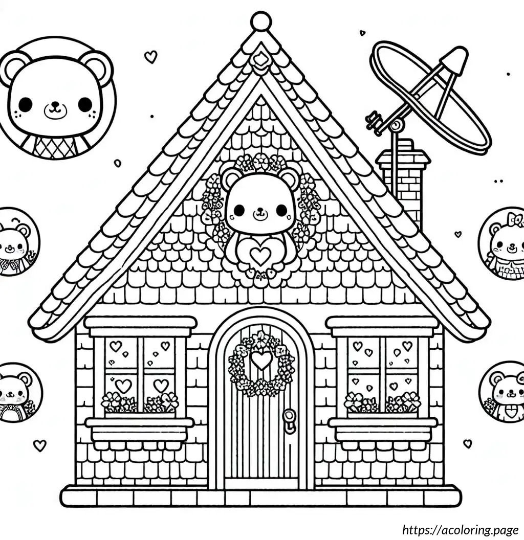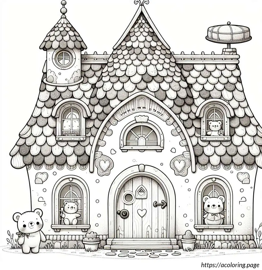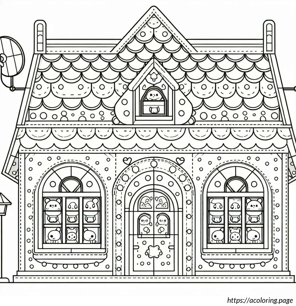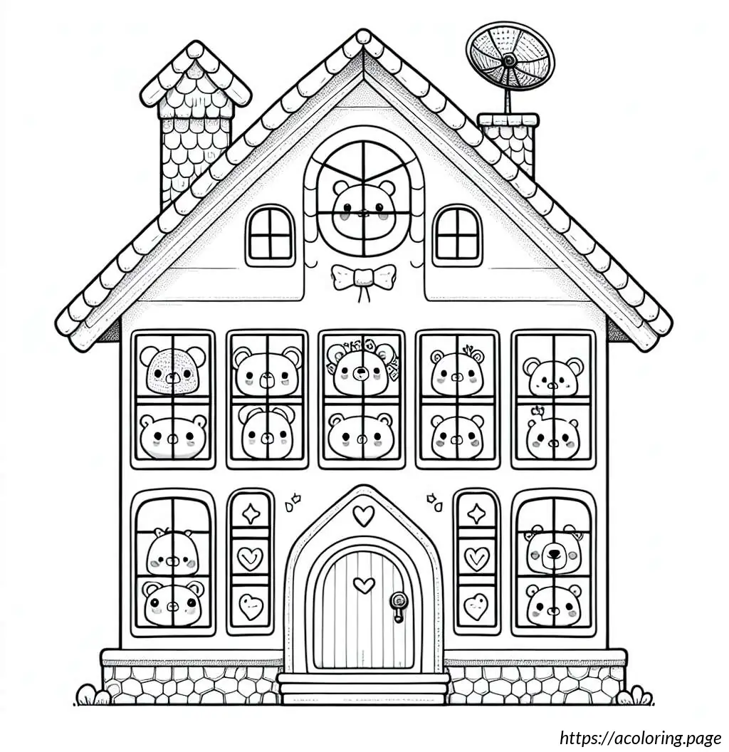 The image depicts a whimsically illustrated house with a cartoonish appearance. The house has six windows arranged in a grid pattern, each containing a playful drawing of a bear head. Each bear has a different facial expression and adornments like a bow tie, heart-shaped nose, or a small crown-like detail atop their heads. The house itself has a steeply pitched roof covered in shingles, with an antenna or a weather vane and a dish antenna at the top right corner. Below the windows, there is a rounded arched double door, suggesting an entrance. The architectural style is simplistic and stylized, emphasizing a fun and child-friendly theme. The entire drawing is outlined in black on a white background, giving it a clean and clear appearance.