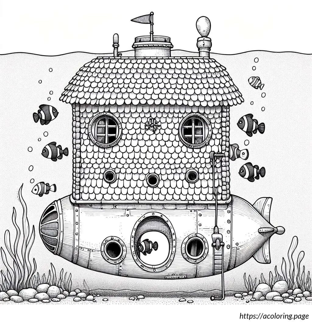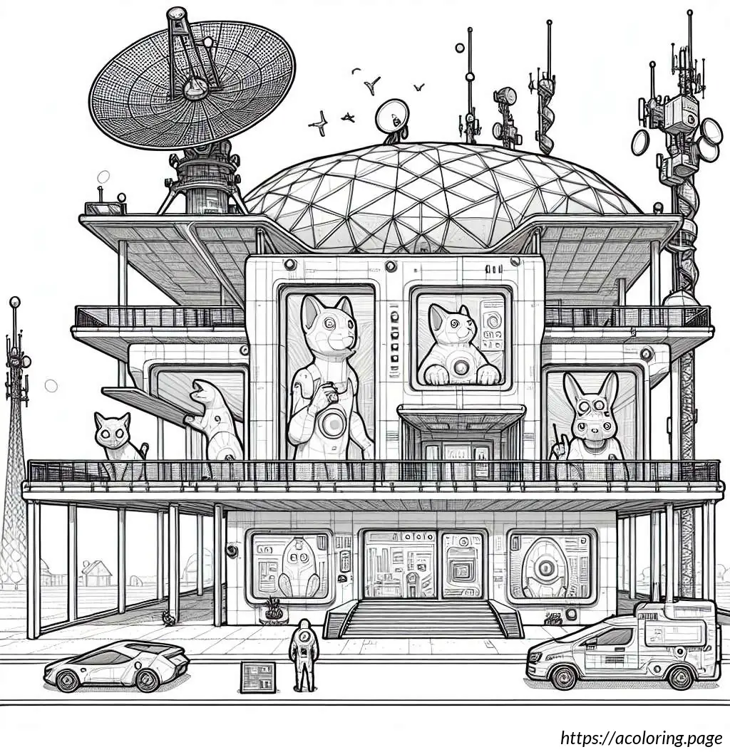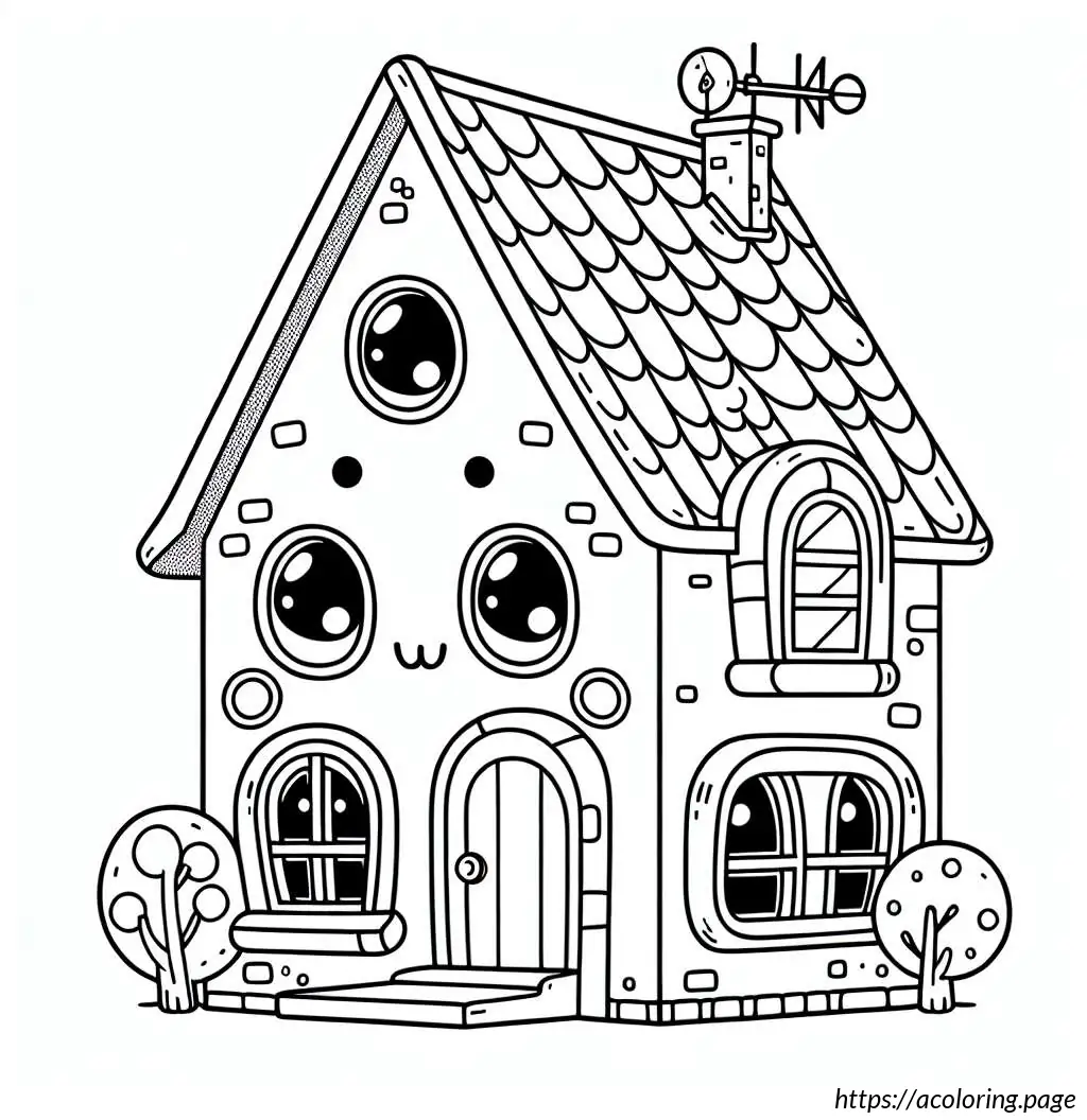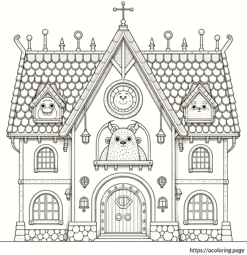 The image depicts a whimsically illustrated house with a cartoonish appearance. The house has six windows arranged in a grid pattern, each containing a playful drawing of a bear head. Each bear has a different facial expression and adornments like a bow tie, heart-shaped nose, or a small crown-like detail atop their heads. The house itself has a steeply pitched roof covered in shingles, with an antenna or a weather vane and a dish antenna at the top right corner. Below the windows, there is a rounded arched double door, suggesting an entrance. The architectural style is simplistic and stylized, emphasizing a fun and child-friendly theme. The entire drawing is outlined in black on a white background, giving it a clean and clear appearance.