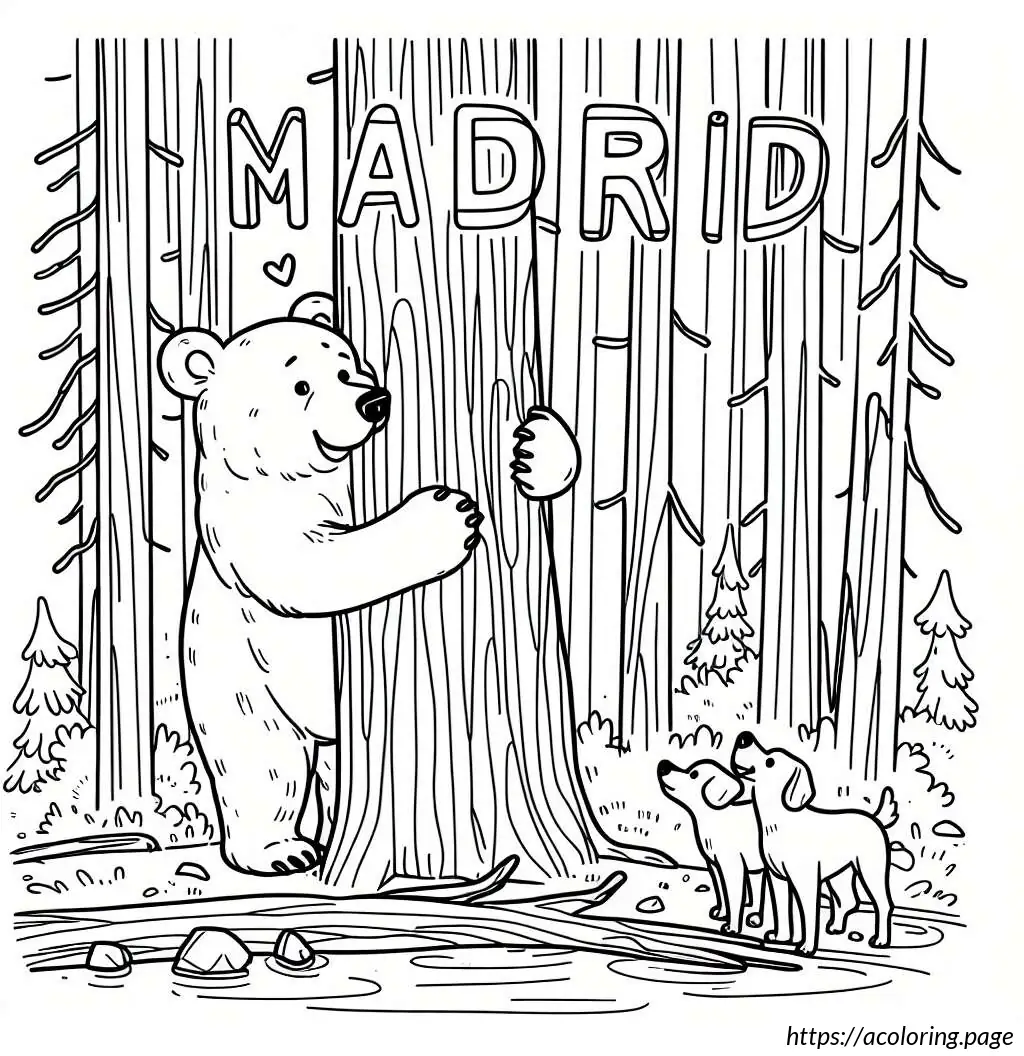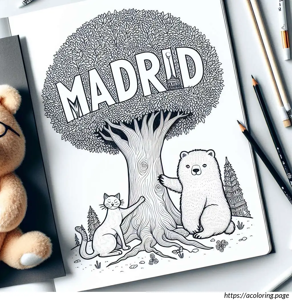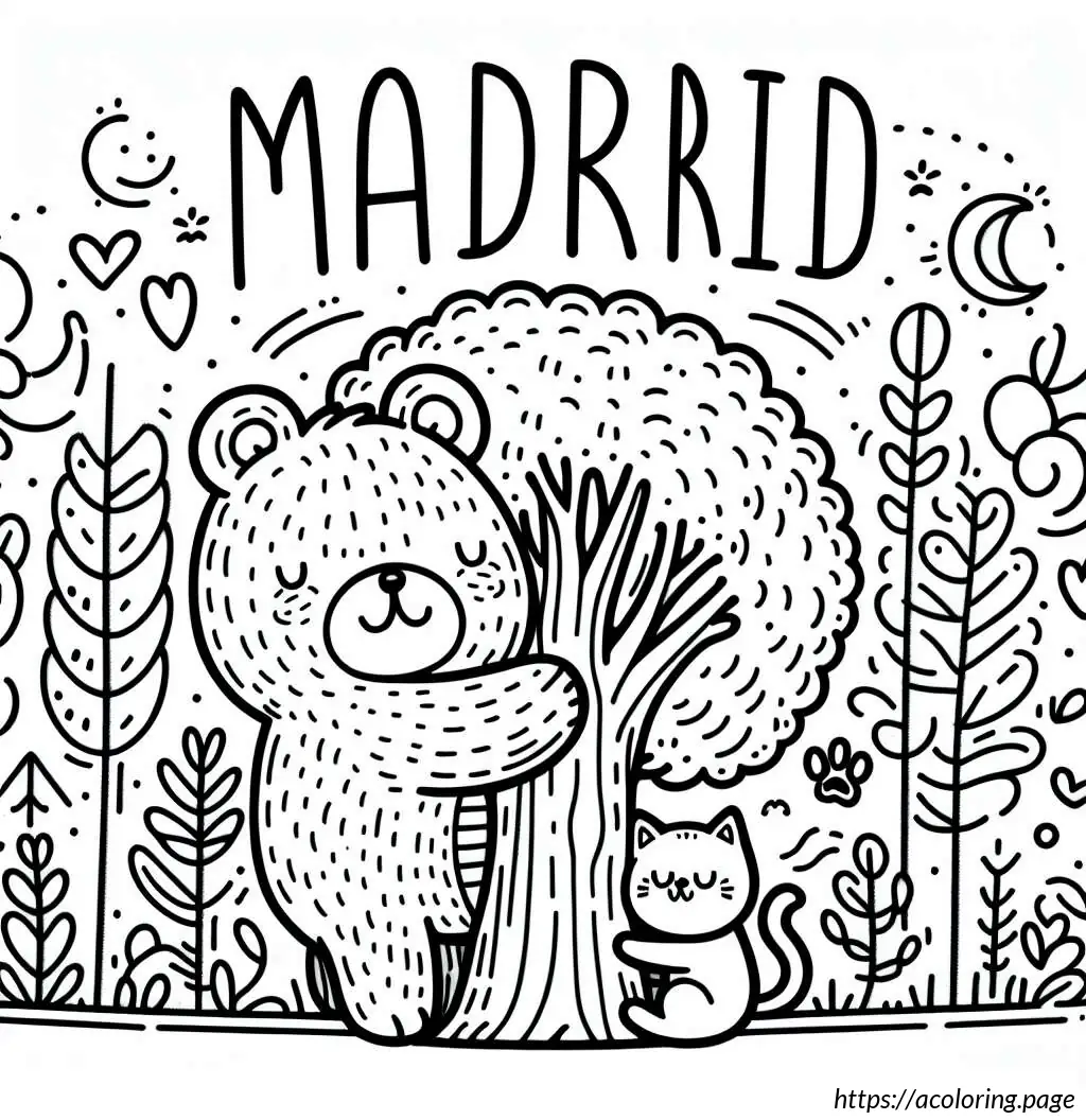 This image features a cartoon-style drawing centered around a simple depiction of a brown bear and two cats. Above the image, the word “MADRID” is written in large, slightly wobbly uppercase letters.