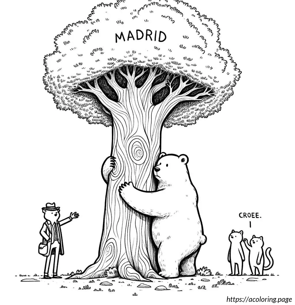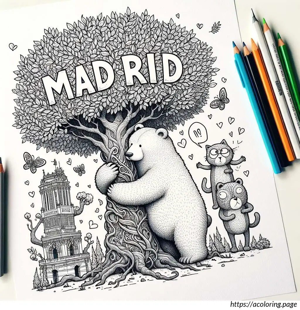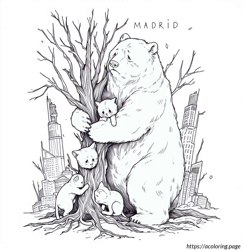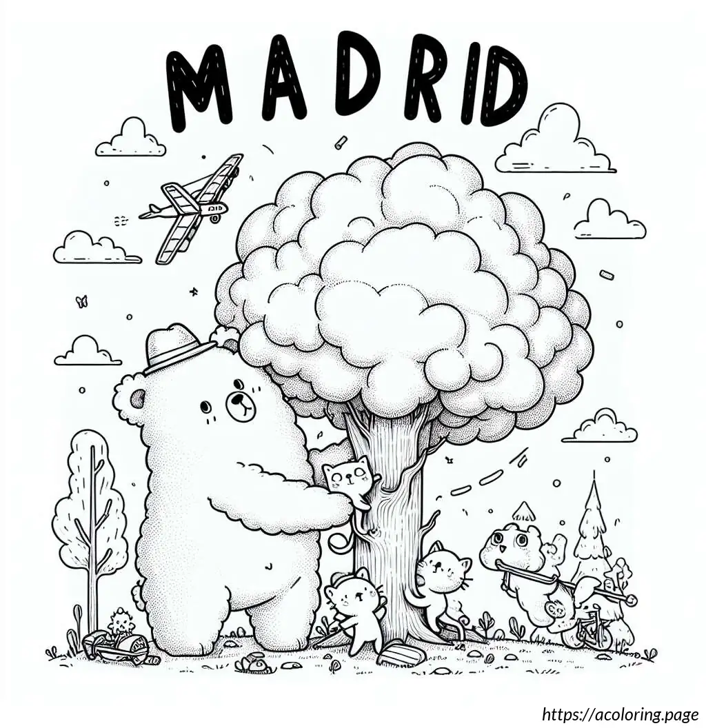 This image features a cartoon-style drawing centered around a simple depiction of a brown bear and two cats. Above the image, the word “MADRID” is written in large, slightly wobbly uppercase letters.