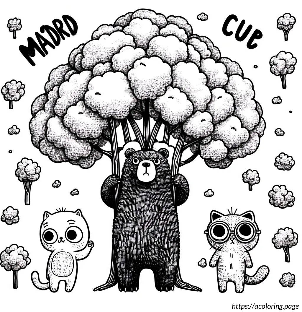 On either side of the tree’s trunk, two cats with exaggerated facial features and expressions are depicted. The cat on the left appears surprised, with a wide-open mouth and extended paws, as if startled or amazed. The cat on the right wears glasses, looks more composed, and holds onto the tree, mirroring the bear’s action but with a hint of perplexity or curiosity in its eyes. Both cats are standing on their hind legs.