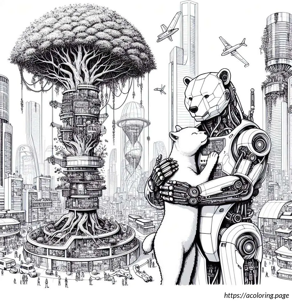 The primary focus is on the bear, which stands upright and hugs a large tree. The tree itself is shown with a thick trunk and a full, rounded canopy filled with small, fluffy clumps resembling the leaves.