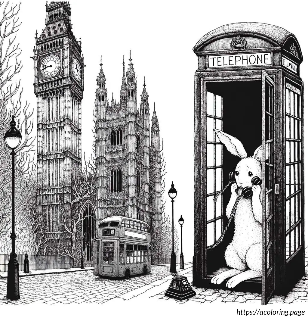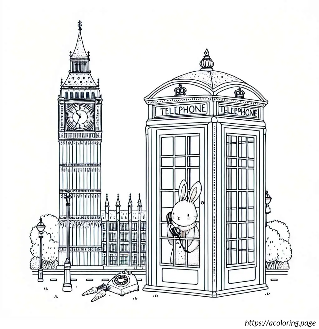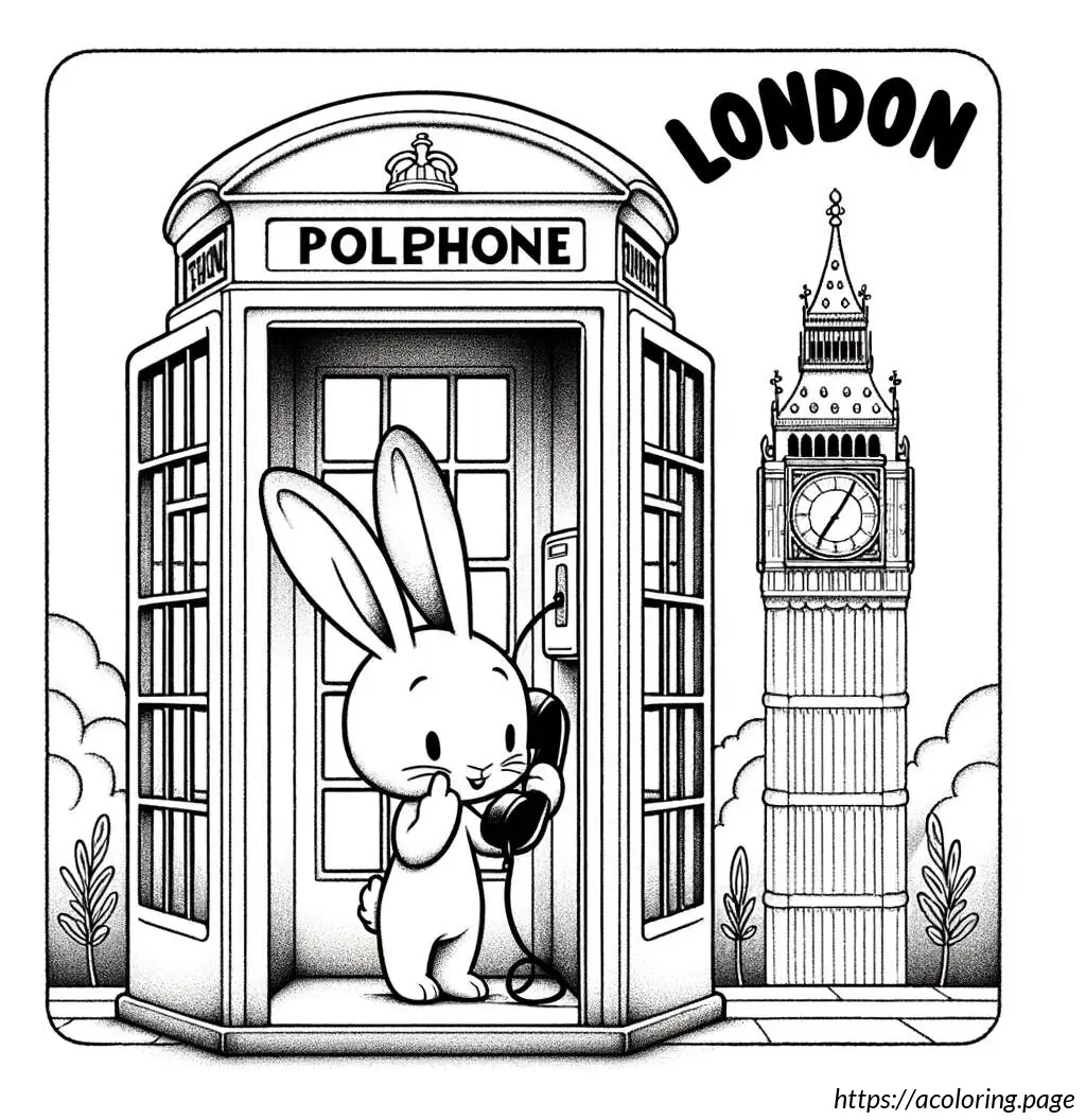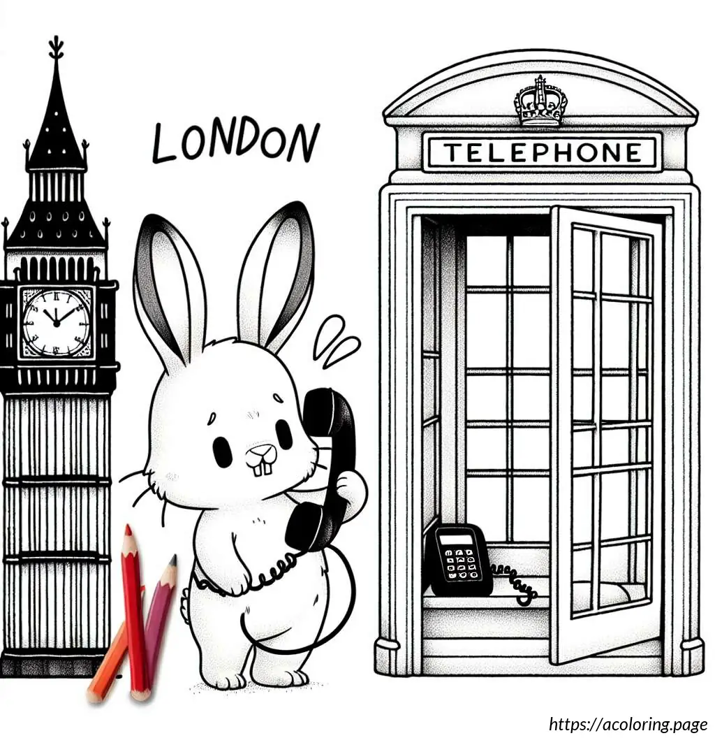 To the right, there is a classic British red telephone booth, though it is shown in white in this line drawing. Inside the telephone booth, a cartoon rabbit is depicted standing upright. The rabbit appears surprised or animated as it holds the receiver of the phone with one hand while the other hand supports itself against the edge of the booth. The rabbit has prominent front teeth, big round eyes, and tall straight ears.