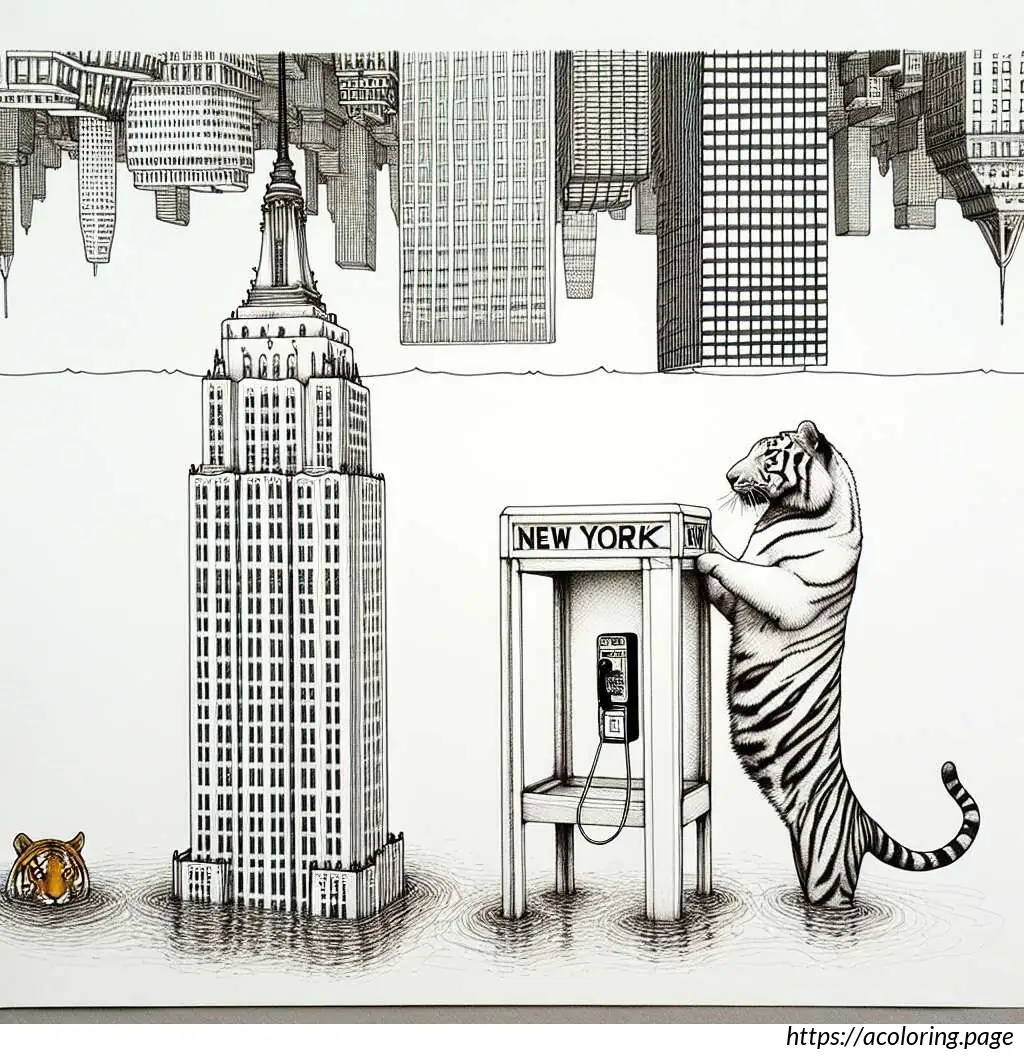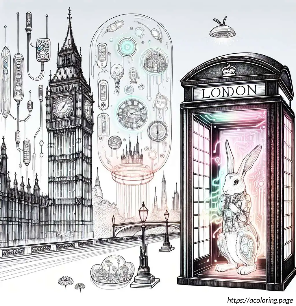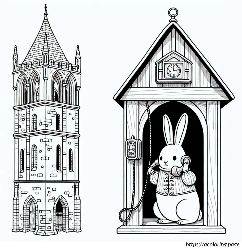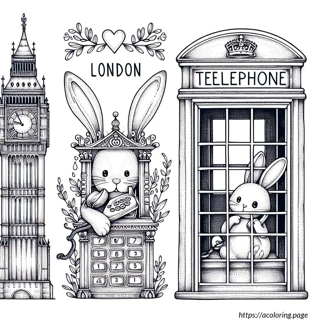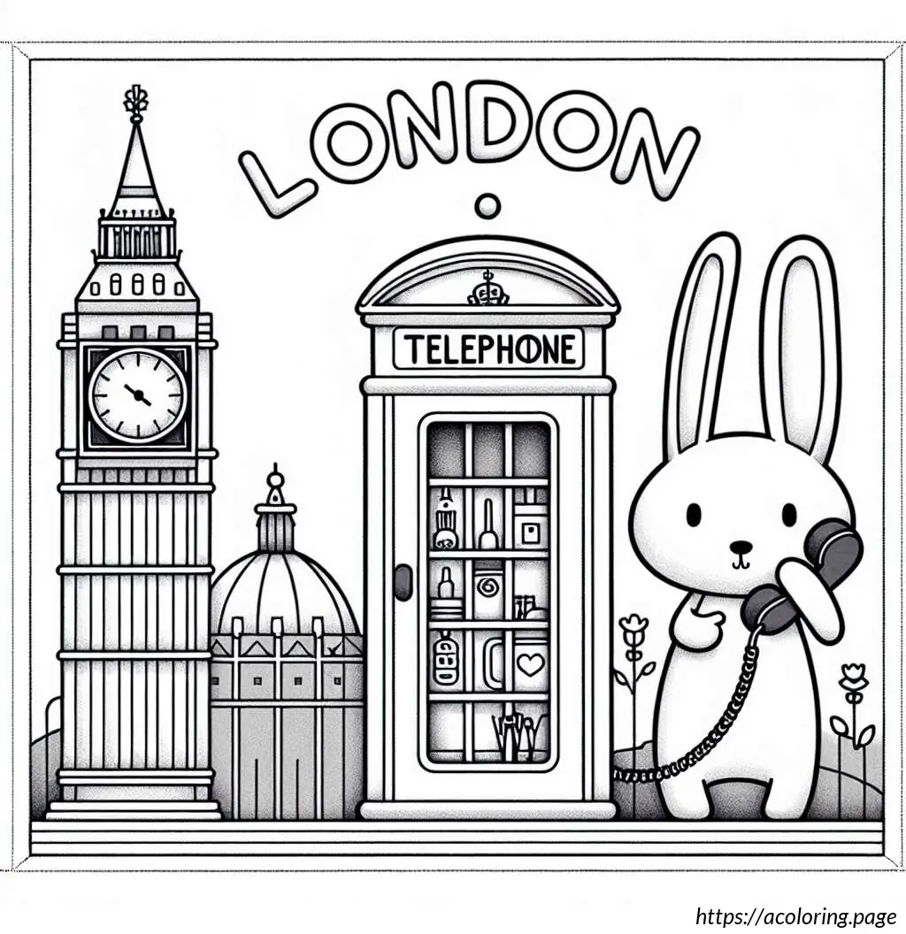 To the right, there is a classic British red telephone booth, though it is shown in white in this line drawing. Inside the telephone booth, a cartoon rabbit is depicted standing upright. The rabbit appears surprised or animated as it holds the receiver of the phone with one hand while the other hand supports itself against the edge of the booth. The rabbit has prominent front teeth, big round eyes, and tall straight ears.