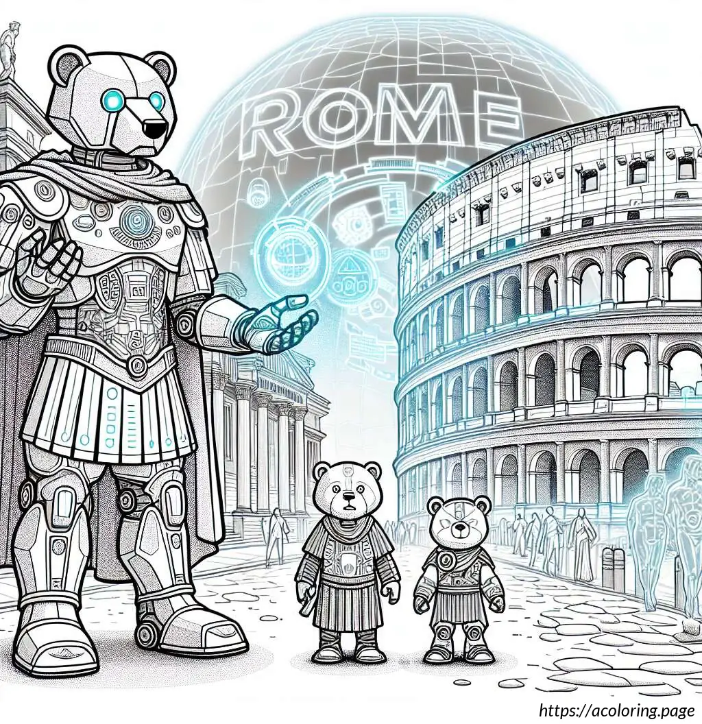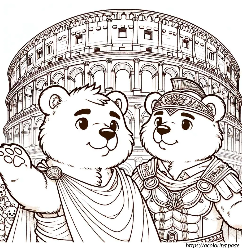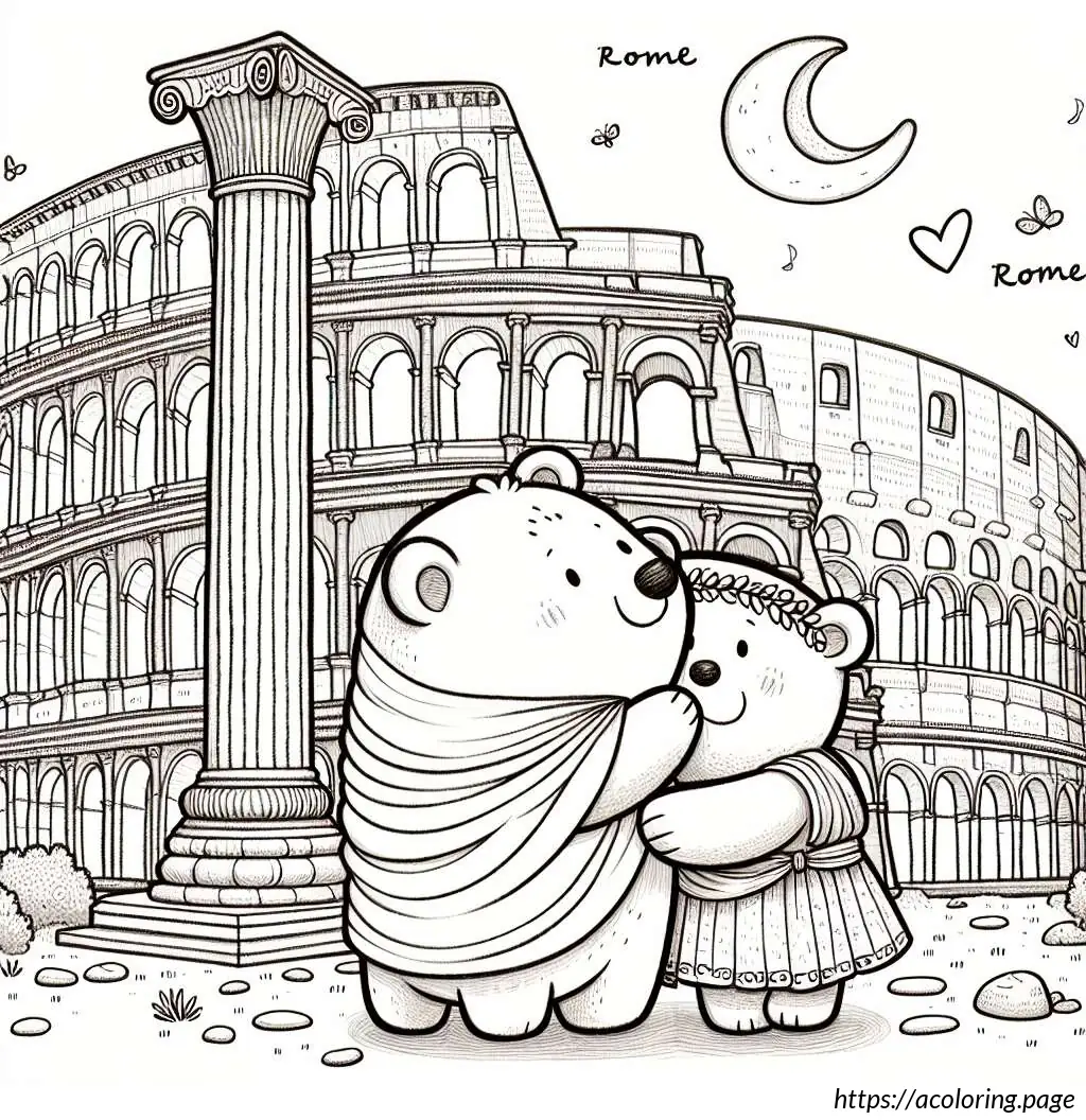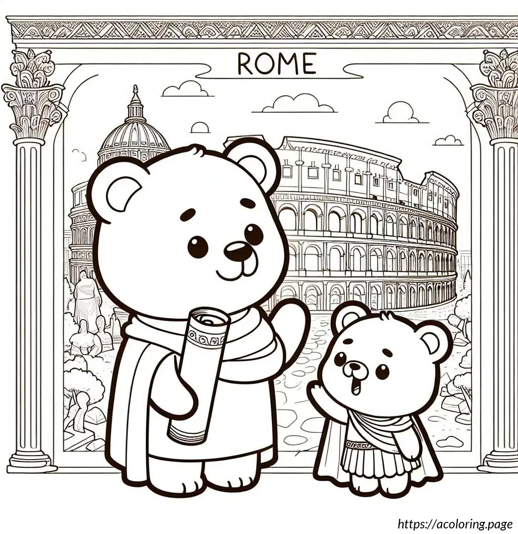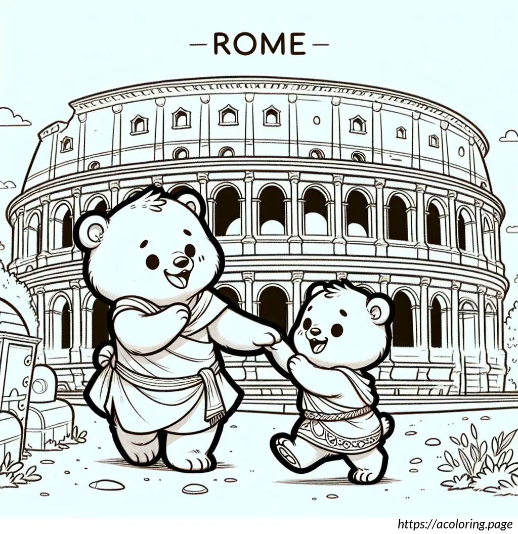 This is a playful, cartoon-style black and white drawing featuring two anthropomorphic bear characters in a setting that symbolizes Rome, as indicated by the bold, capitalized text “ROME” at the top of the image.