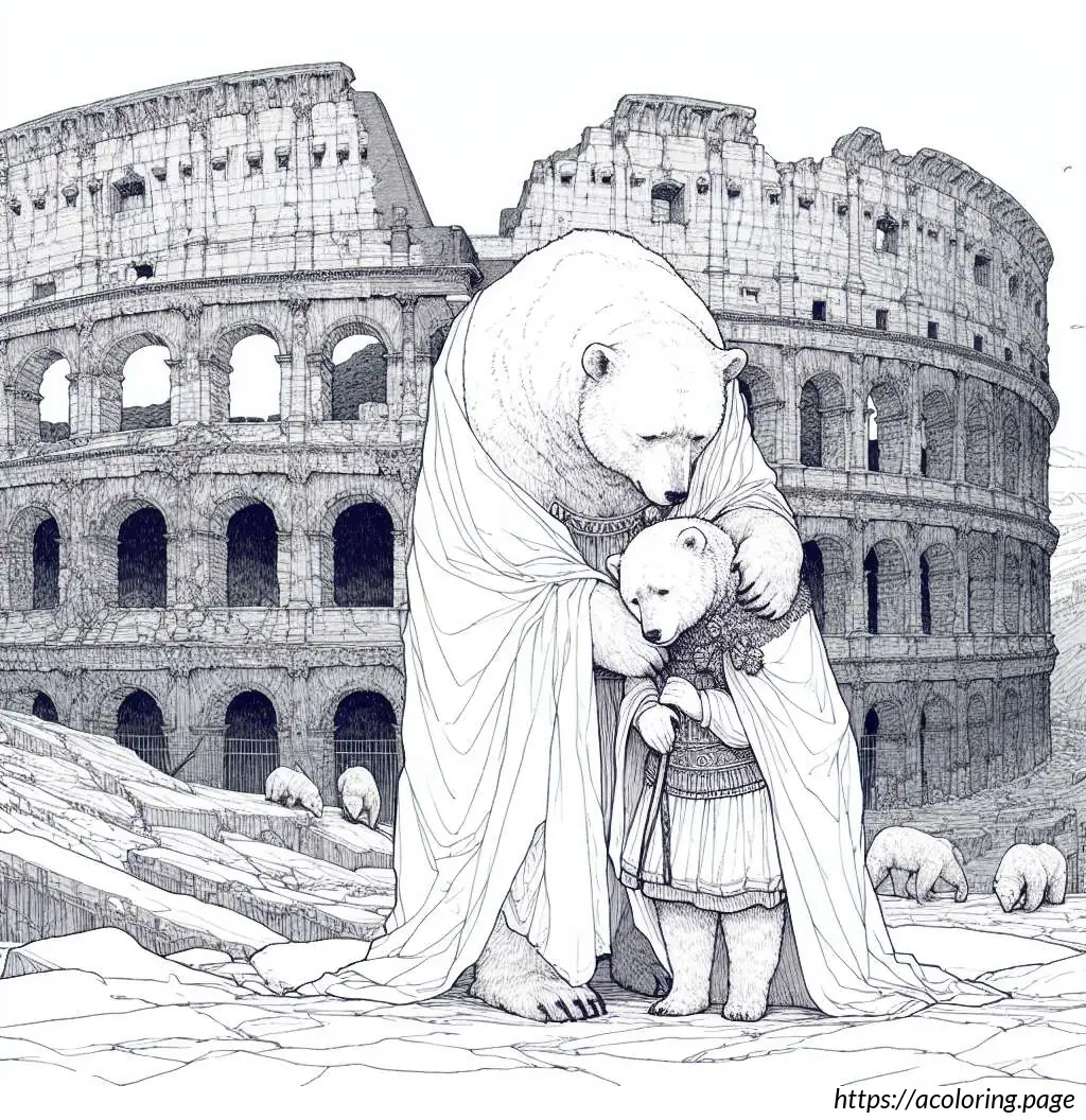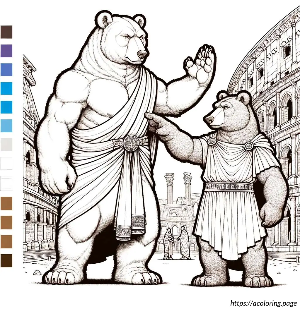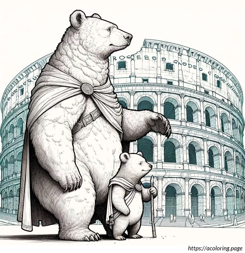 One of the bears is larger and stands on the left side of the image, looking downwards affectionately at a smaller bear, suggesting a parental relationship. The larger bear has a plain appearance and a gentle expression, characterized by large eyes and a simple smiling mouth. The smaller bear, appearing cheerful and child-like, is dressed in a traditional Roman-style toga and holds a scroll, reinforcing the Roman theme. Its expression includes wide eyes and a small, open mouth, suggesting excitement or eagerness.