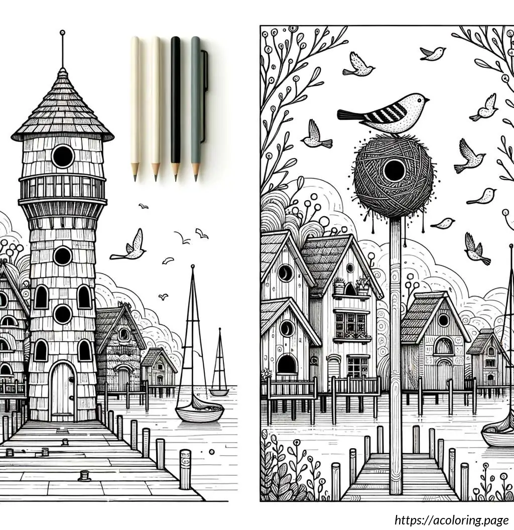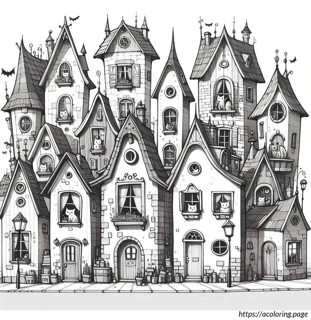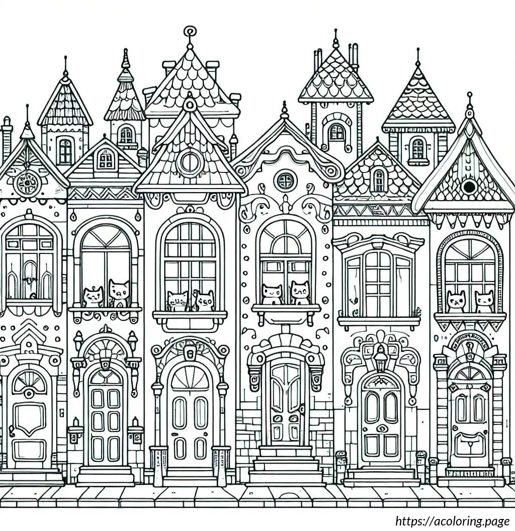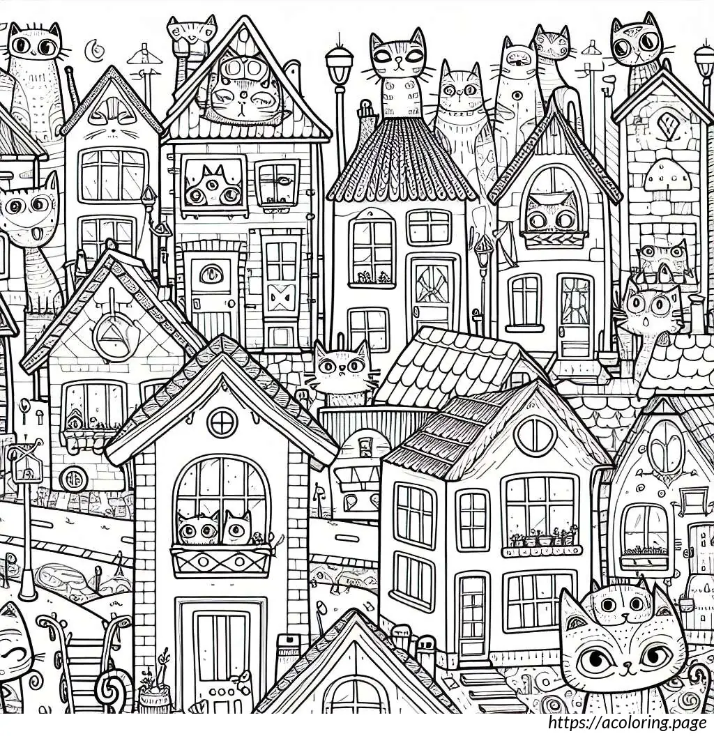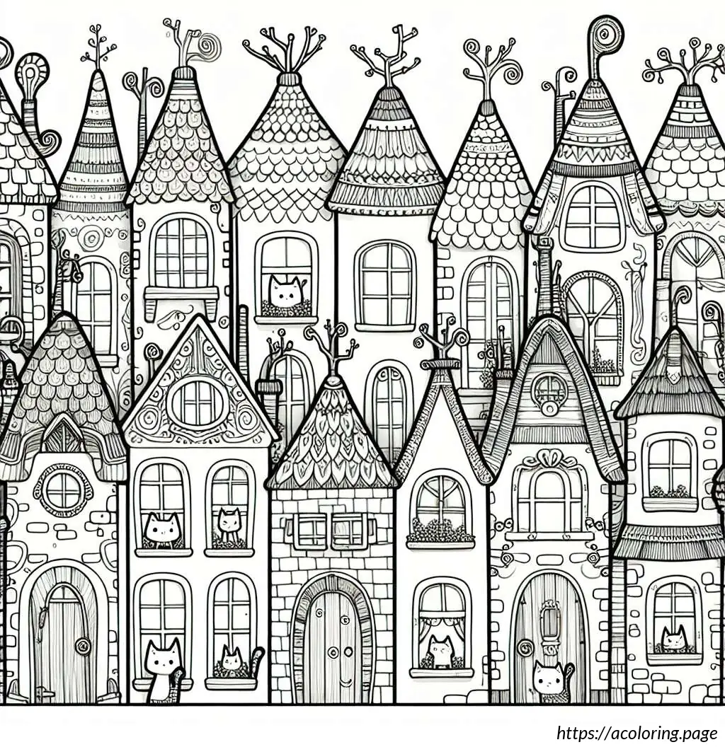 The most notable features are the two cartoon cats visible in two of the housesโ windows or openings. One is seen in a window towards the center, while another peeks out from the topmost part of a house on the left. These cats add a charming and amusing element to the drawing, giving a sense of life and whimsy to the houses.
