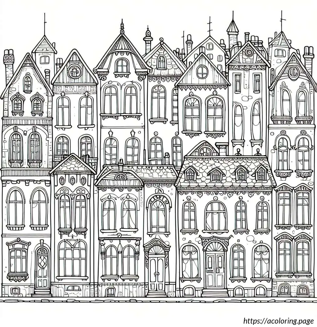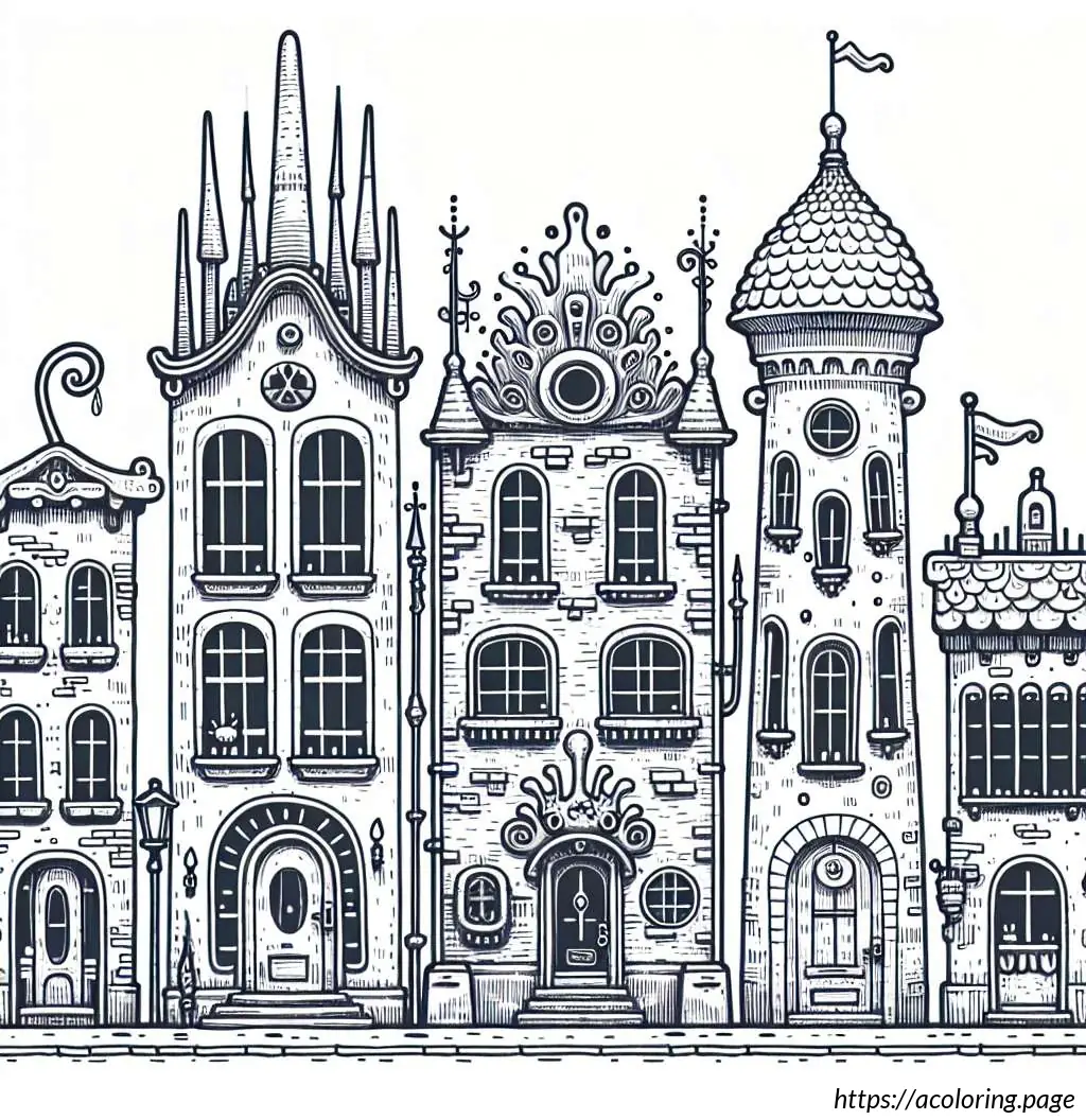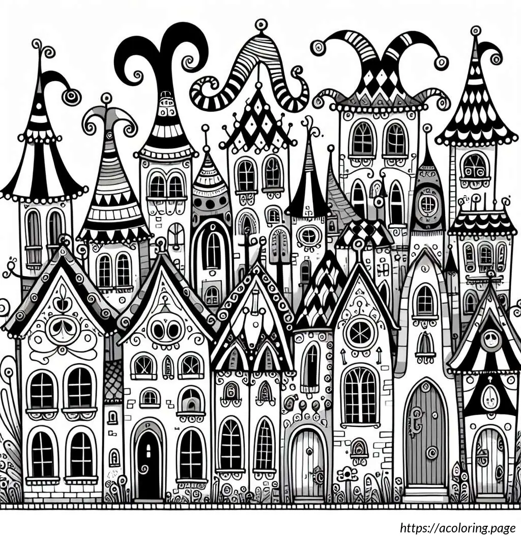 The image shows a quirky and whimsical line drawing of a row of unique cartoon-style houses. Each house has a distinct and playful architectural style, featuring various types of roofs including ones shaped like hats or with ornamental designs on top. Some roofs have decorative elements that resemble the ears and antlers of animals.