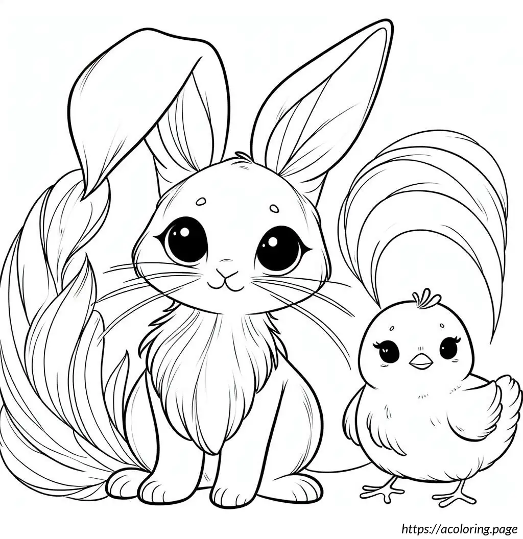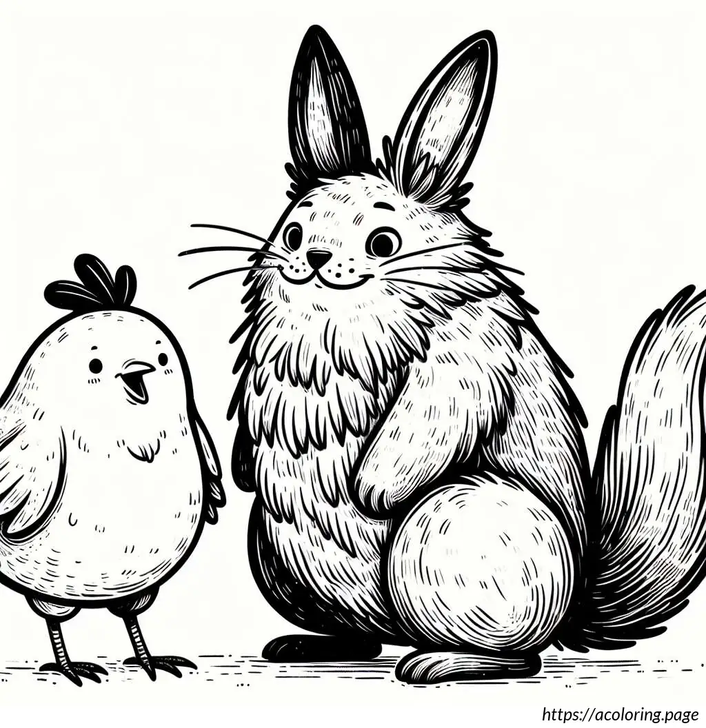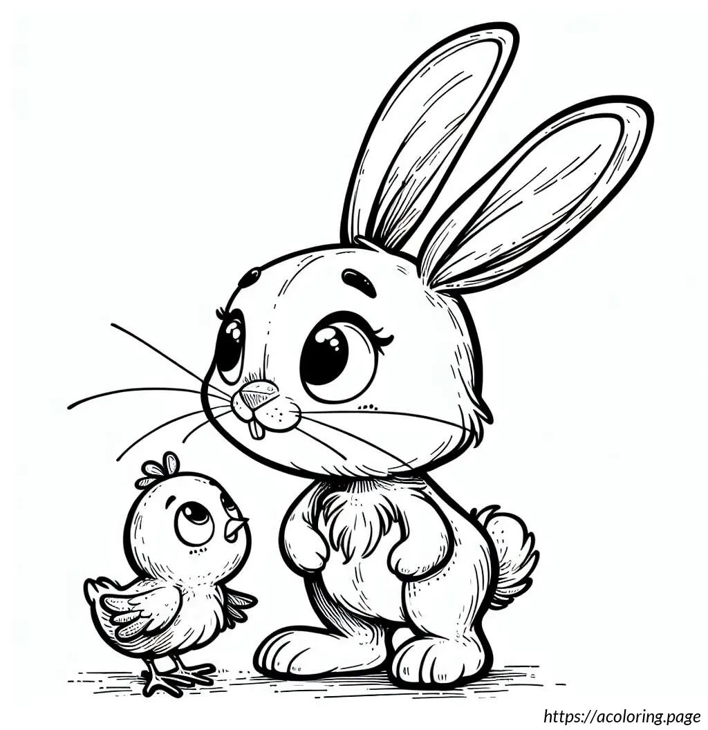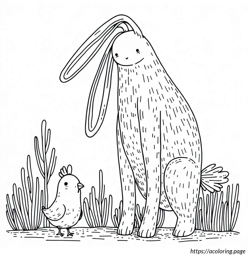 The image shows a simple and whimsically drawn cartoon of a rabbit standing upright, paired with a small chicken beside it. The rabbit has large, upright ears and is portrayed with wide eyes, a small tuft of hair on its head, and a prominent nose with whiskers. Additionally, the rabbit appears to have small arms and distinguishing features such as eyelashes and a tiny dot for a belly button. The chicken, also cartoonish, has a small comb on its head, wing feathers, and appears to be looking up at the rabbit. The style is clean, with thick black outlines, and no color—just black and white. The expressions on both characters suggest a friendly and endearing interaction.