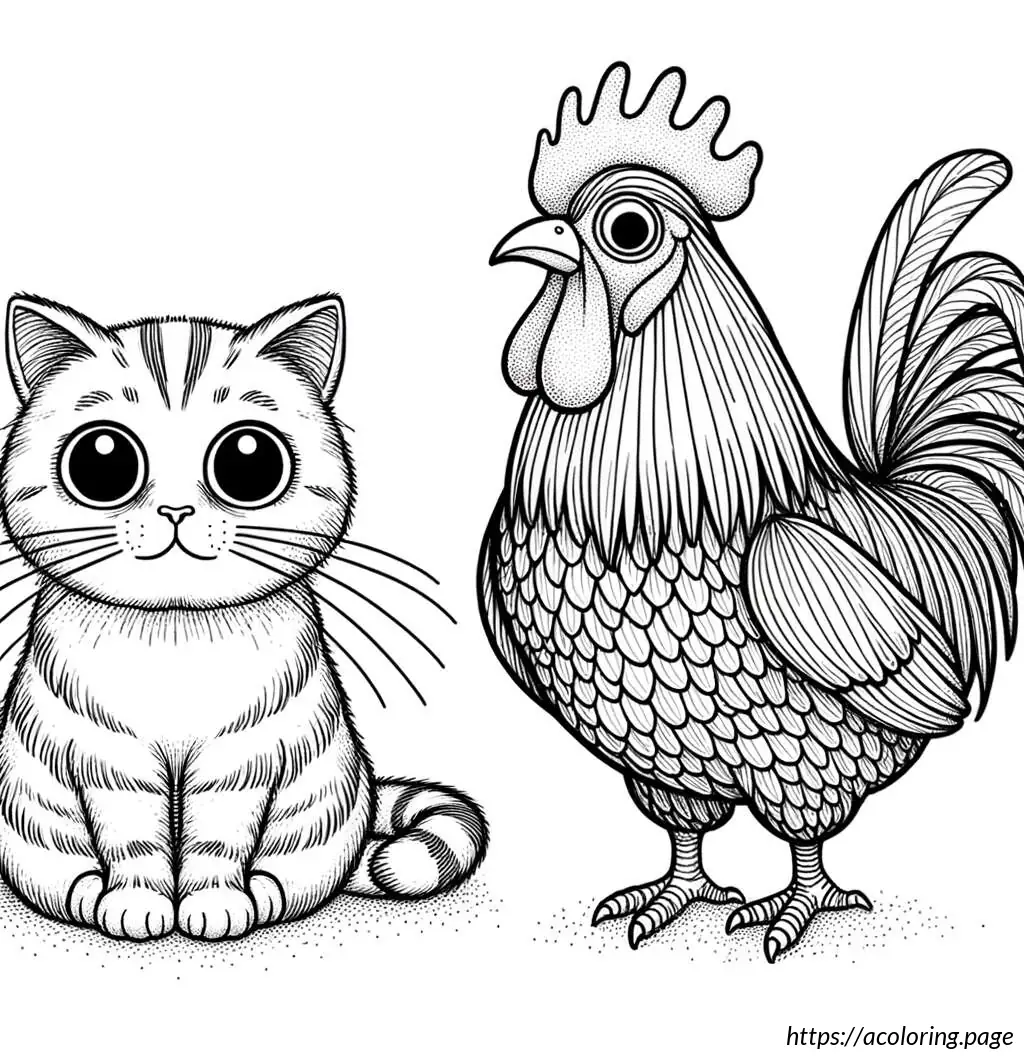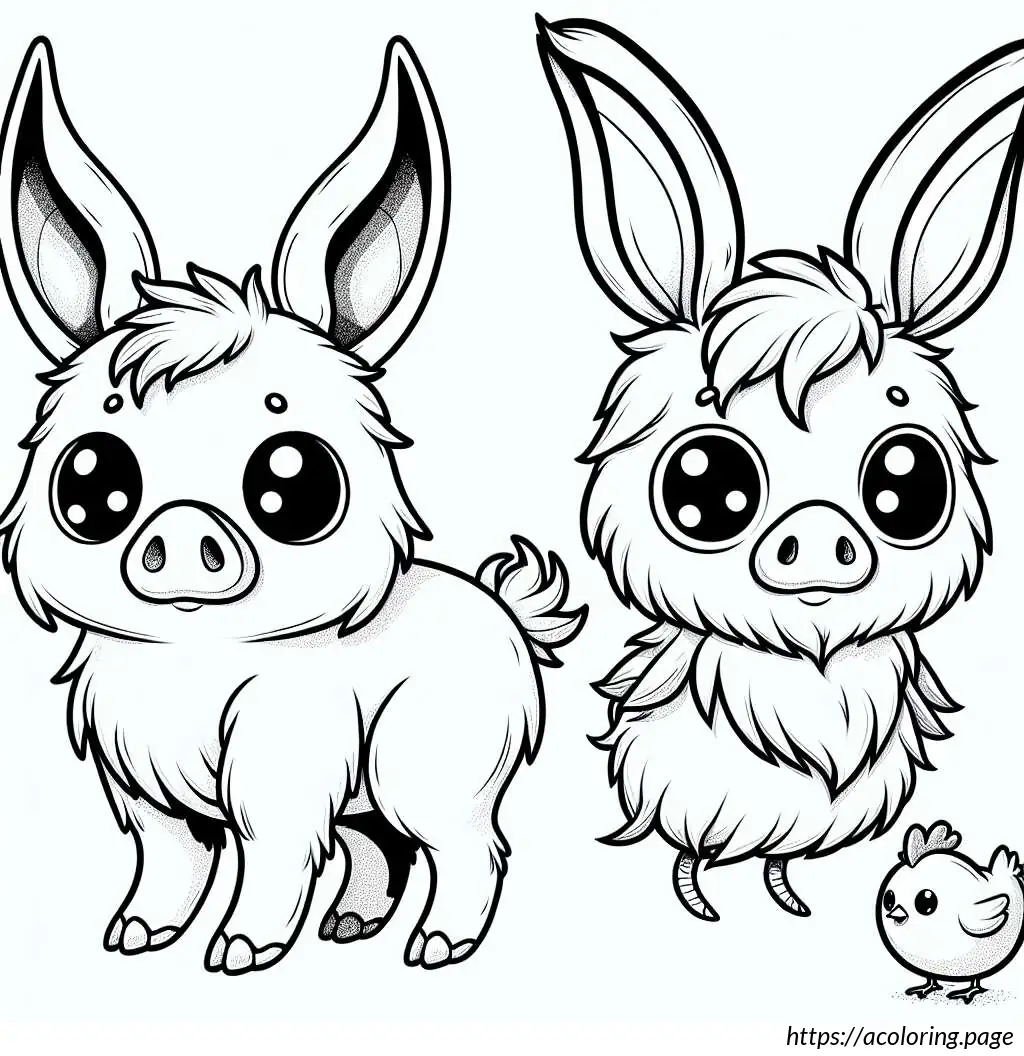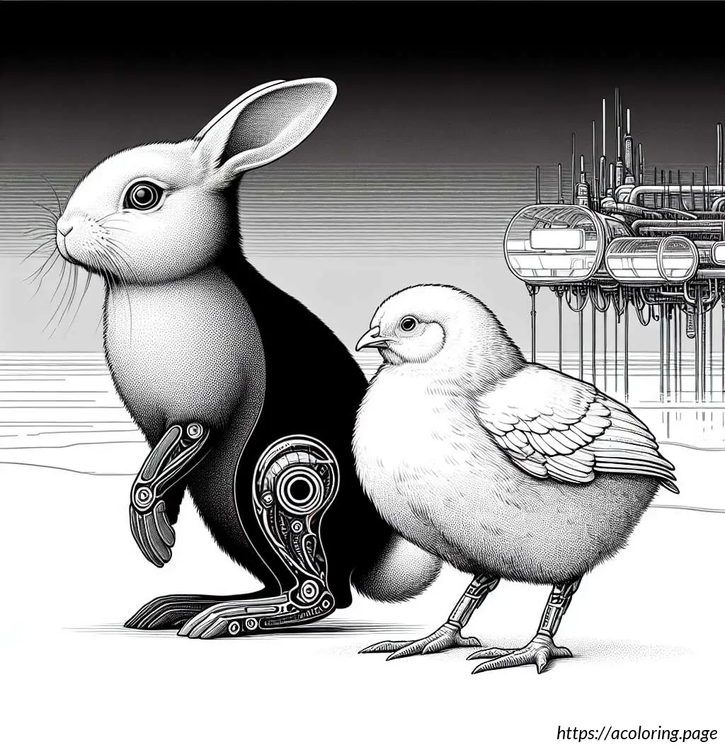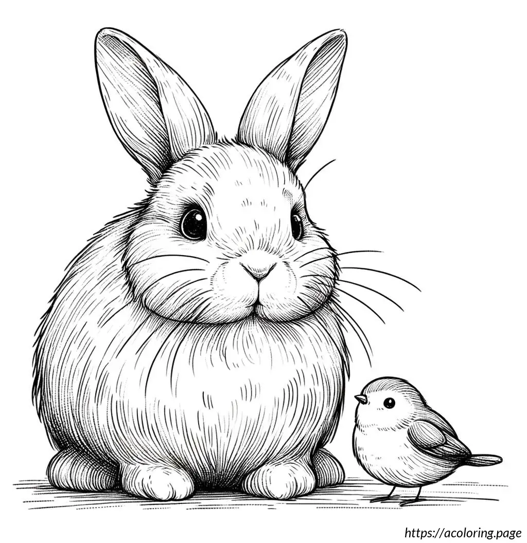 The image shows a simple and whimsically drawn cartoon of a rabbit standing upright, paired with a small chicken beside it. The rabbit has large, upright ears and is portrayed with wide eyes, a small tuft of hair on its head, and a prominent nose with whiskers. Additionally, the rabbit appears to have small arms and distinguishing features such as eyelashes and a tiny dot for a belly button. The chicken, also cartoonish, has a small comb on its head, wing feathers, and appears to be looking up at the rabbit. The style is clean, with thick black outlines, and no color—just black and white. The expressions on both characters suggest a friendly and endearing interaction.