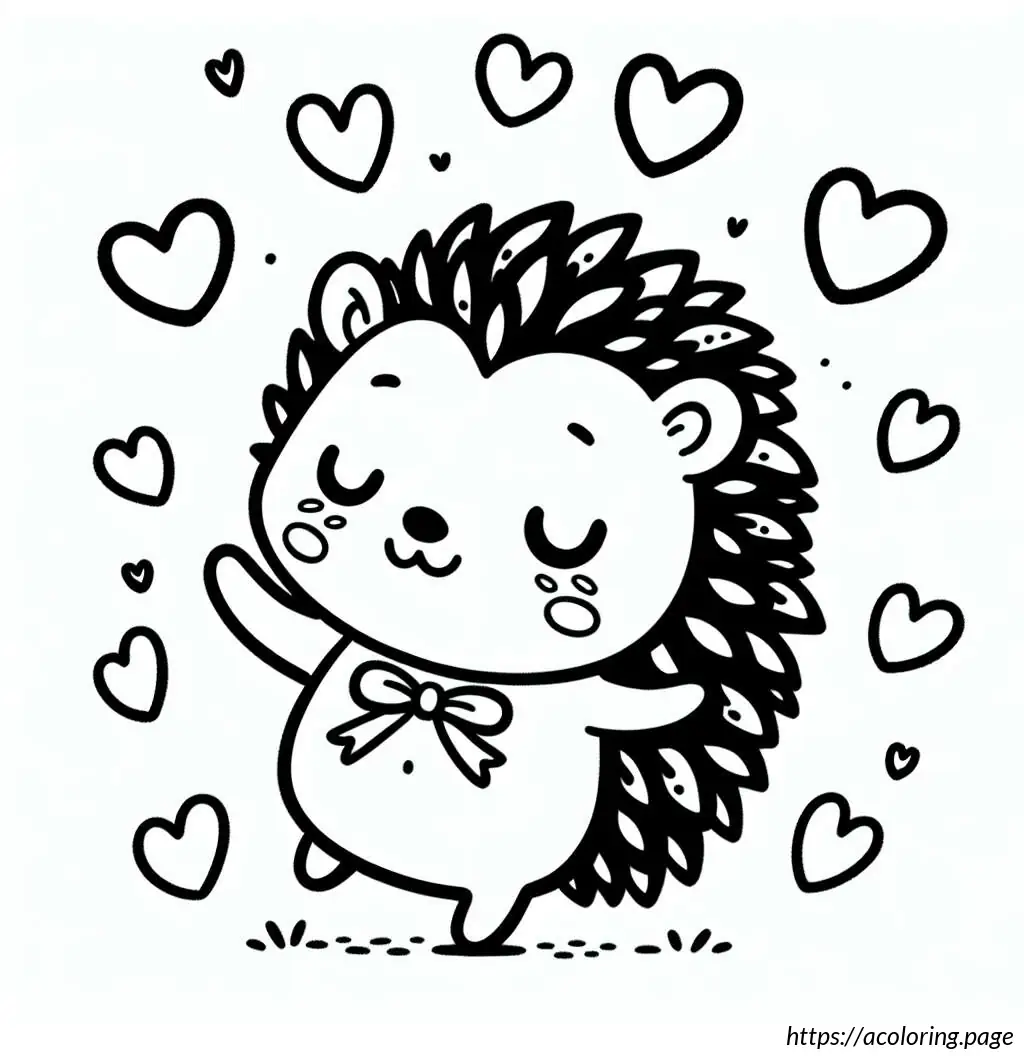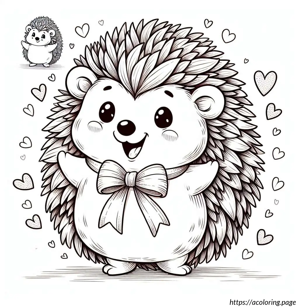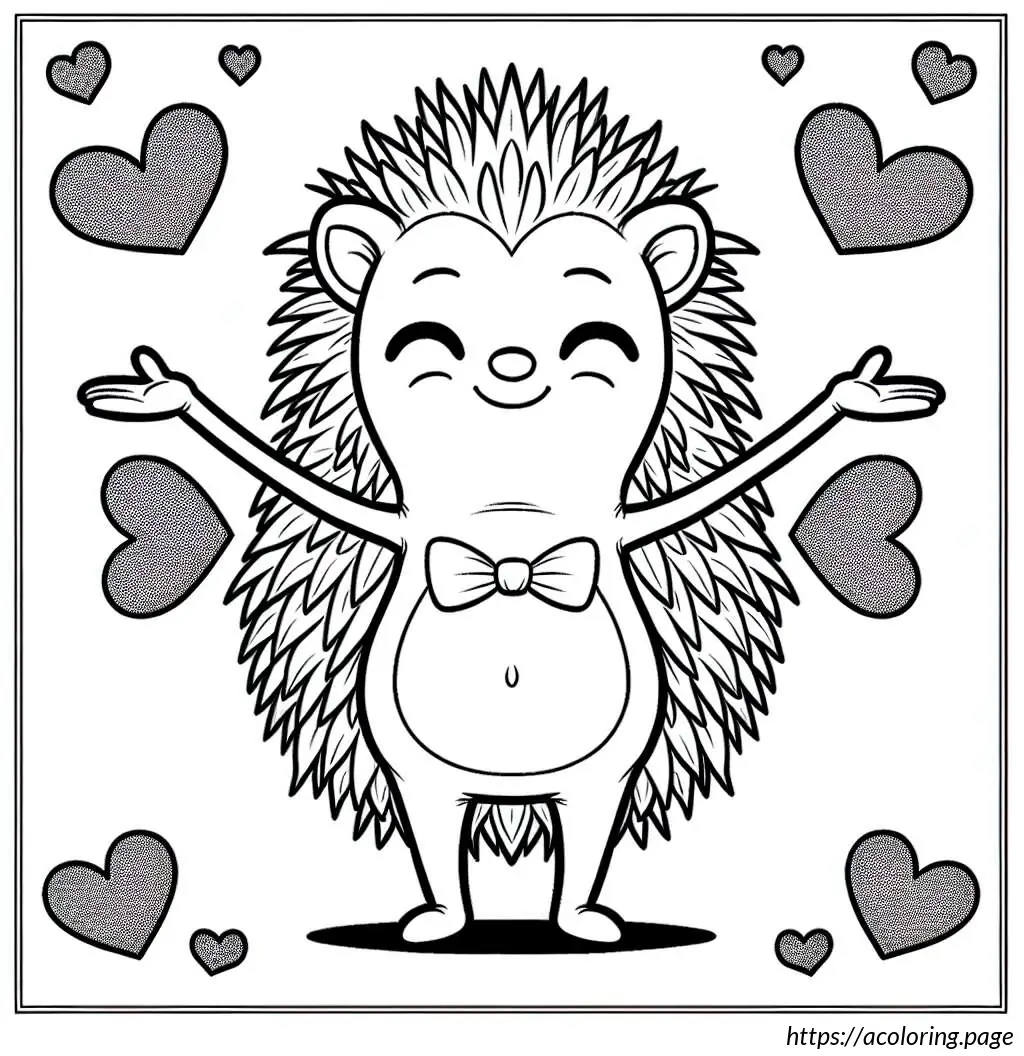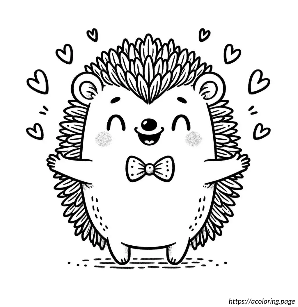 The image portrays a whimsical, cartoon-style hedgehog standing upright. The hedgehog features a joyful expression, with closed eyes and a wide smile. Its body is oval-shaped, adorned with a simple bow tie at the collar, and it has spiky fur highlighting its outline, suggesting the texture of its quills. The character is raising both arms wide as if welcoming a hug. Surrounding the hedgehog are four hearts, distributed around its head, illustrating a sense of love or happiness. This character’s simple, child-like illustration style makes it appear endearing and friendly.