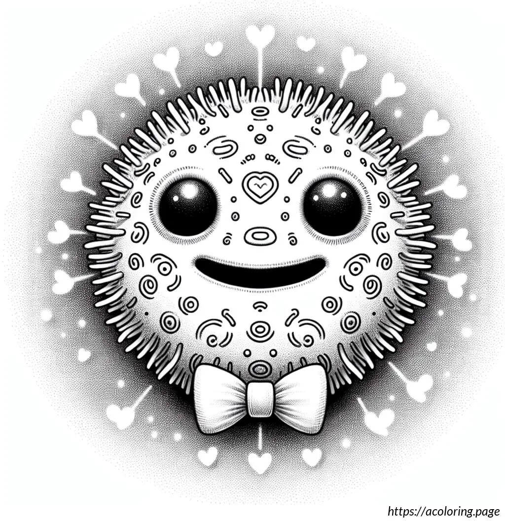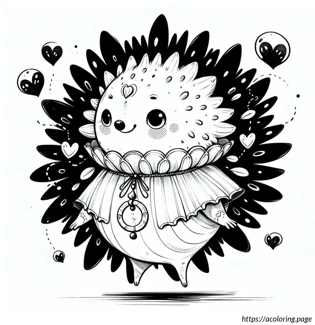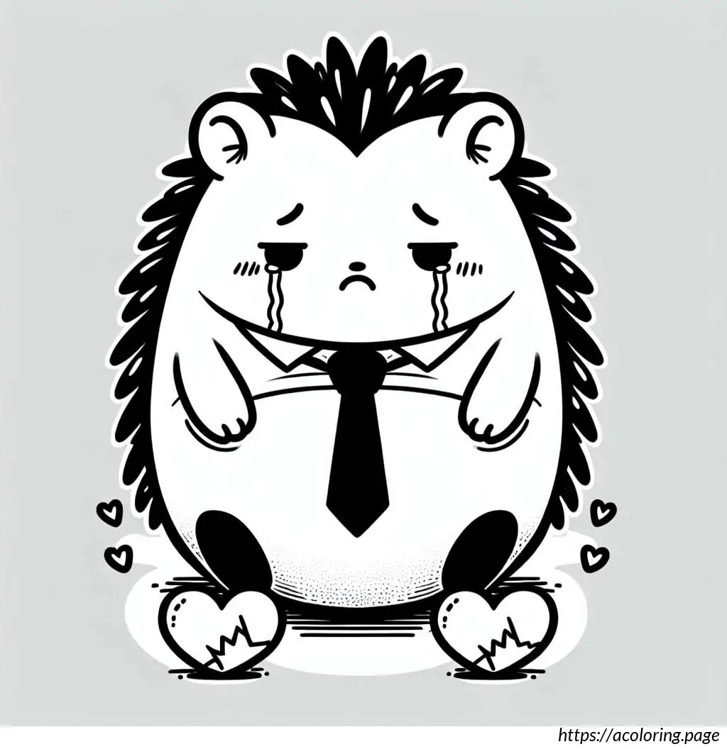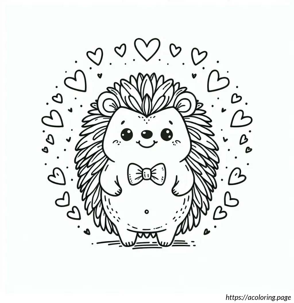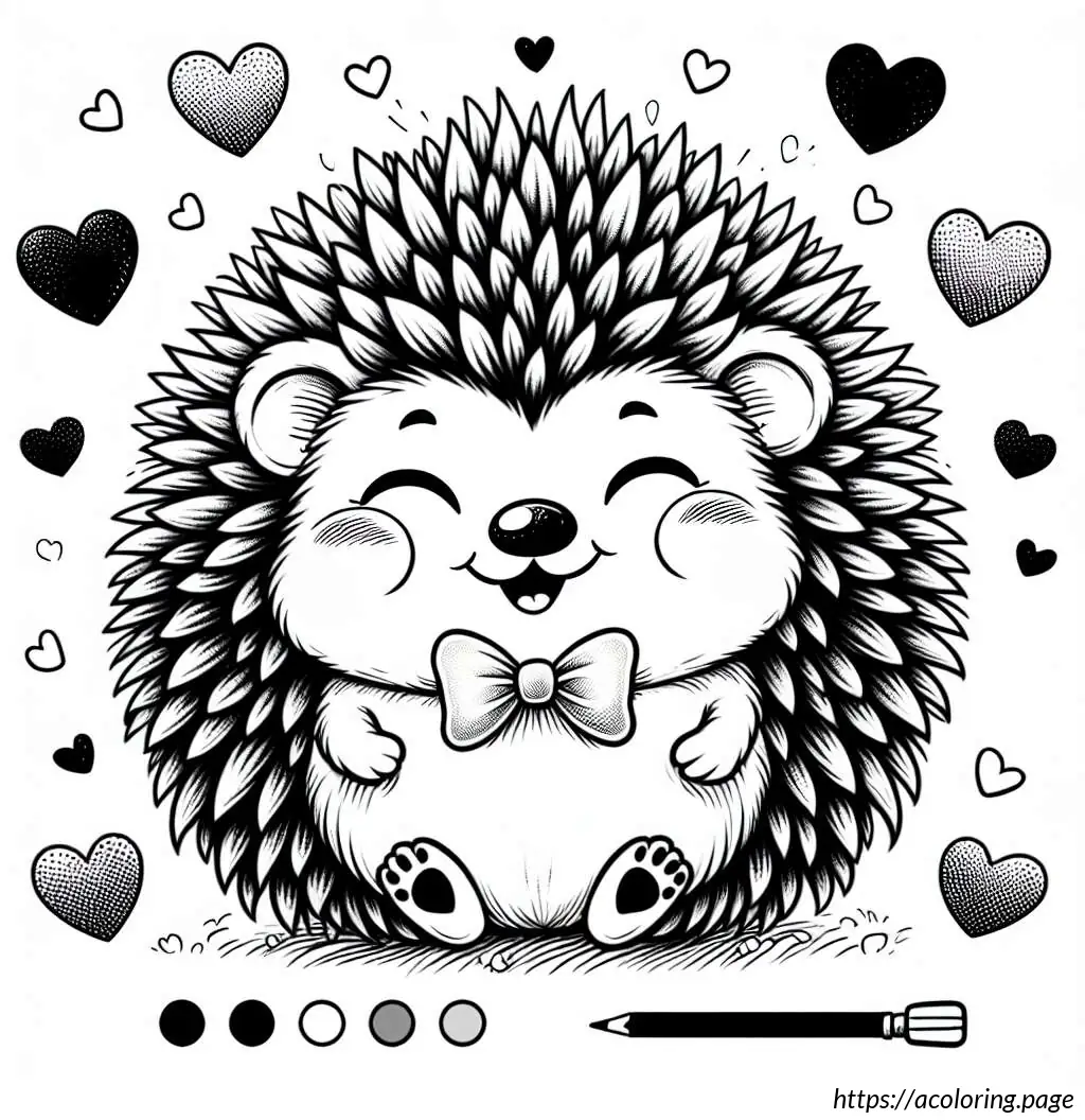 The image portrays a whimsical, cartoon-style hedgehog standing upright. The hedgehog features a joyful expression, with closed eyes and a wide smile. Its body is oval-shaped, adorned with a simple bow tie at the collar, and it has spiky fur highlighting its outline, suggesting the texture of its quills. The character is raising both arms wide as if welcoming a hug. Surrounding the hedgehog are four hearts, distributed around its head, illustrating a sense of love or happiness. This character’s simple, child-like illustration style makes it appear endearing and friendly.