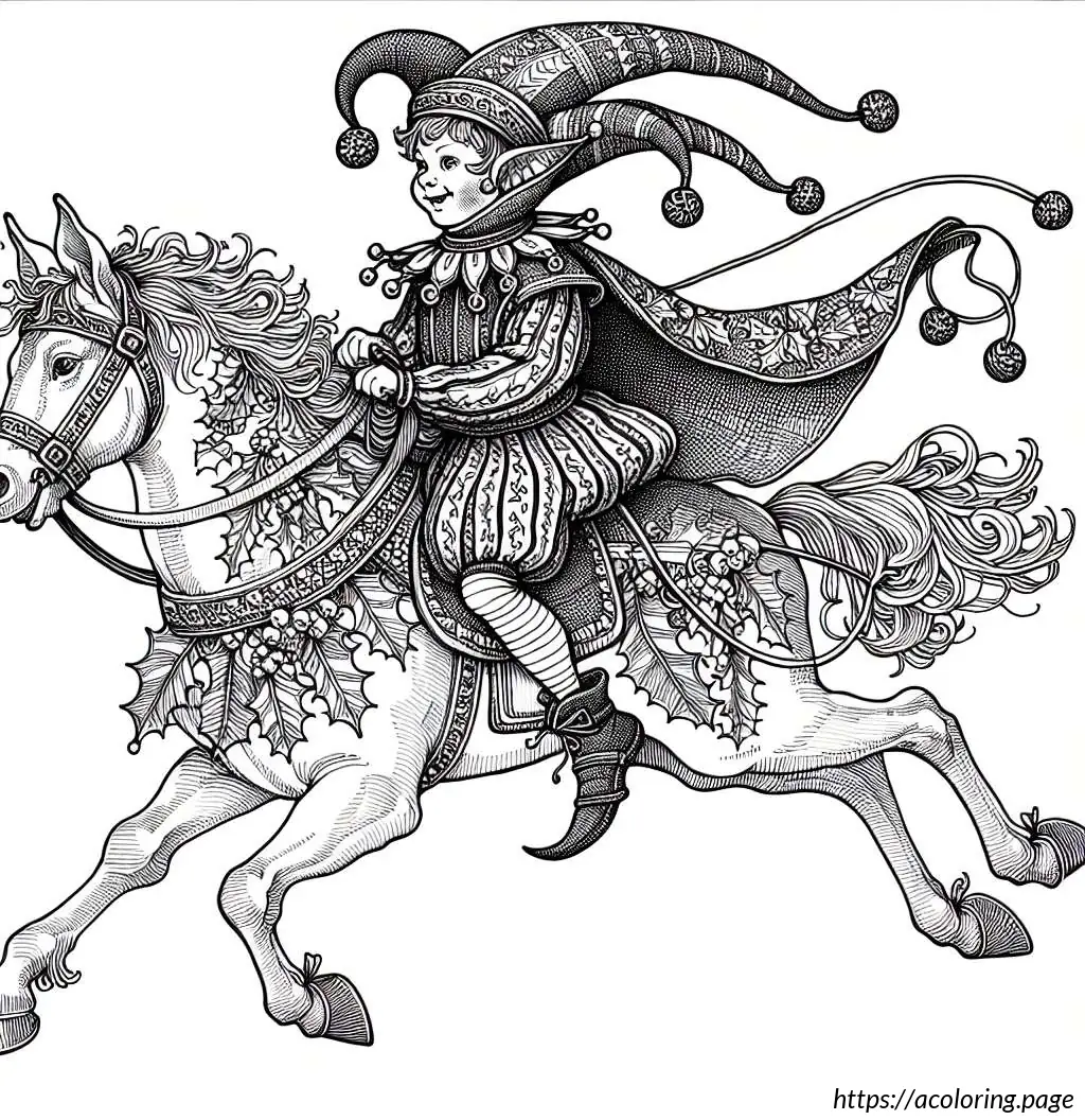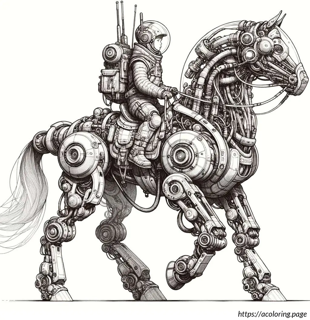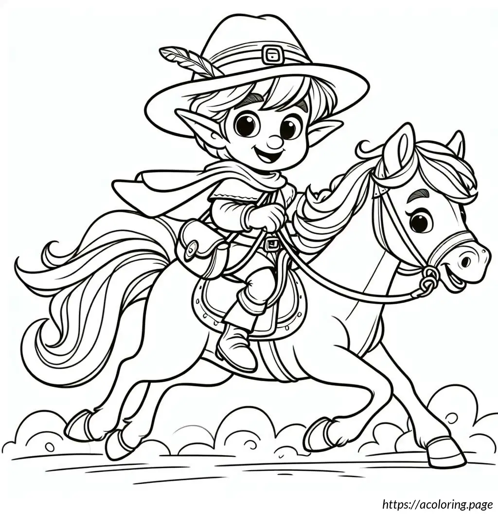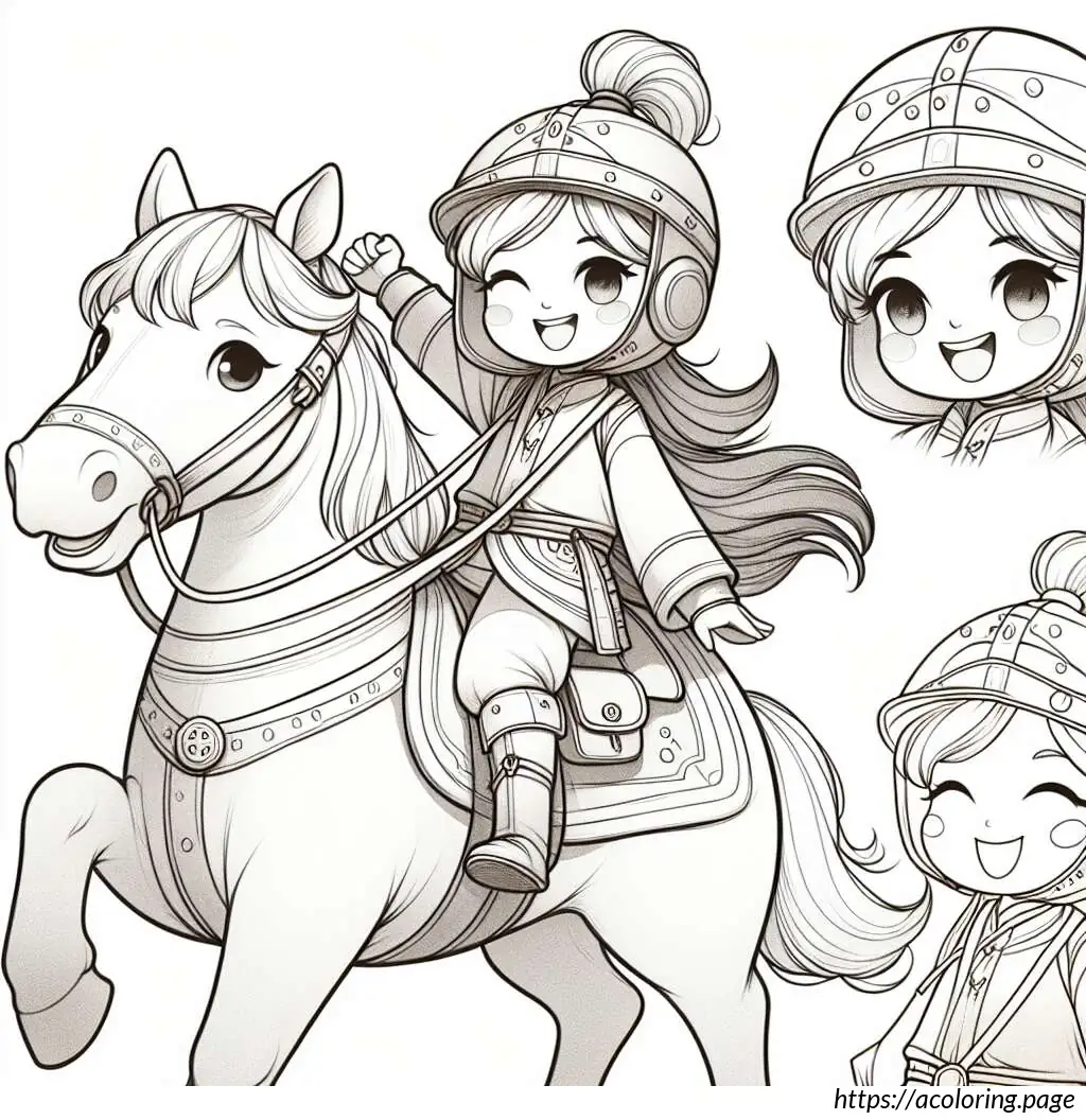 The horse has an expressive face, with large eyes and a friendly smile, and wears a bridle. Its mane and tail are flowing and slightly stylized, enhancing its cartoonish appeal. The overall scene is dynamic, conveying a sense of movement and adventure. The image is outlined in black and white, possibly intended for coloring activities, emphasizing its design for creative or educational use.