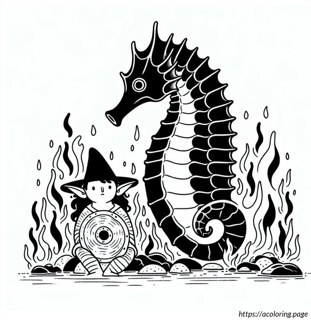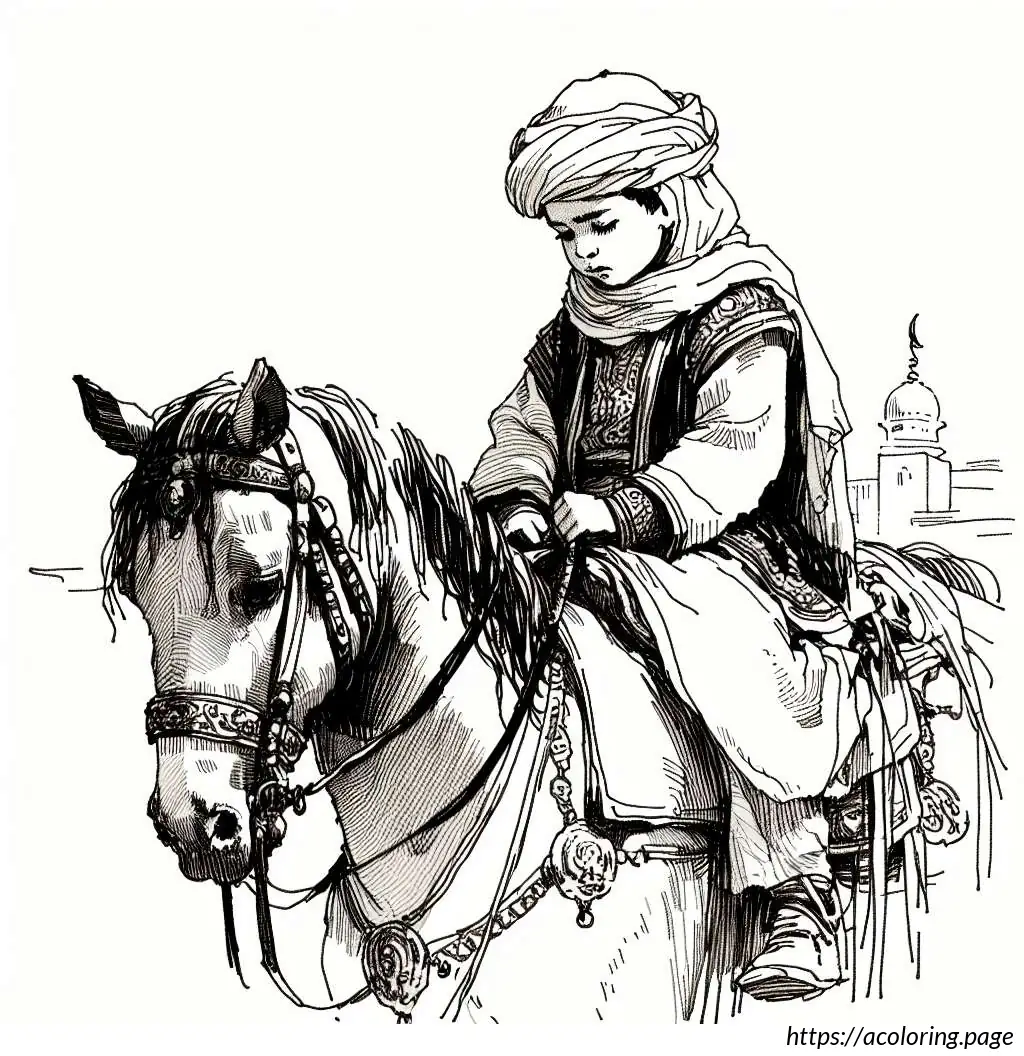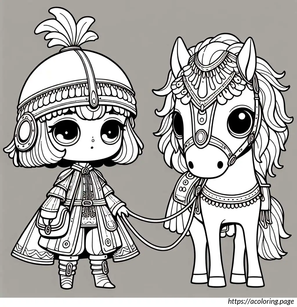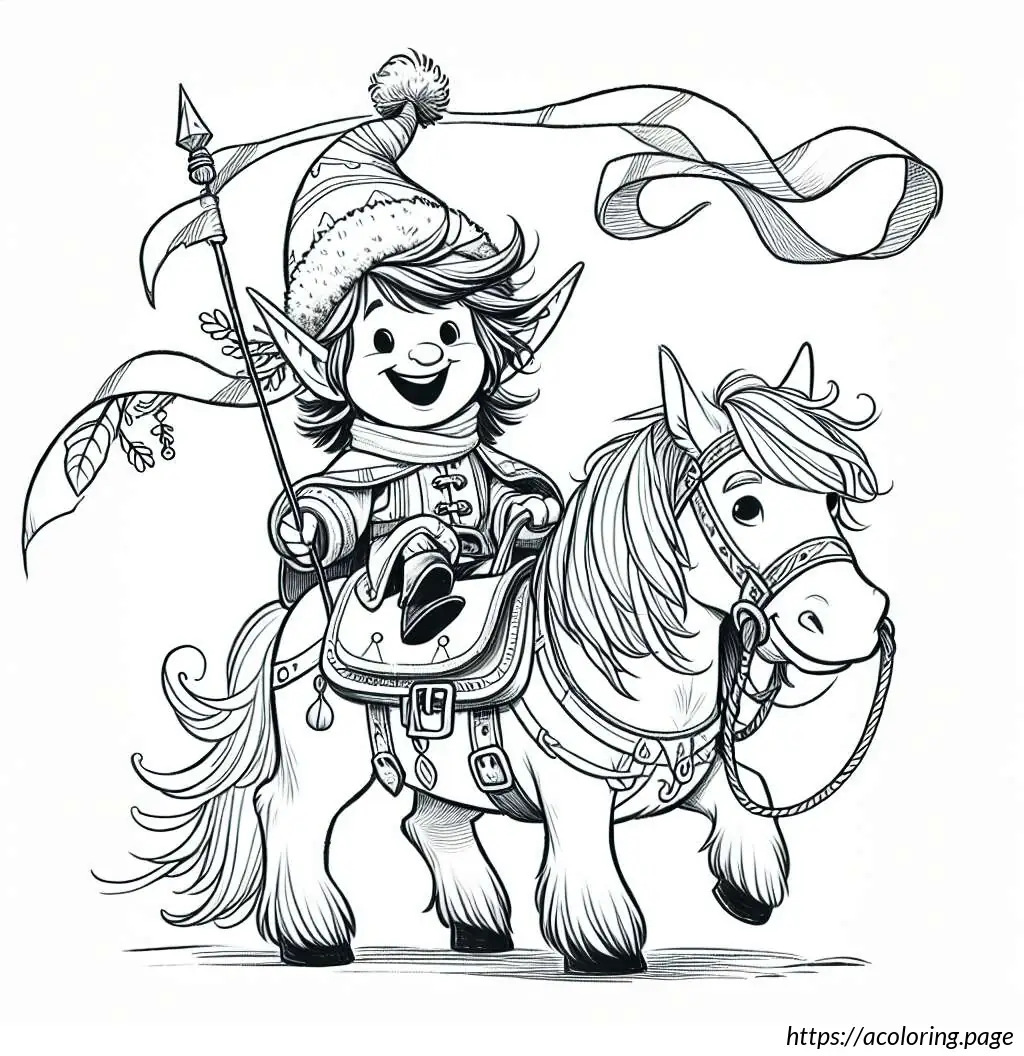 The horse has an expressive face, with large eyes and a friendly smile, and wears a bridle. Its mane and tail are flowing and slightly stylized, enhancing its cartoonish appeal. The overall scene is dynamic, conveying a sense of movement and adventure. The image is outlined in black and white, possibly intended for coloring activities, emphasizing its design for creative or educational use.