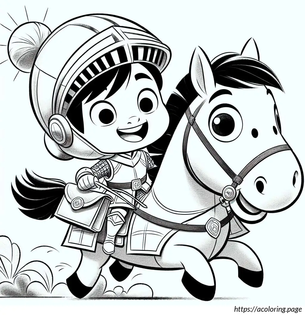 This image shows a cheerful cartoon-style depiction of a child knight riding a horse. Both the child and the horse are animated characters with stylized features. The child wears armor and a helmet with a pointed top and a pom-pom, resembling a classic knight but with a whimsical twist, suggesting a playful, fairy-tale theme. The child also carries a square bag that looks like a satchel, with a circular detail on its flap.