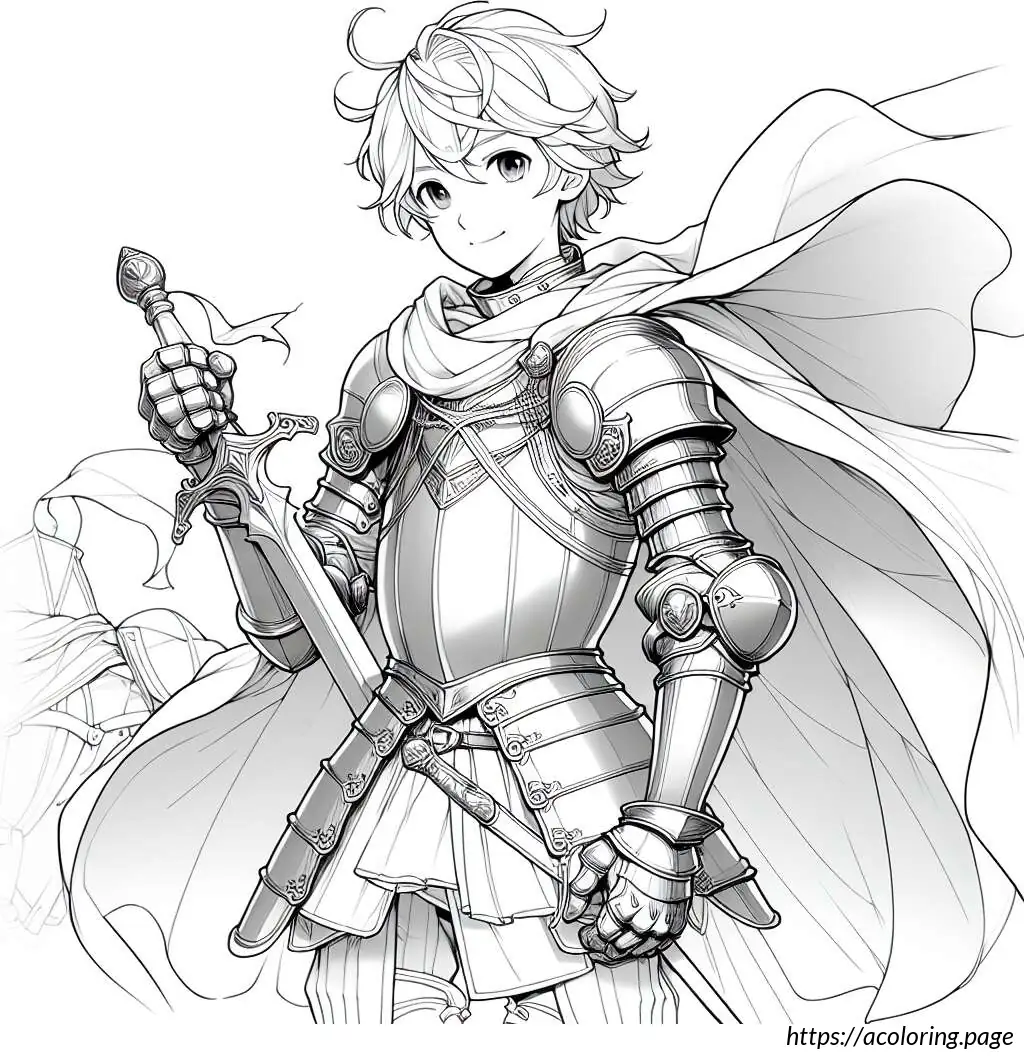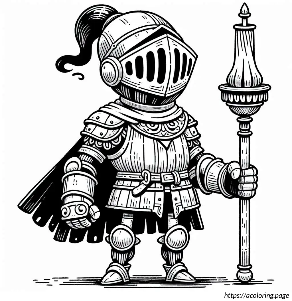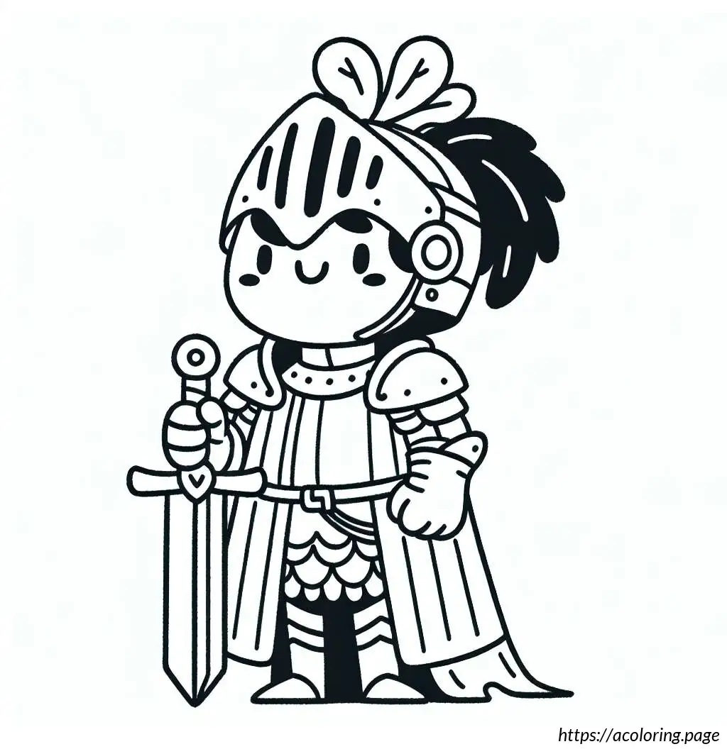 This image depicts a cartoonish drawing of a knight. The knight appears youthful and friendly, characterized by a smiling face, visible through the helmet’s visor. The helmet is topped with a flowing flag. The knight is clad in traditional armor that includes a breastplate, pauldrons, gauntlets, and greaves, all designed with simplicity and a touch of medieval flair. Additionally, the knight wears a cape that drapes over his shoulders and flows behind, adding to the regal and heroic look.