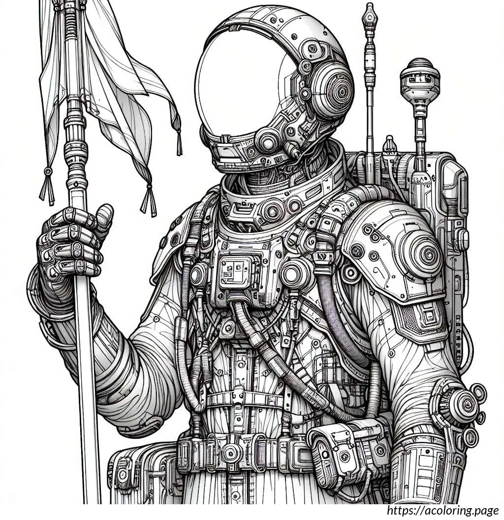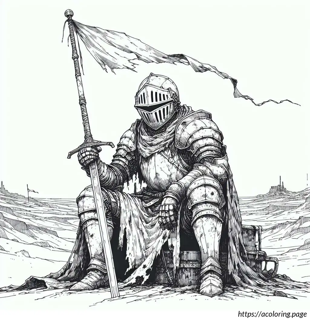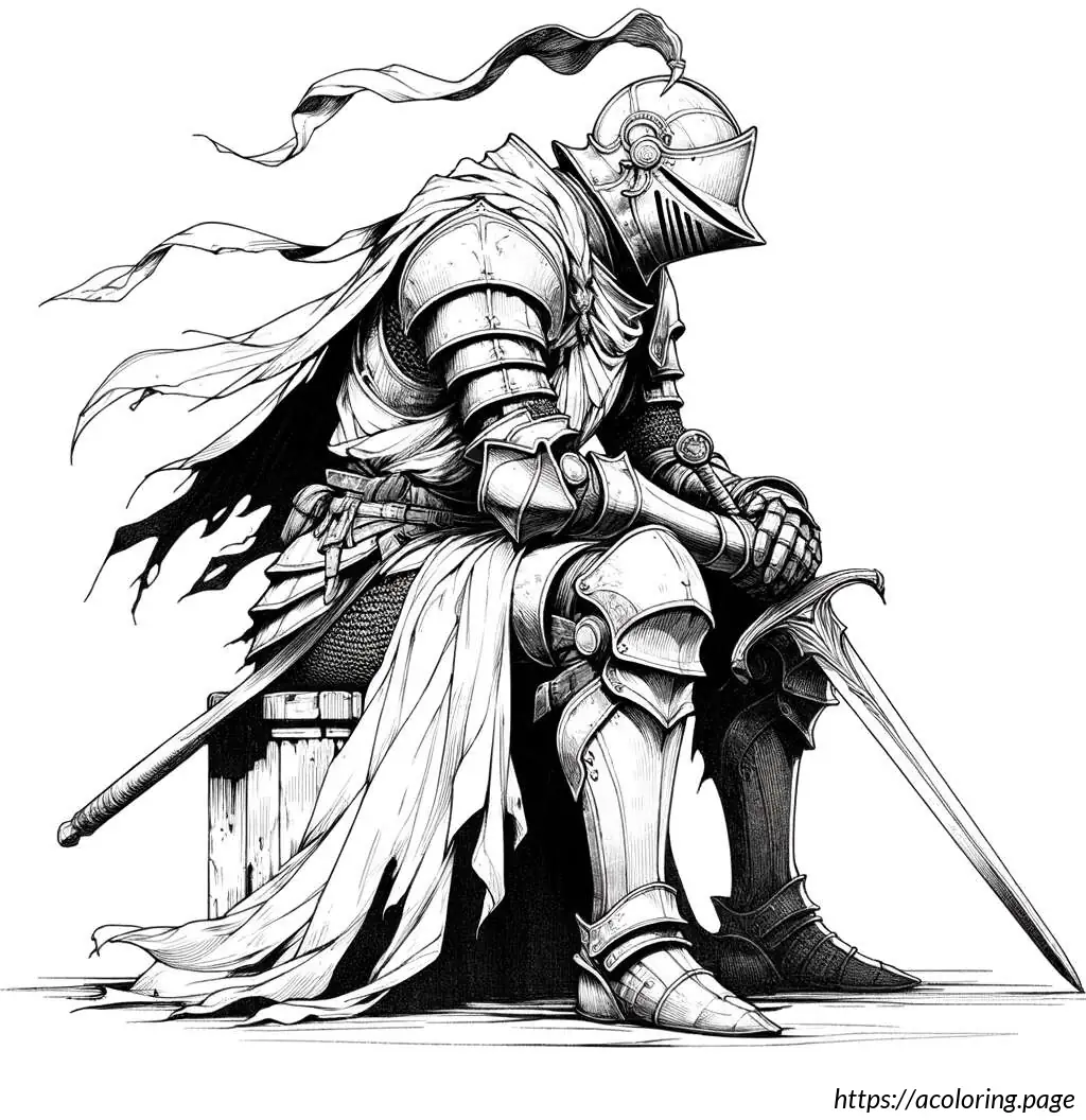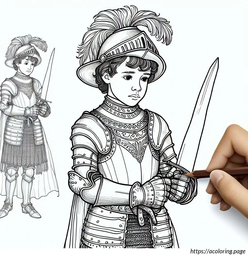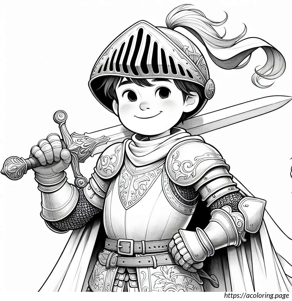 The knight is posed holding a sword vertically in front of him with both hands on the hilt, suggesting readiness or a ceremonial stance. The armor and sword, along with the happy expression, combine to convey a sense of adventure and nobility, typical of storybook knights. The drawing is in black and white, giving it a classic, timeless feel, suitable for coloring or as a template for various artistic or educational projects.