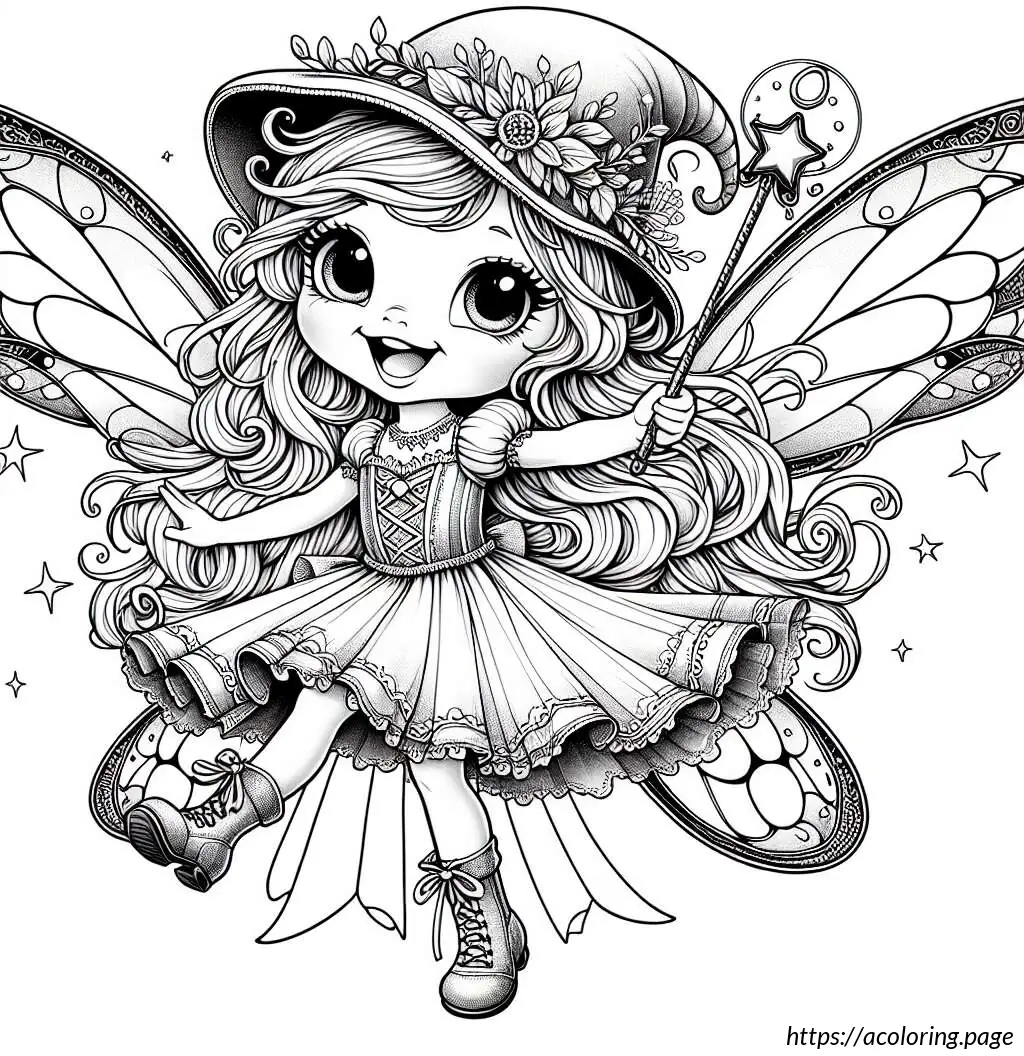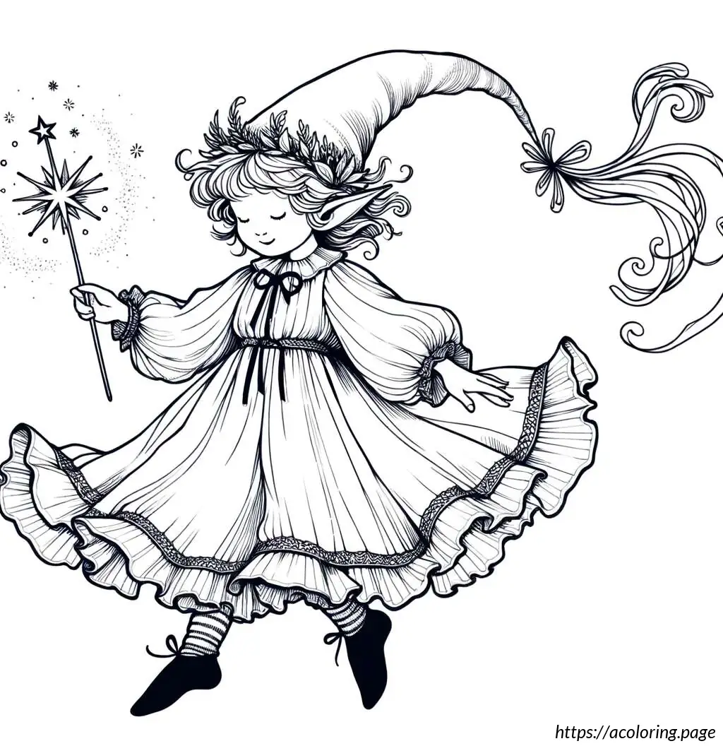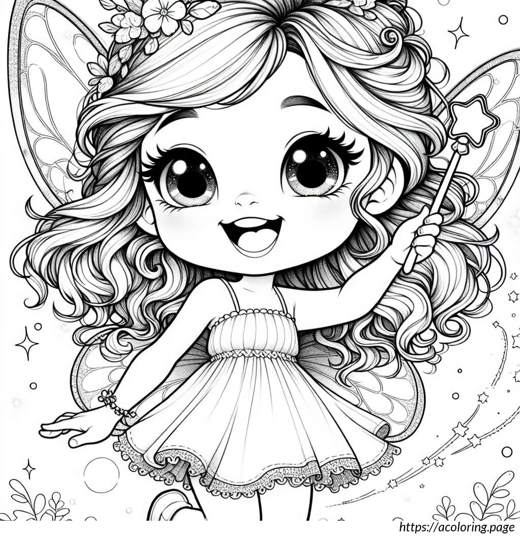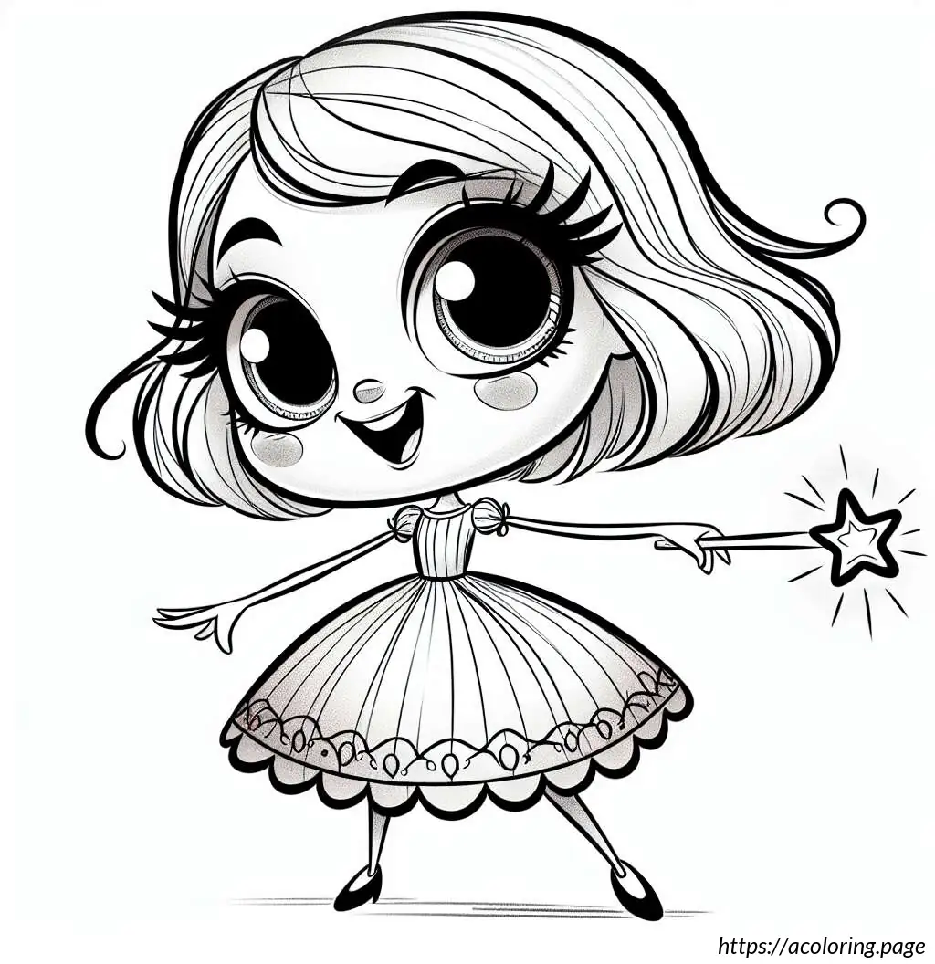 This is a black-and-white illustration of a stylized, cartoon-like young female character. She appears joyful and is depicted in a dynamic pose with one leg lifted slightly and arms extended. She has large, expressive eyes and a friendly smile. Her hair is drawn in a soft, wavy style with a large bow on top. Sheโs wearing a simple, short-sleeved dress with a scalloped hemline and a pair of plain shoes. Additionally, she is holding a wand with a star on its tip in her right hand, suggesting she could be portraying a fairy or a magical character. The overall style is clean and outlined, suitable for coloring activities.
