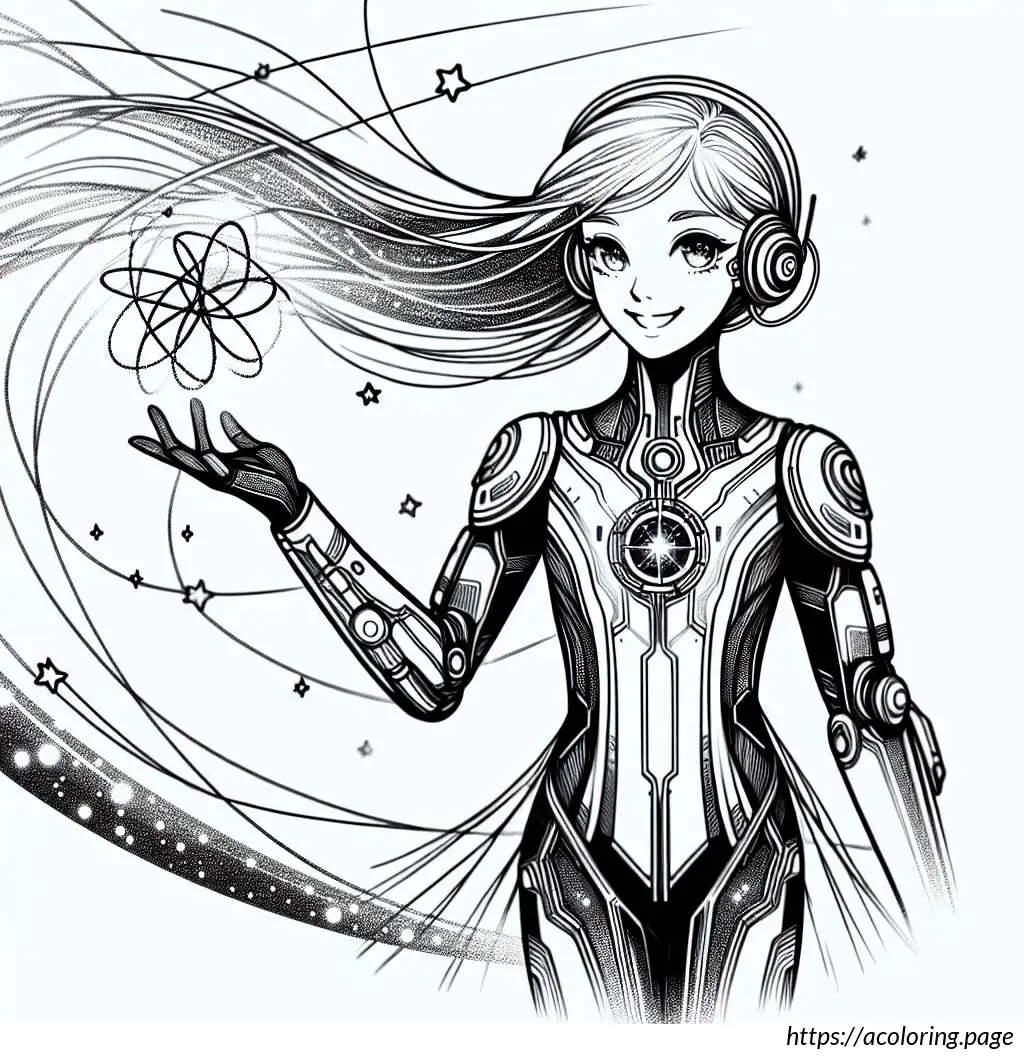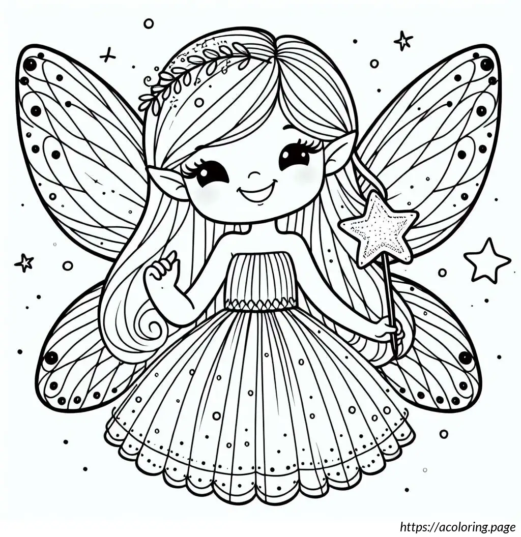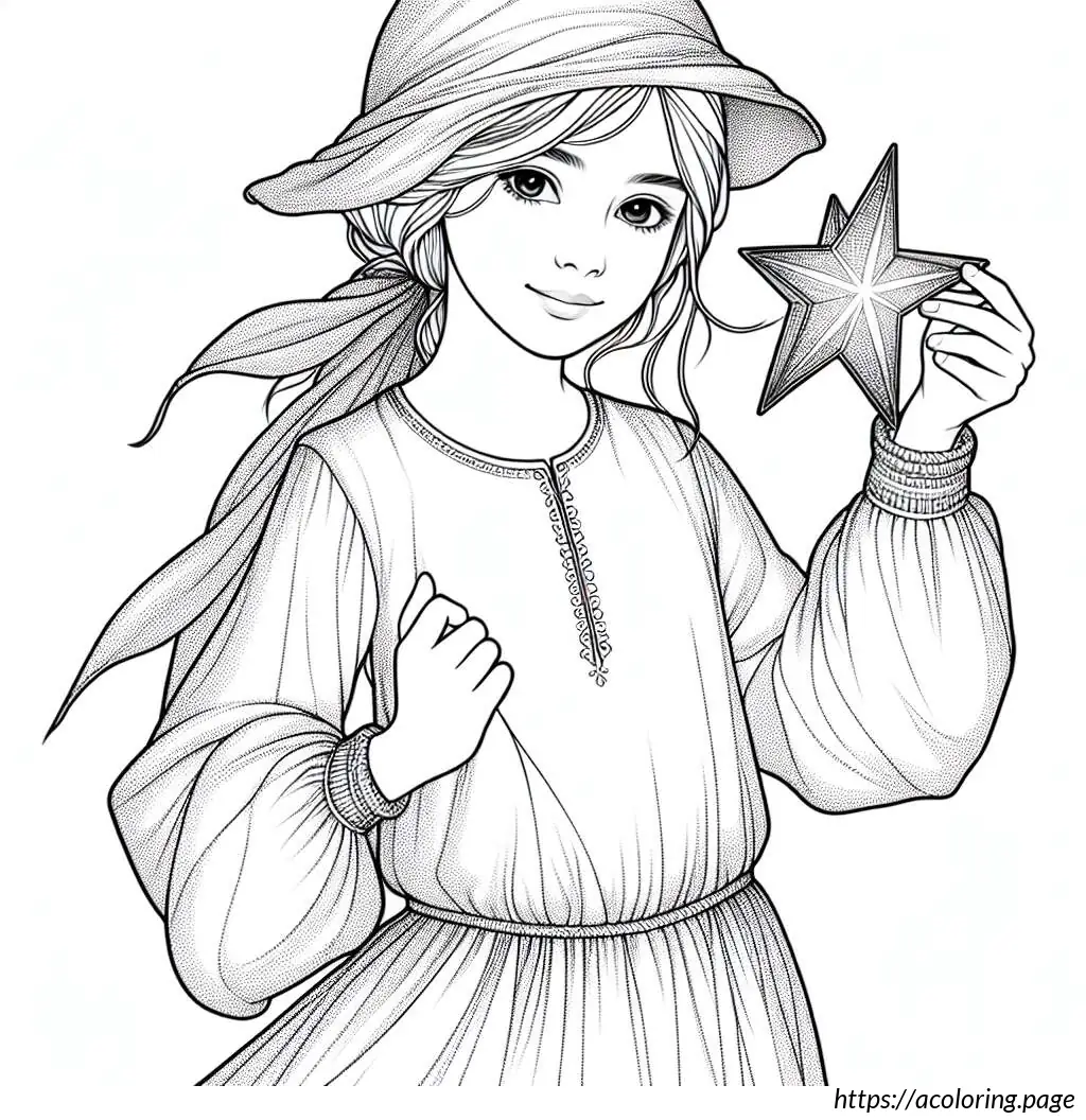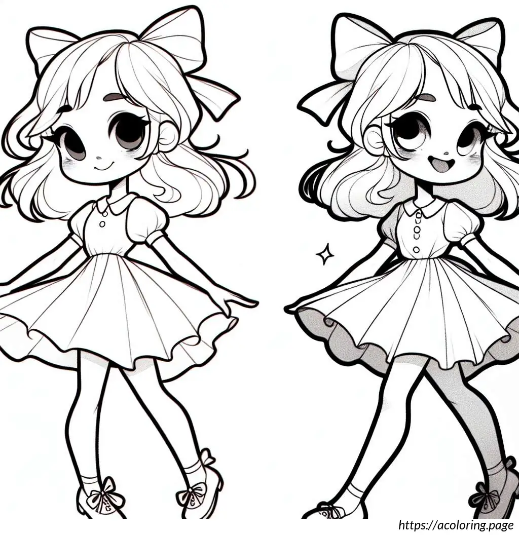 This is a black-and-white illustration of a stylized, cartoon-like young female character. She appears joyful and is depicted in a dynamic pose with one leg lifted slightly and arms extended. She has large, expressive eyes and a friendly smile. Her hair is drawn in a soft, wavy style with a large bow on top. Sheโs wearing a simple, short-sleeved dress with a scalloped hemline and a pair of plain shoes. Additionally, she is holding a wand with a star on its tip in her right hand, suggesting she could be portraying a fairy or a magical character. The overall style is clean and outlined, suitable for coloring activities.