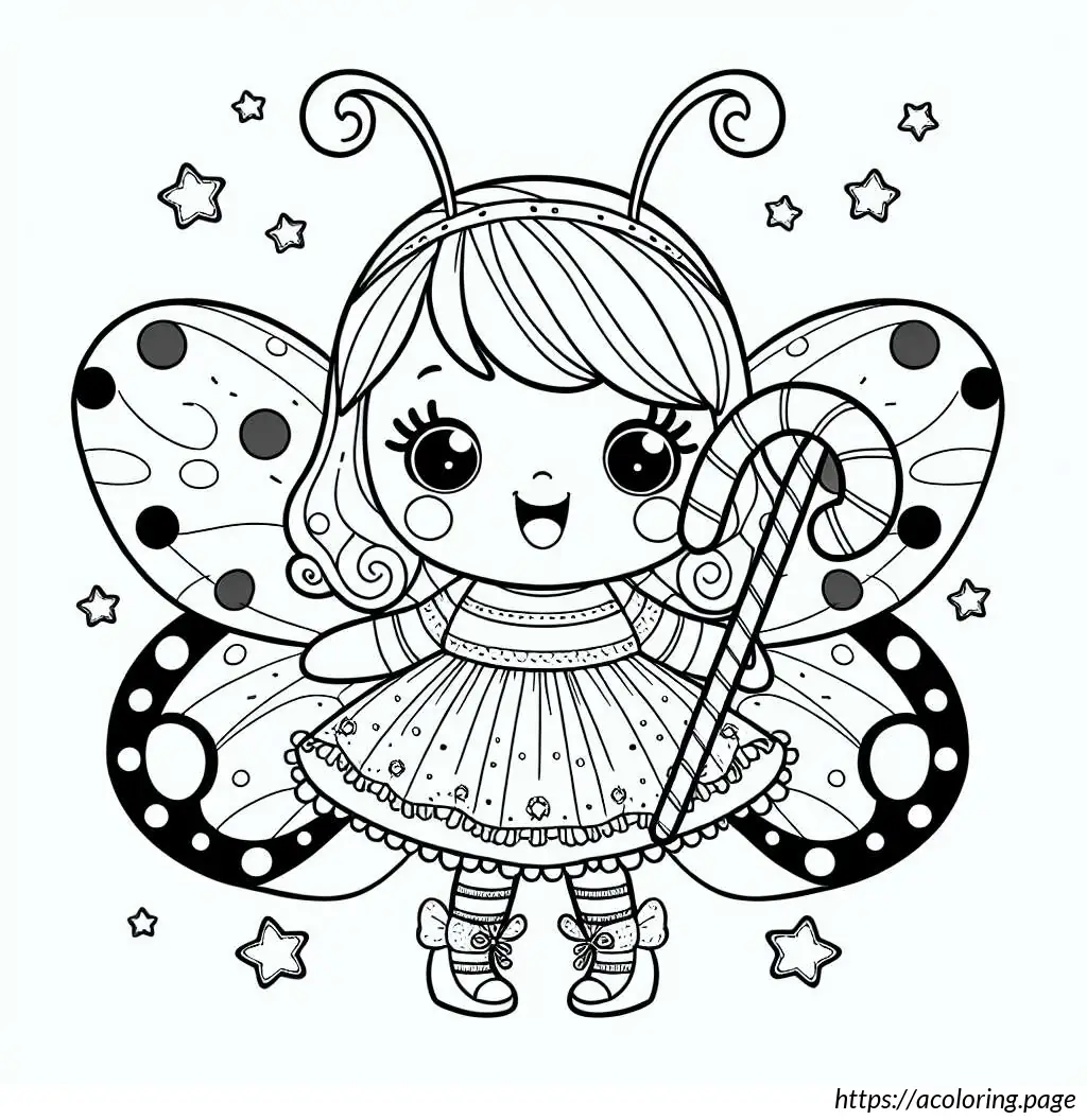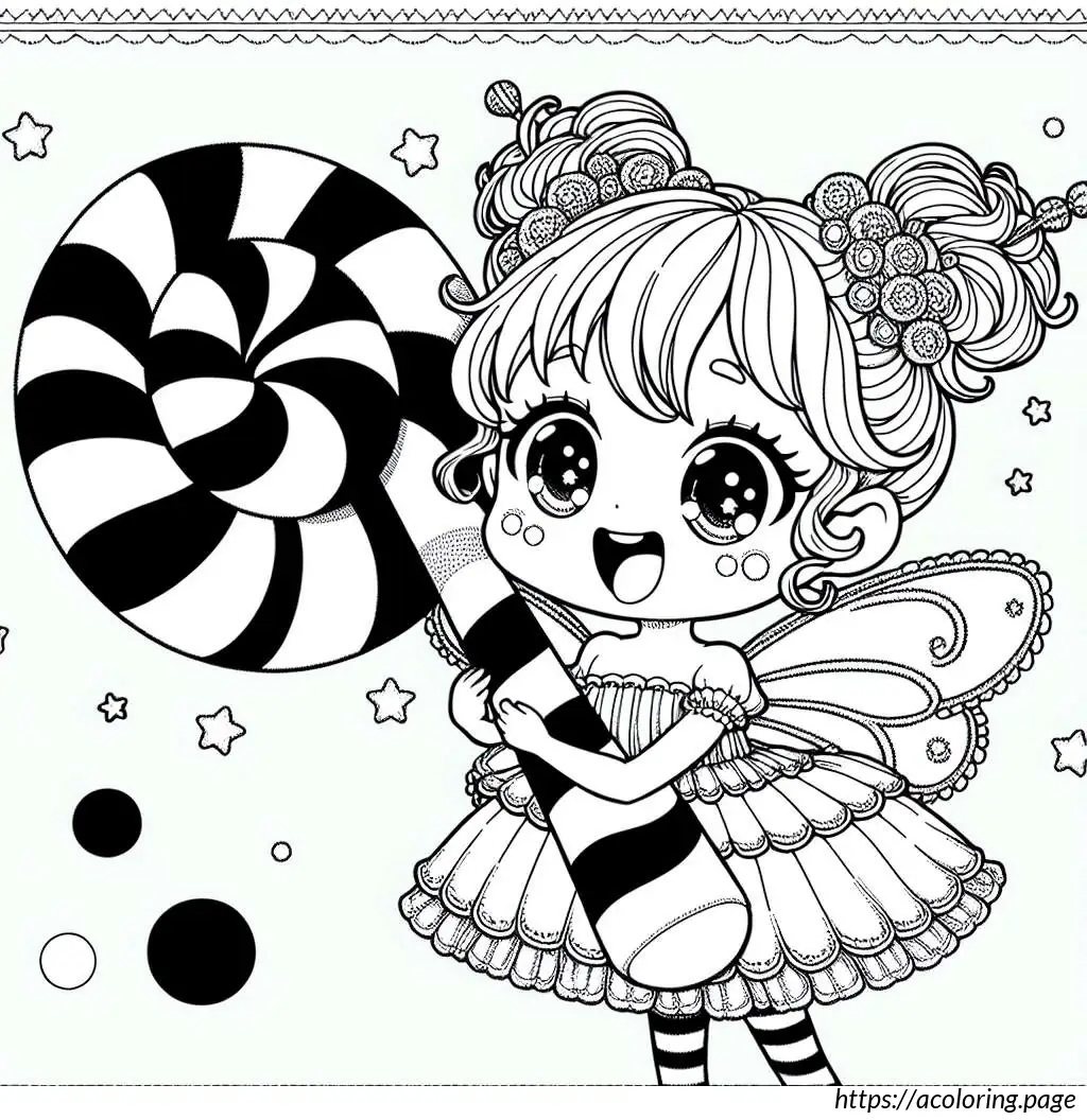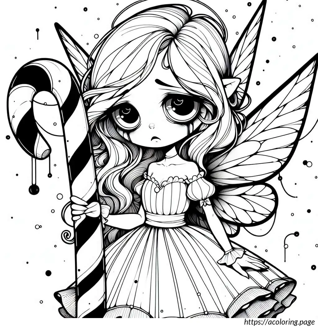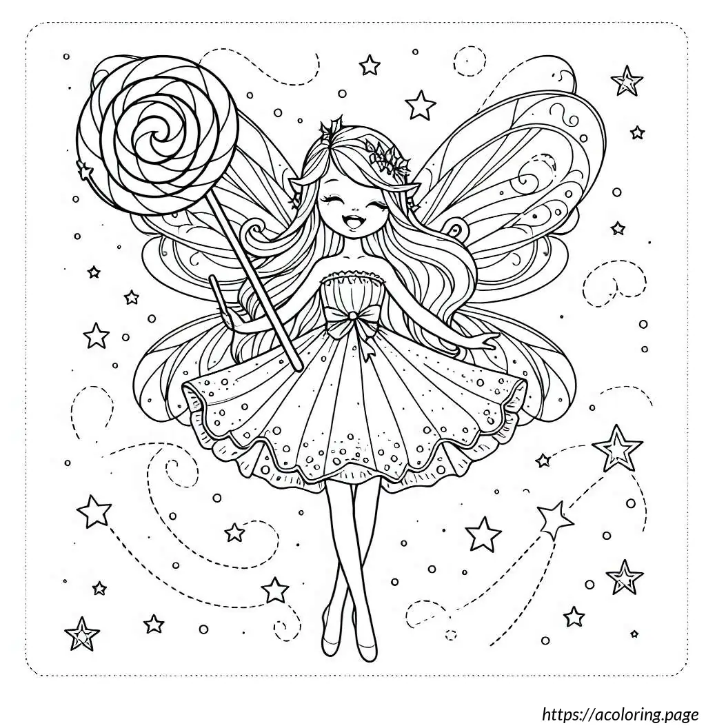 The image is a black and white line drawing of a cheerful fairy character. This fairy is depicted as a young girl with wings, holding onto a large, striped candy cane. She has a joyful expression, with her mouth open in a smile and her eyes wide. Her hair is styled in two small pigtails, and she wears a short-sleeved dress with a frilly skirt. The fairy has rounded fairy wings. There are small stars and dots scattered around her, suggesting a magical or whimsical atmosphere. The overall style is simple and cartoonish, suitable for coloring activities.