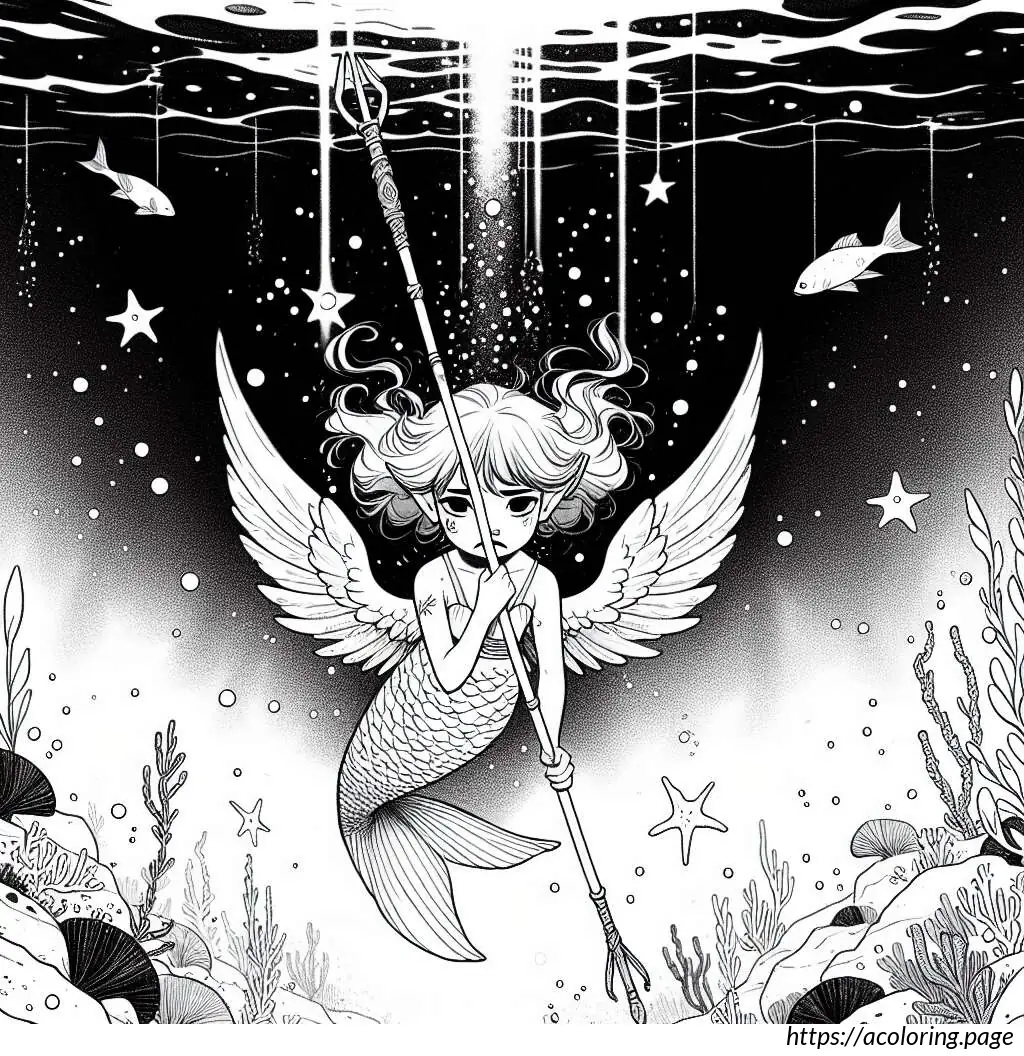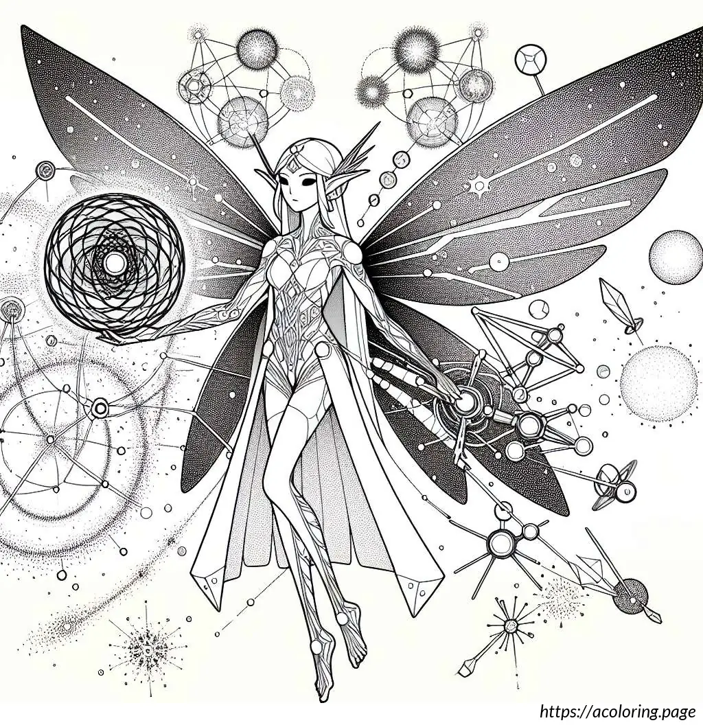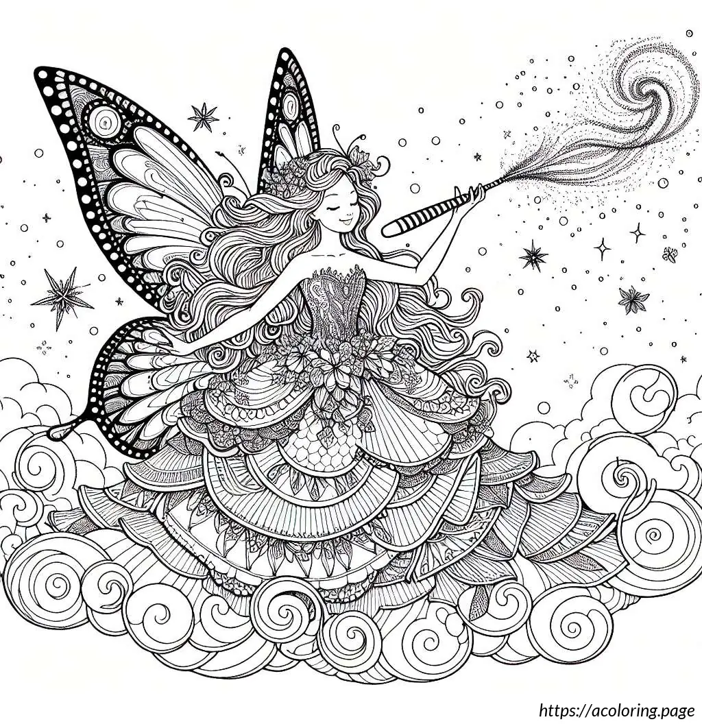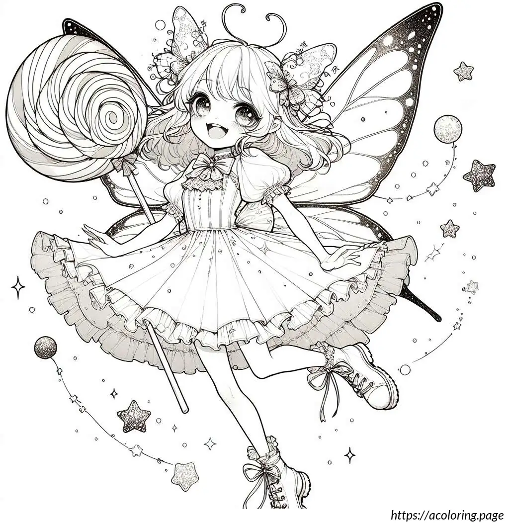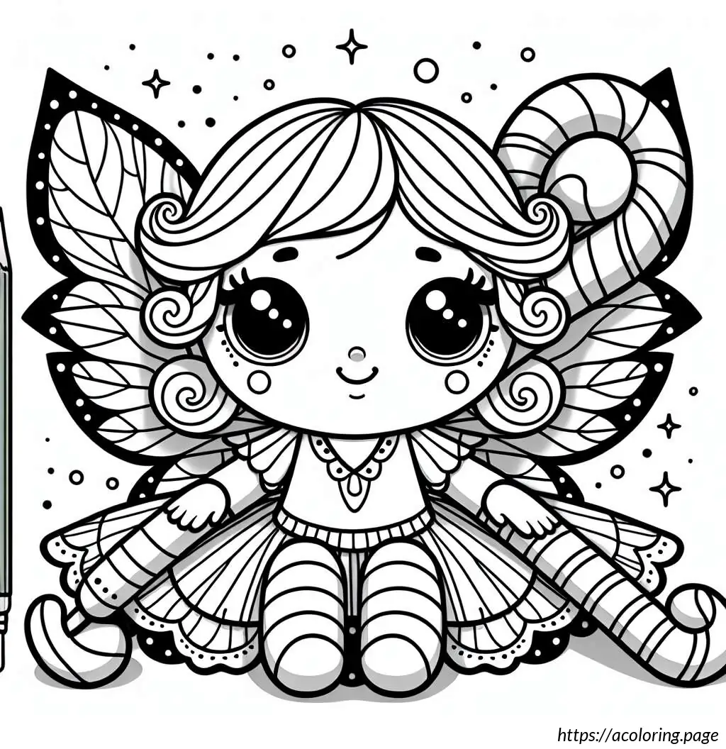 The image is a black and white line drawing of a cheerful fairy character. This fairy is depicted as a young girl with wings, holding onto a large, striped candy cane. She has a joyful expression, with her mouth open in a smile and her eyes wide. Her hair is styled in two small pigtails, and she wears a short-sleeved dress with a frilly skirt. The fairy has rounded fairy wings. There are small stars and dots scattered around her, suggesting a magical or whimsical atmosphere. The overall style is simple and cartoonish, suitable for coloring activities.