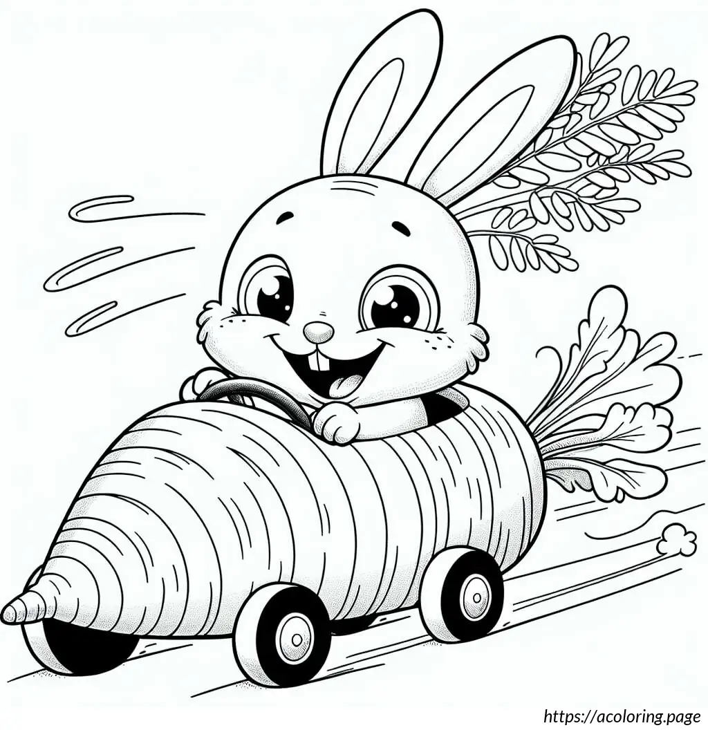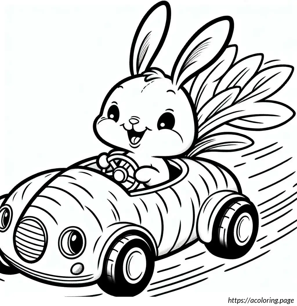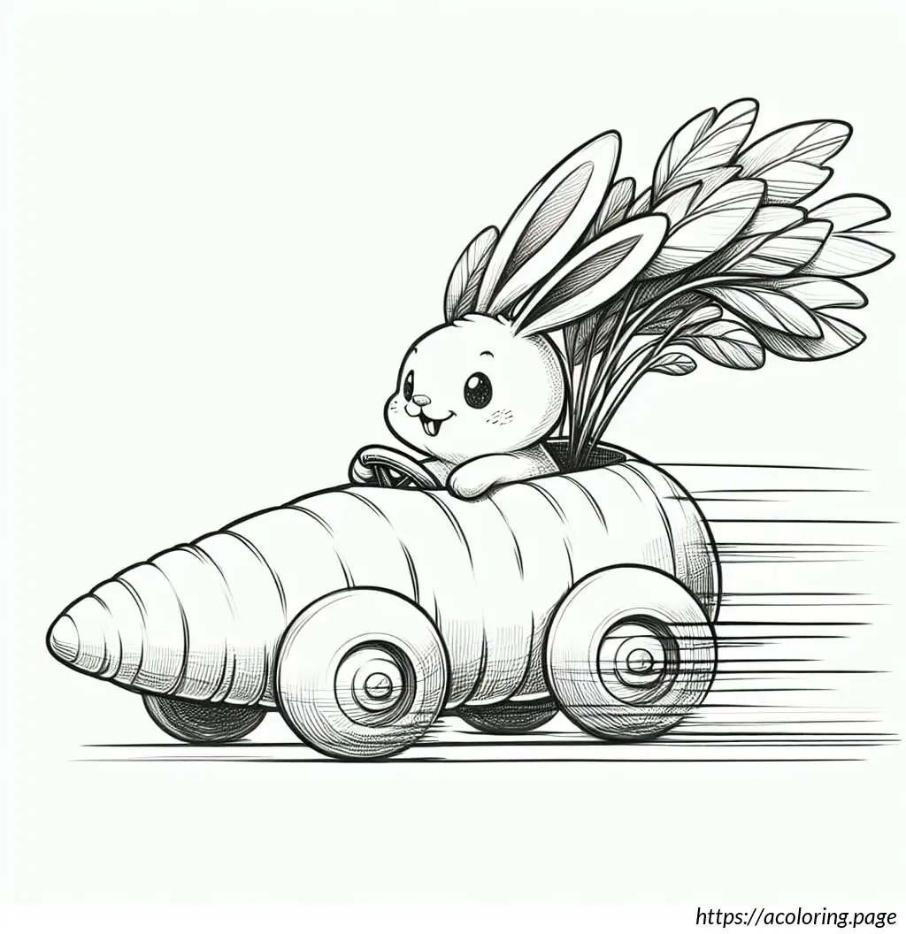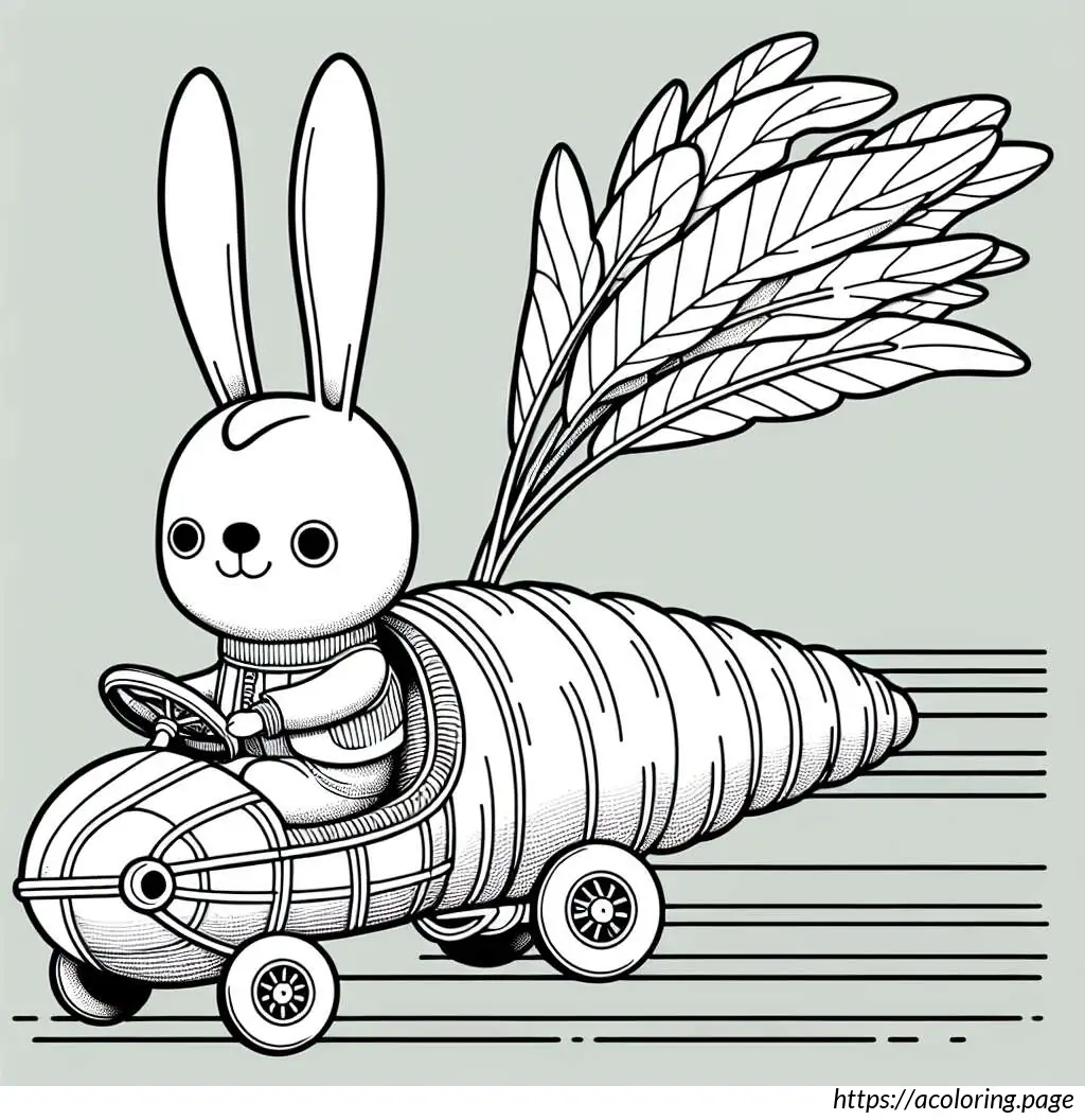 This image features a whimsical drawing of a rabbit driving a carrot-shaped car. The car, resembling an oversized carrot, has details like horizontal lines that pattern its surface mimicking the texture of a real carrot, a pointed end at the rear with foliage extending out, resembling the green top of a carrot.