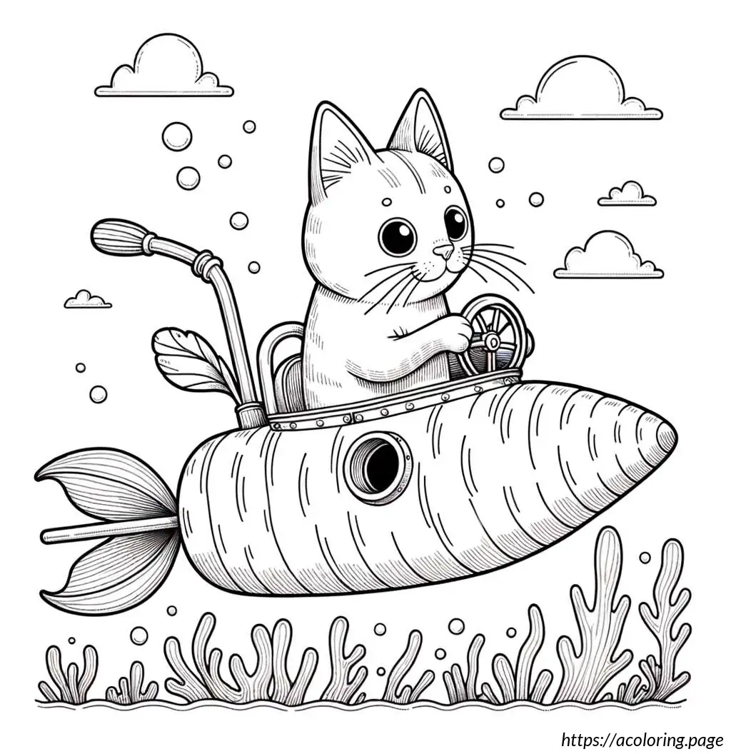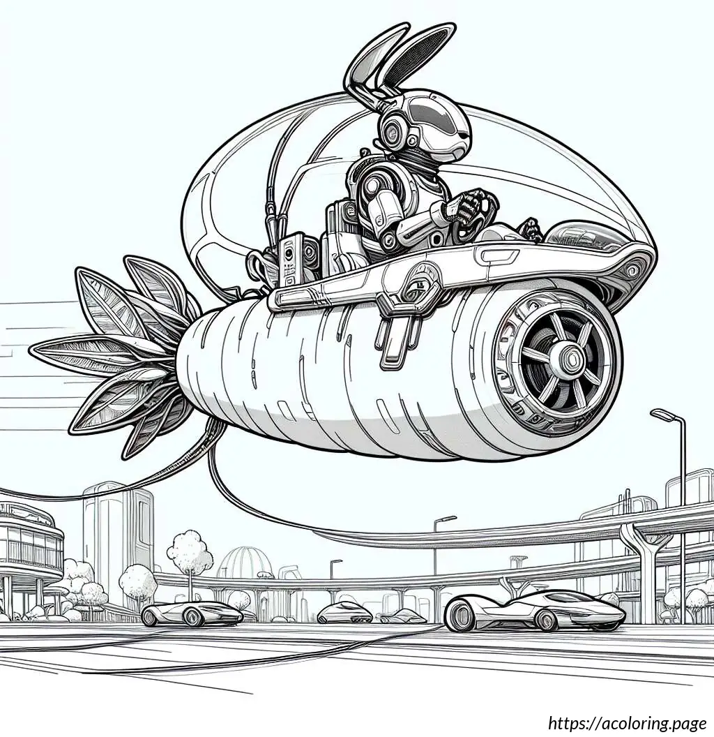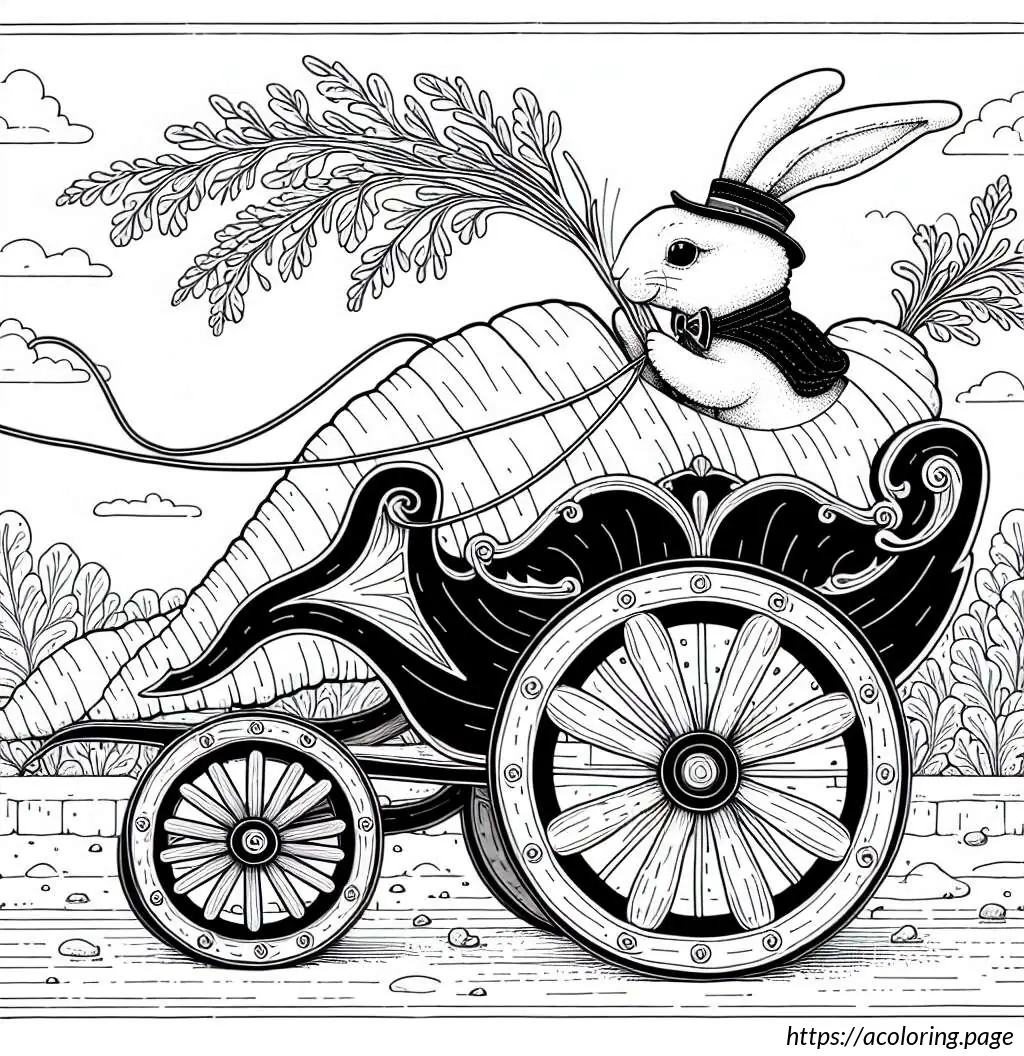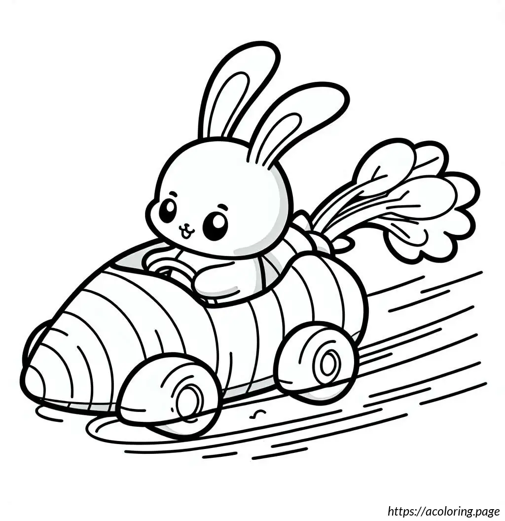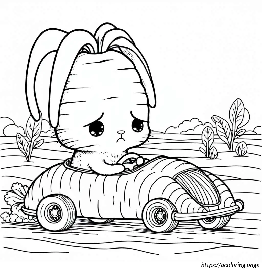 This image features a whimsical drawing of a rabbit driving a carrot-shaped car. The car, resembling an oversized carrot, has details like horizontal lines that pattern its surface mimicking the texture of a real carrot, a pointed end at the rear with foliage extending out, resembling the green top of a carrot.