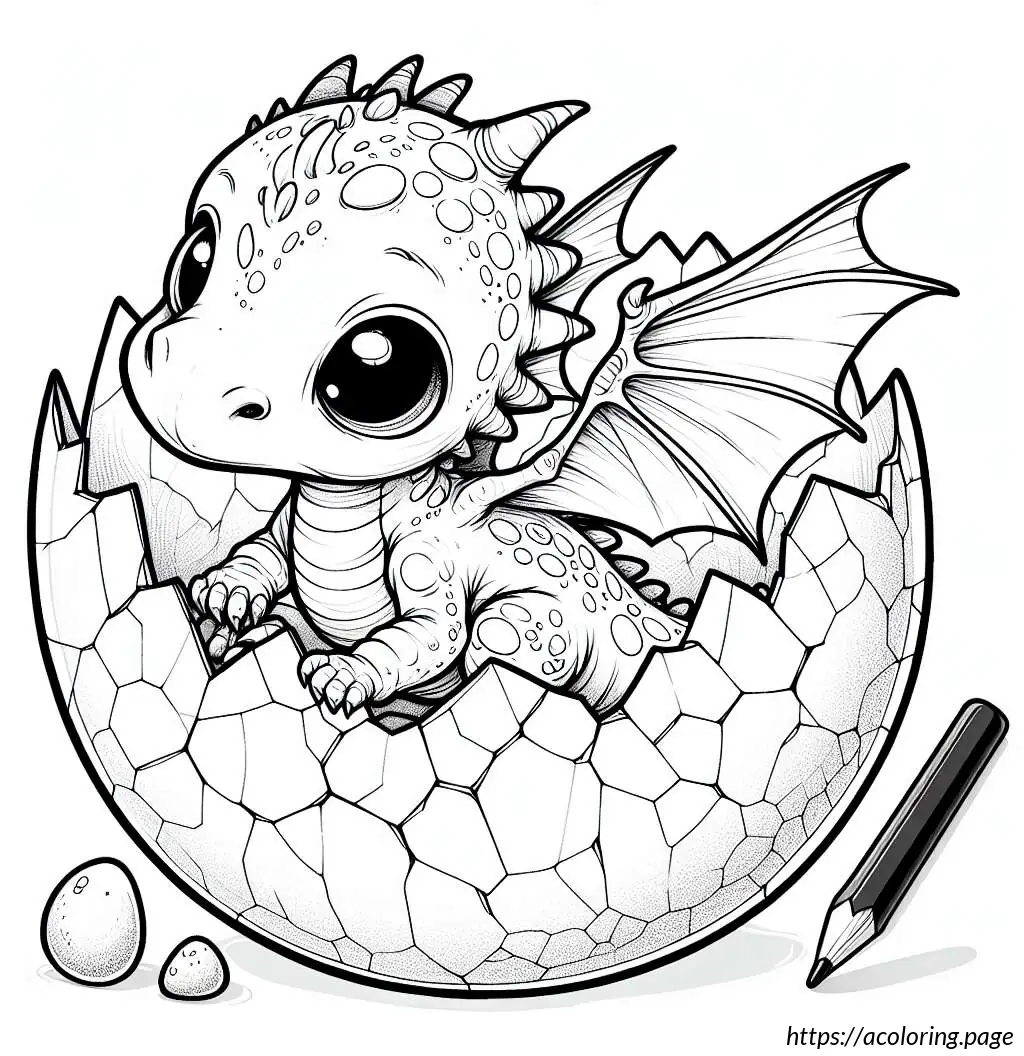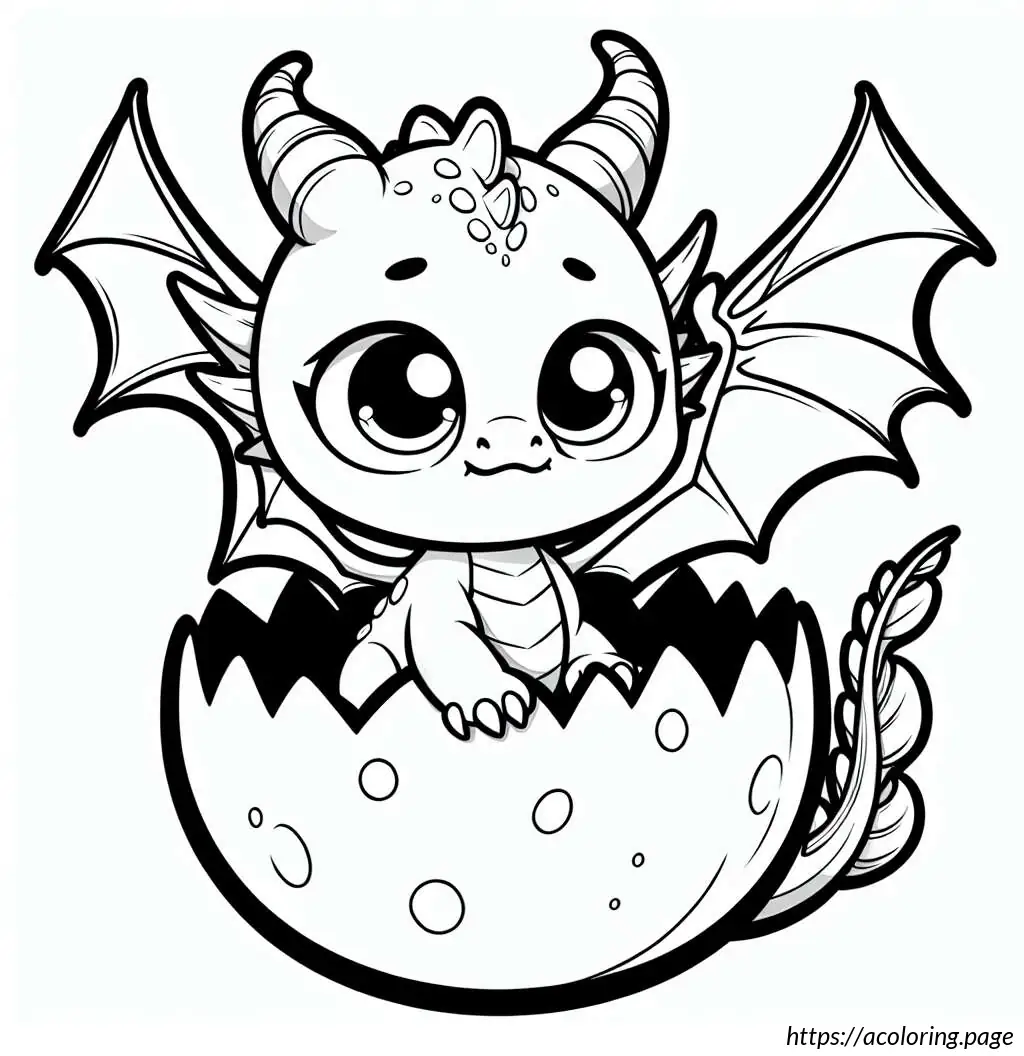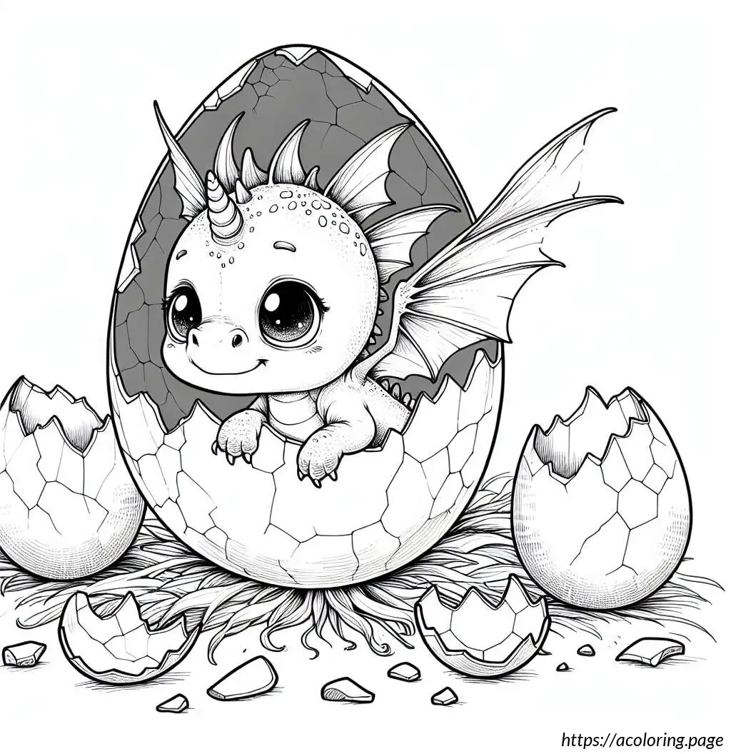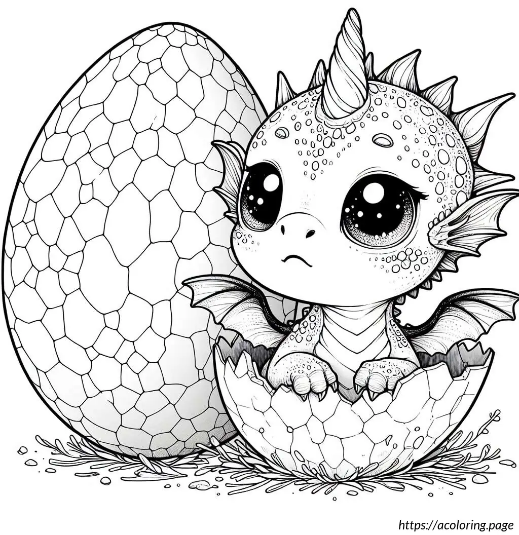 The image displays a cartoon-style drawing of a baby dragon emerging from an egg. The dragon has large, expressive eyes, a friendly expression, and is designed with several fantasy-like features. These include small horns on top of its head, a unicorn-like horn, pointed ears, and bat-like wings sprouting from its back. The scales along its neck and the texture of the egg shell are simply illustrated, suggesting a crackled eggshell from which the dragon is hatching. The clean lines and uncolored presentation suggest it could be used as a coloring page for children.