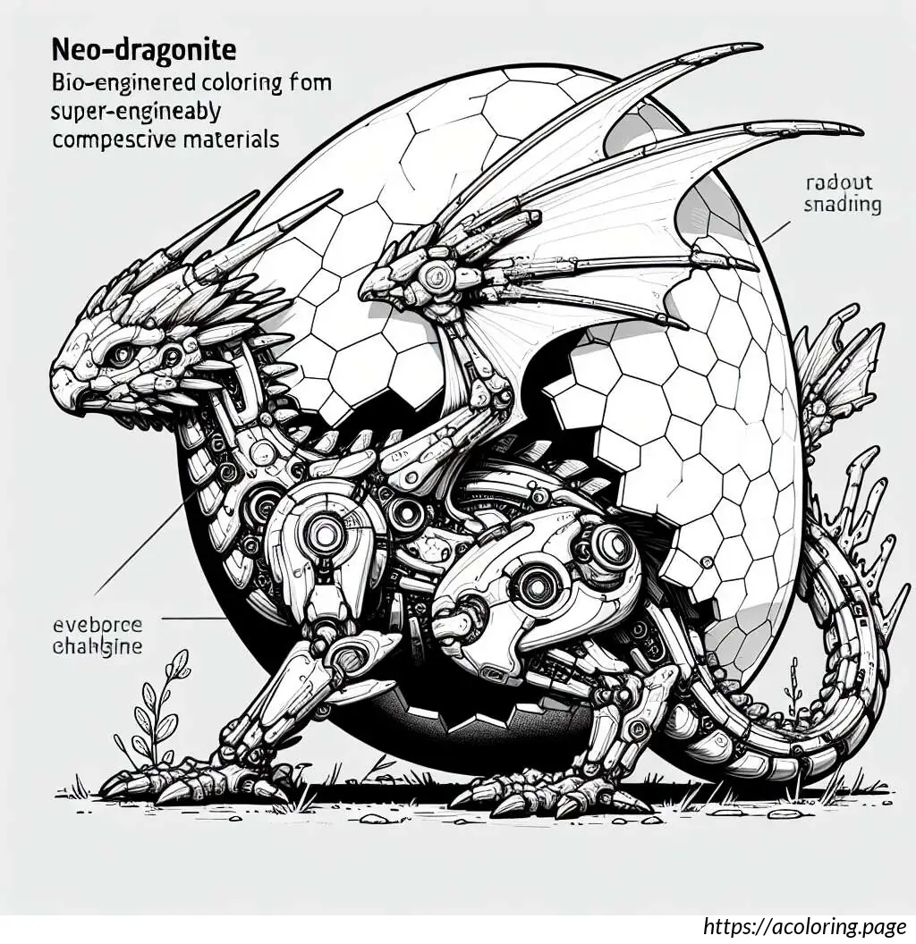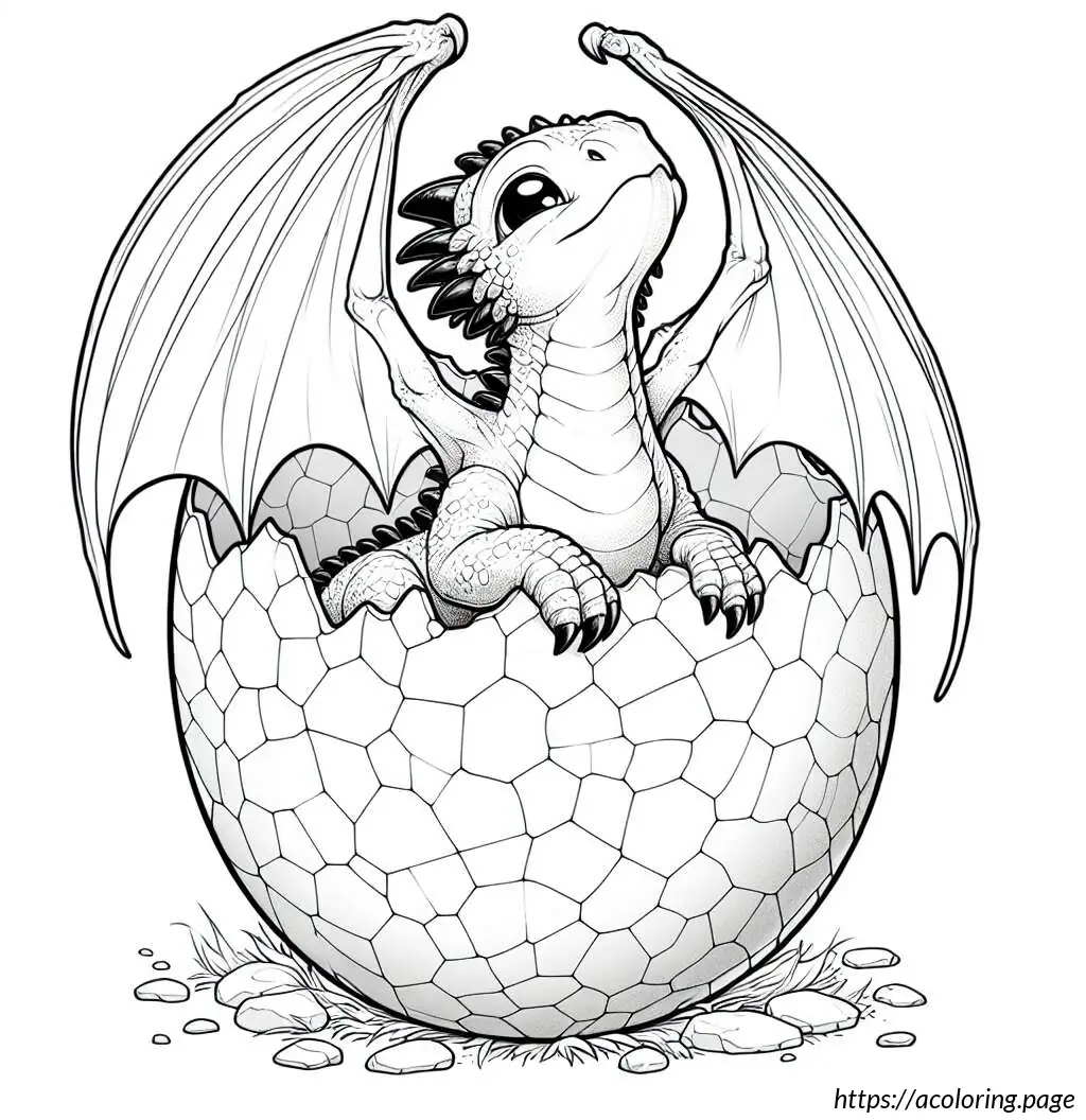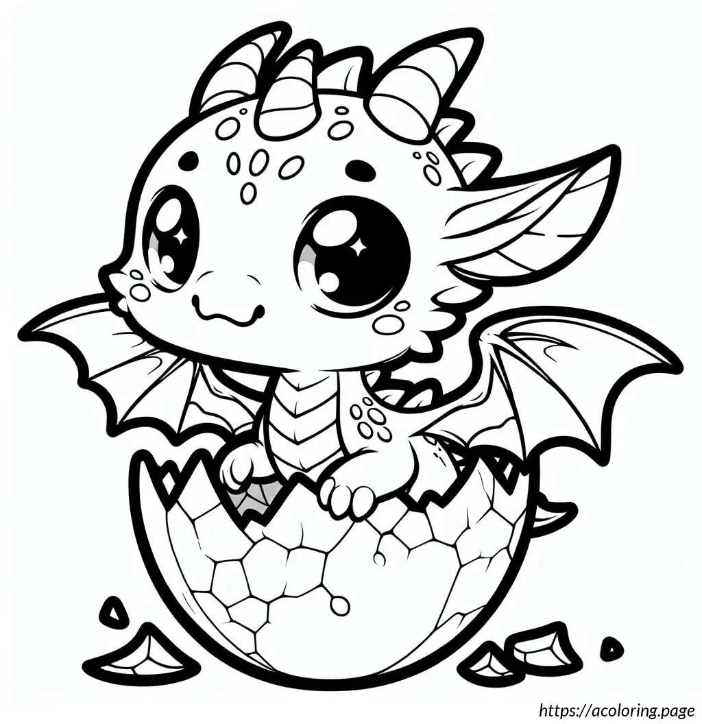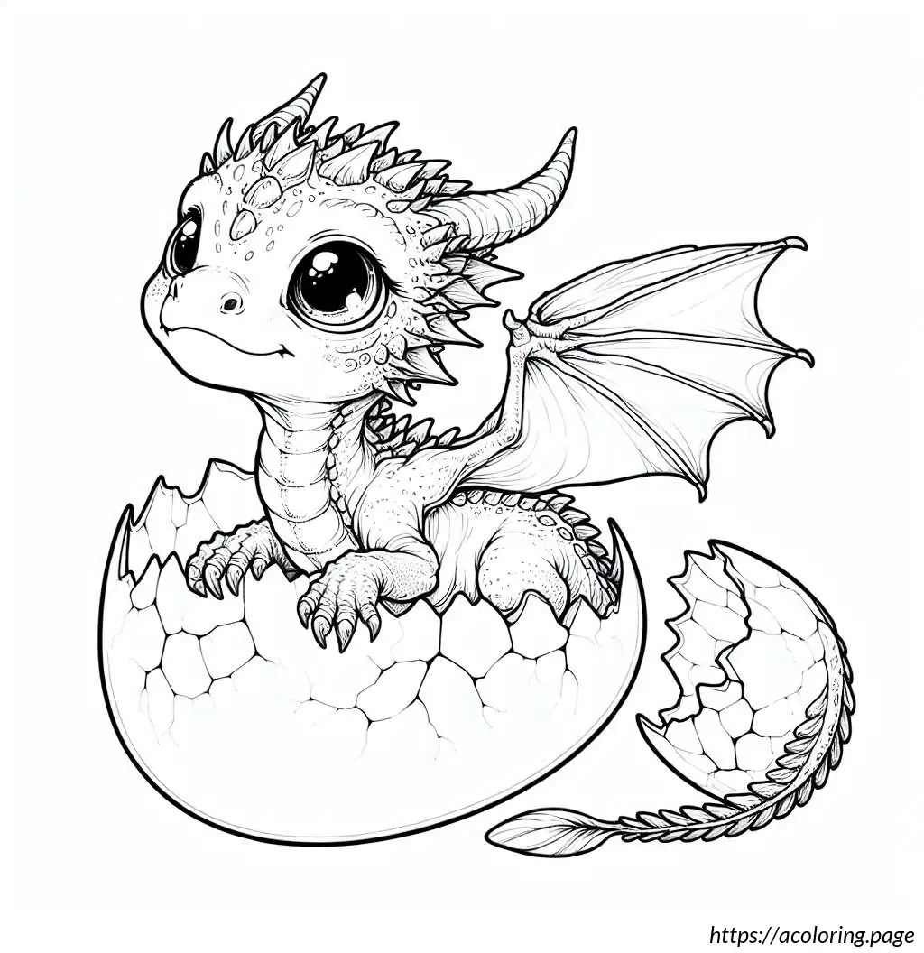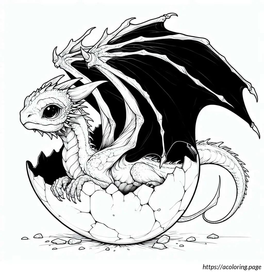 The image displays a cartoon-style drawing of a baby dragon emerging from an egg. The dragon has large, expressive eyes, a friendly expression, and is designed with several fantasy-like features. These include small horns on top of its head, a unicorn-like horn, pointed ears, and bat-like wings sprouting from its back. The scales along its neck and the texture of the egg shell are simply illustrated, suggesting a crackled eggshell from which the dragon is hatching. The clean lines and uncolored presentation suggest it could be used as a coloring page for children.