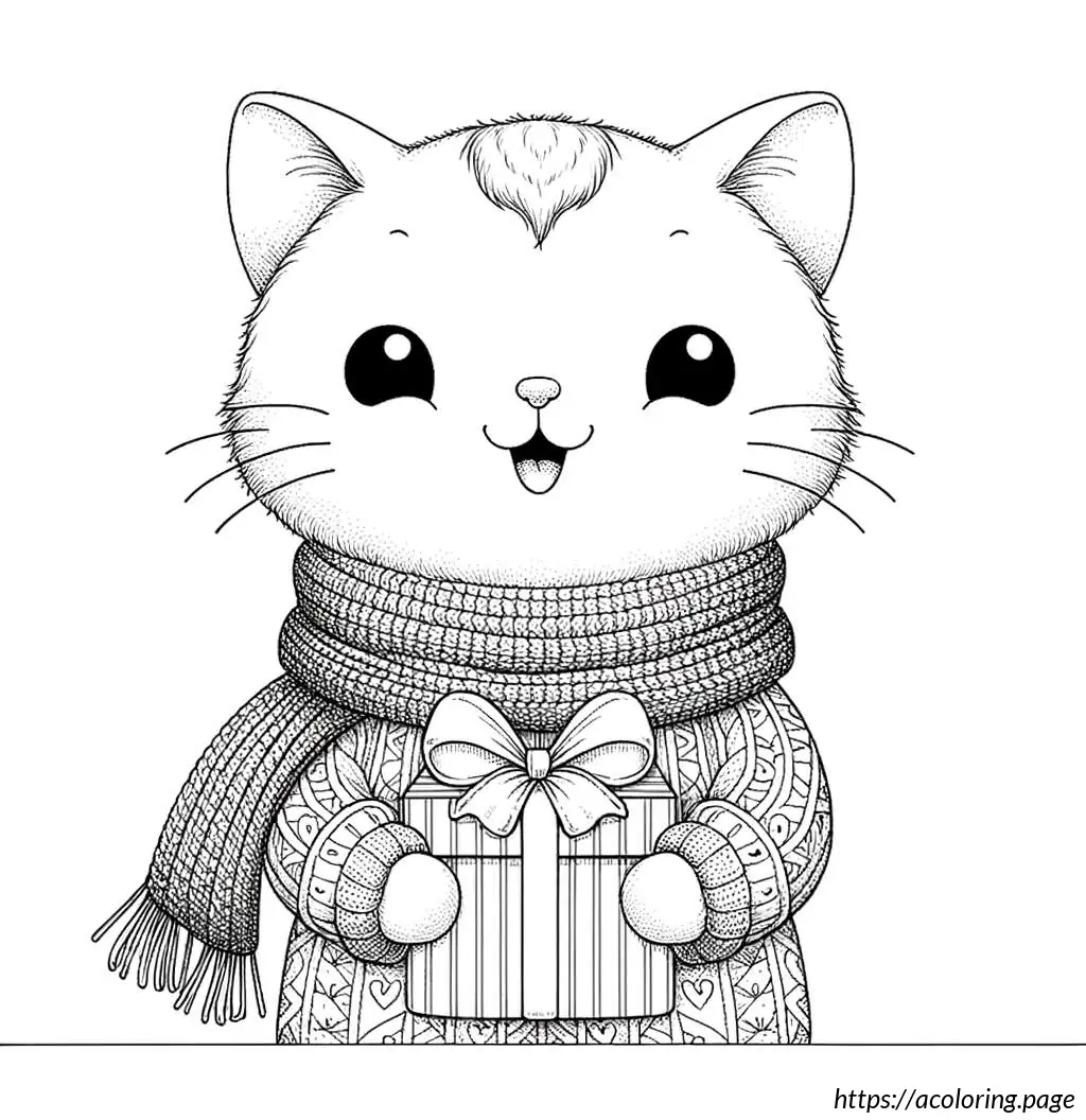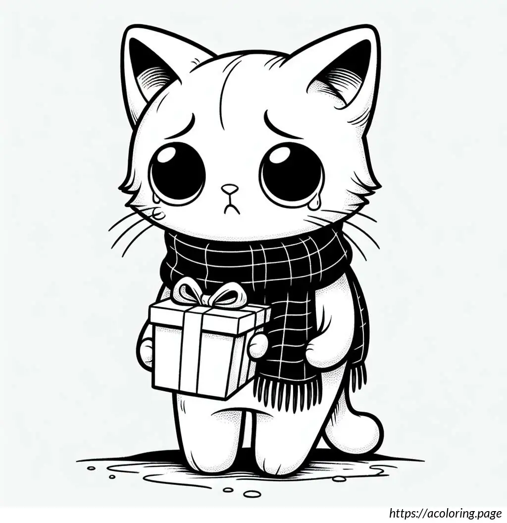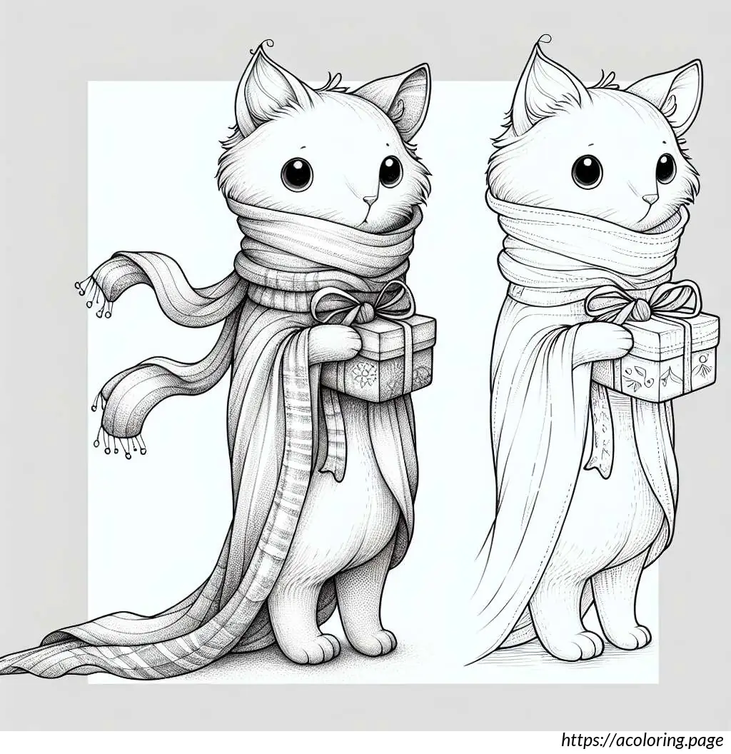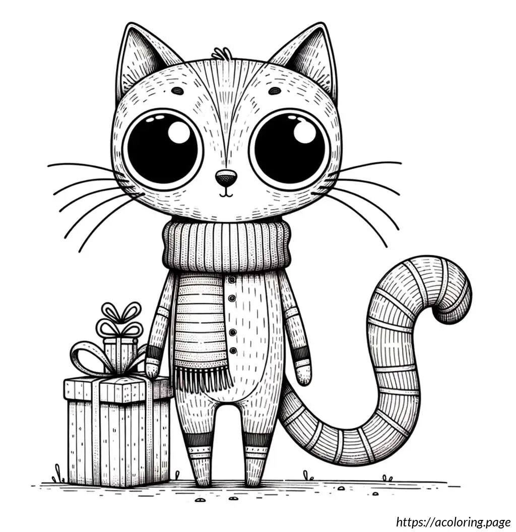 The image features a cartoon cat character in a black and white outline. This cat has a large triangular body and small limbs, with distinctive, large circular eyes and a small, triangular nose. The cat is wearing a scarf draped around its neck that falls on both sides of its body and is presenting a small gift box, tied with a ribbon. The cat’s expression appears content and it has its eyes slightly closed, perhaps implying a moment of giving or happiness. A tail curls out from behind the body, completing a typical feline silhouette. The drawing is simplistic and stylized, typical of a cartoon illustration.