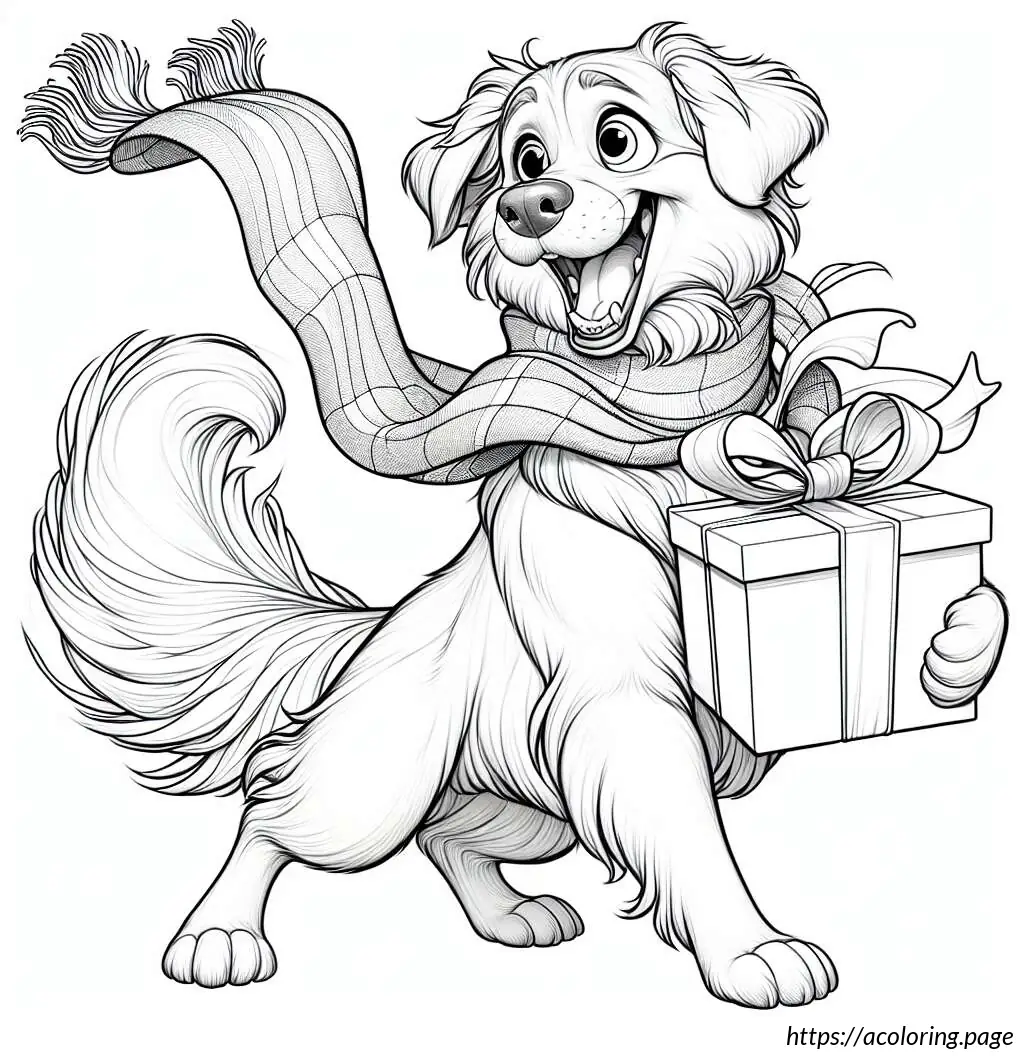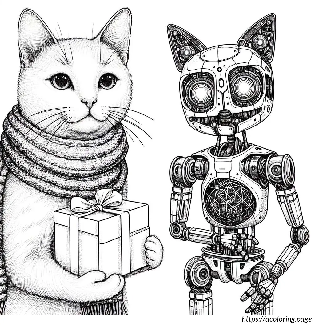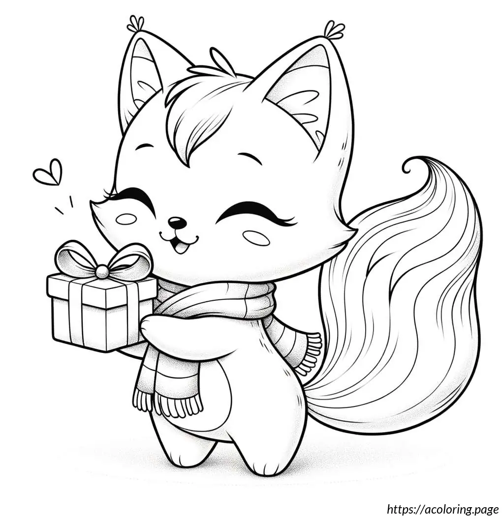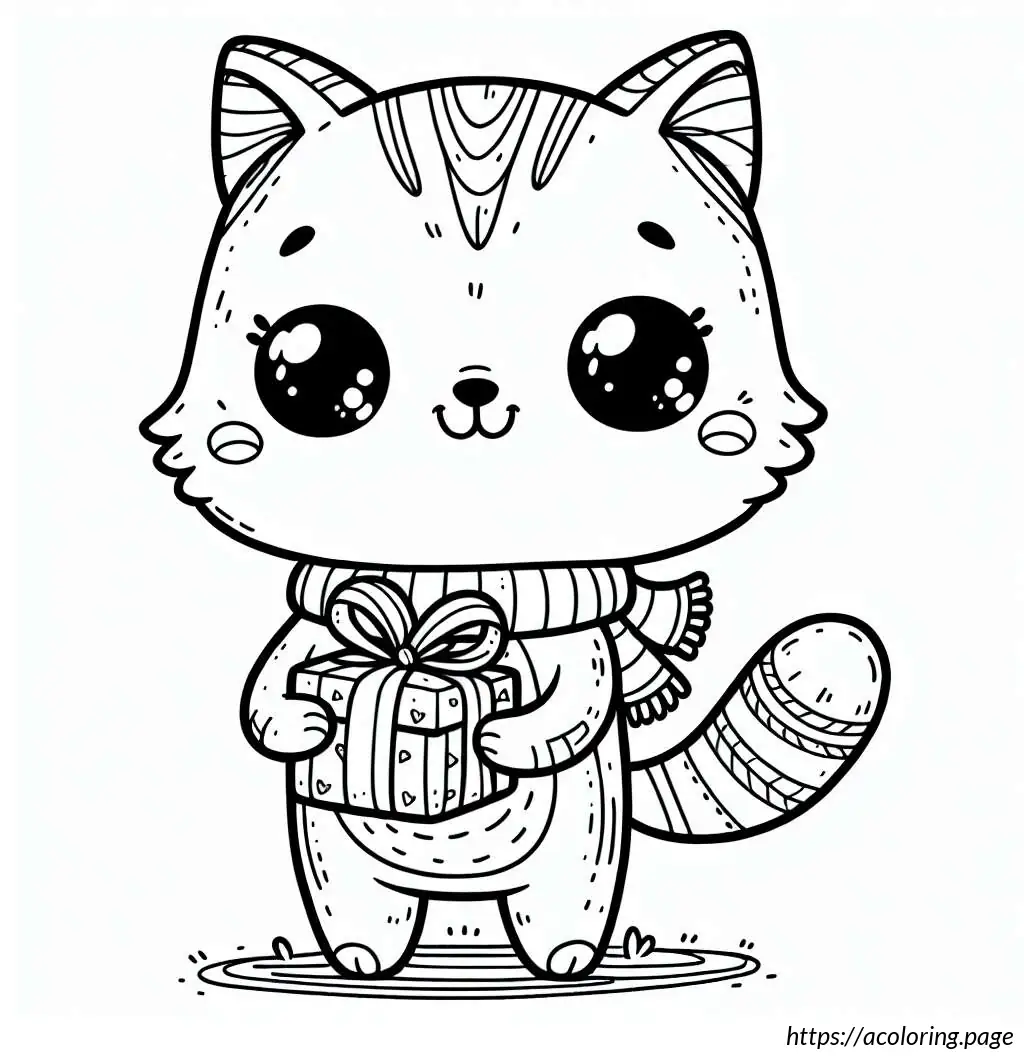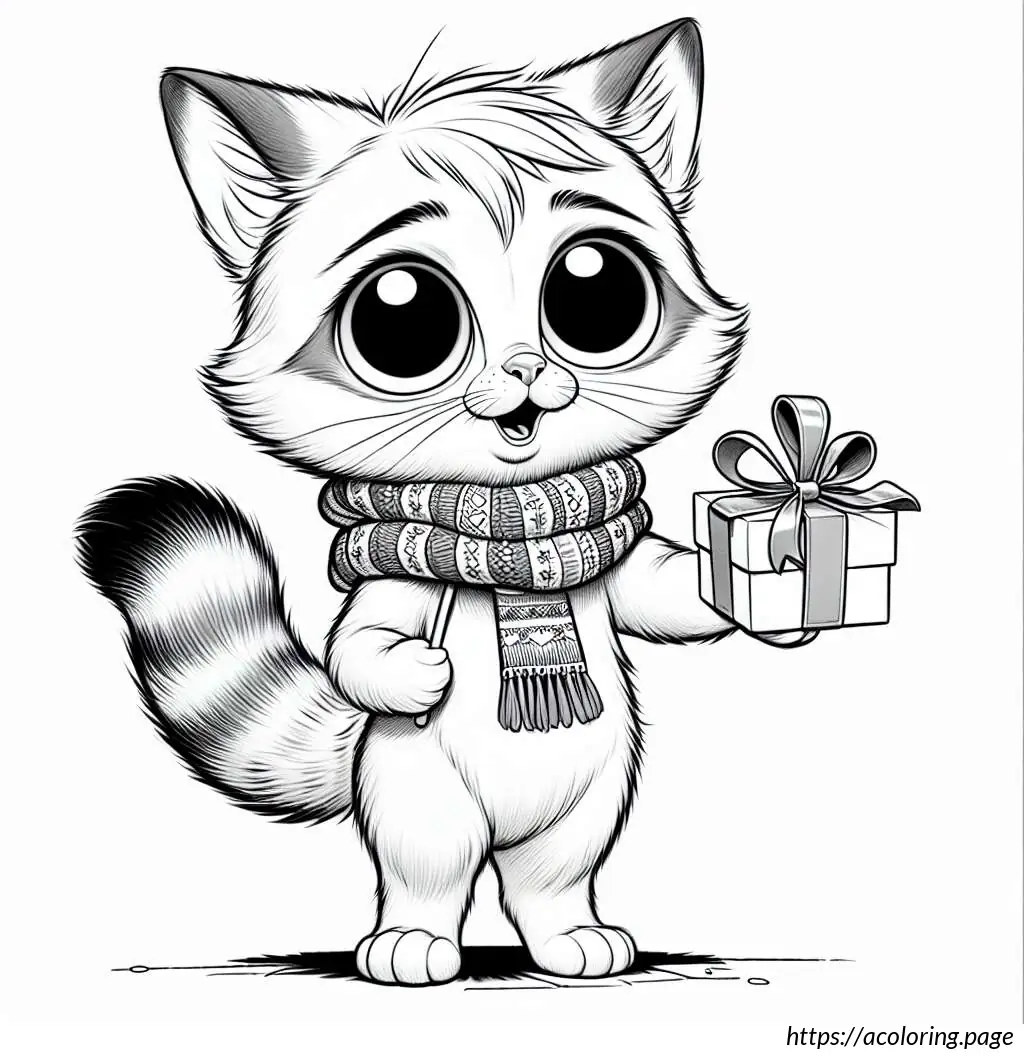 The image features a cartoon cat character in a black and white outline. This cat has a large triangular body and small limbs, with distinctive, large circular eyes and a small, triangular nose. The cat is wearing a scarf draped around its neck that falls on both sides of its body and is presenting a small gift box, tied with a ribbon. The cat’s expression appears content and it has its eyes slightly closed, perhaps implying a moment of giving or happiness. A tail curls out from behind the body, completing a typical feline silhouette. The drawing is simplistic and stylized, typical of a cartoon illustration.
