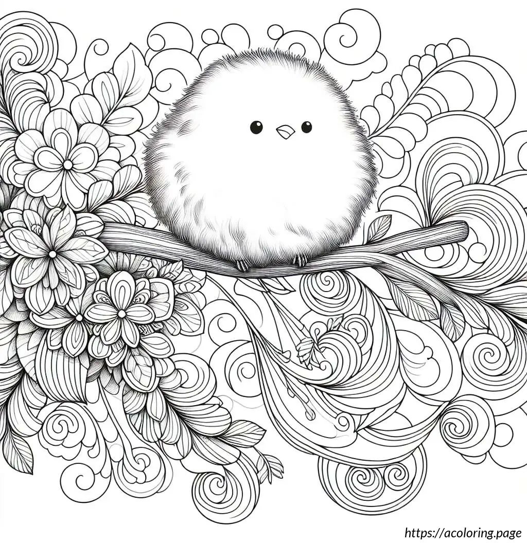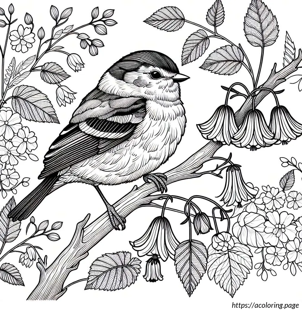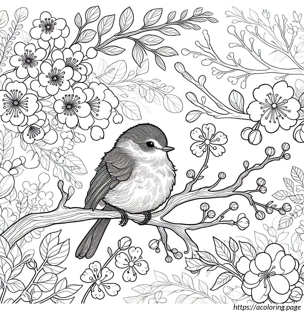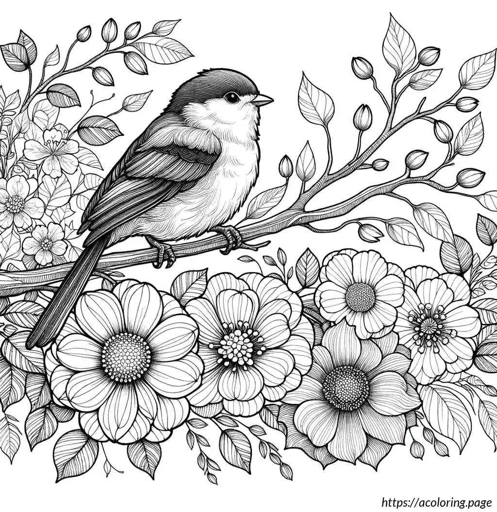 This image is a black-and-white line drawing suitable for coloring. It features a detailed depiction of nature elements. In the center of the image sits a plump, small bird on a branch, its feathers drawn with careful detail to suggest softness and layering. The bird is surrounded by lush flora, including a wide variety of flowers—some in full bloom and others still in buds—all attached to winding branches with leaves.