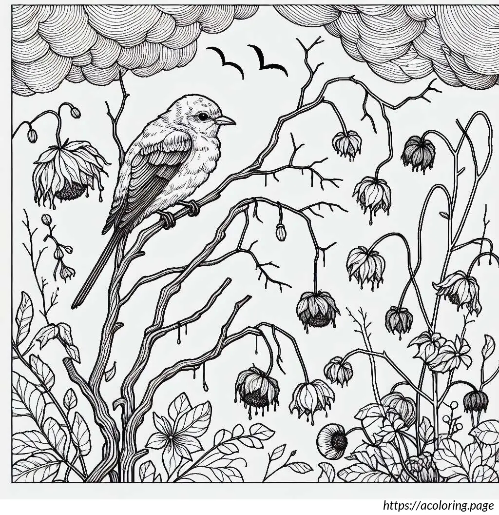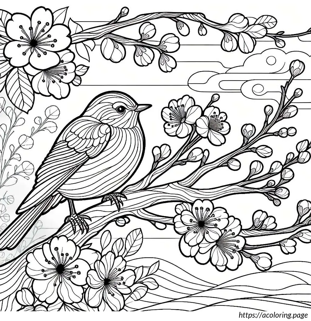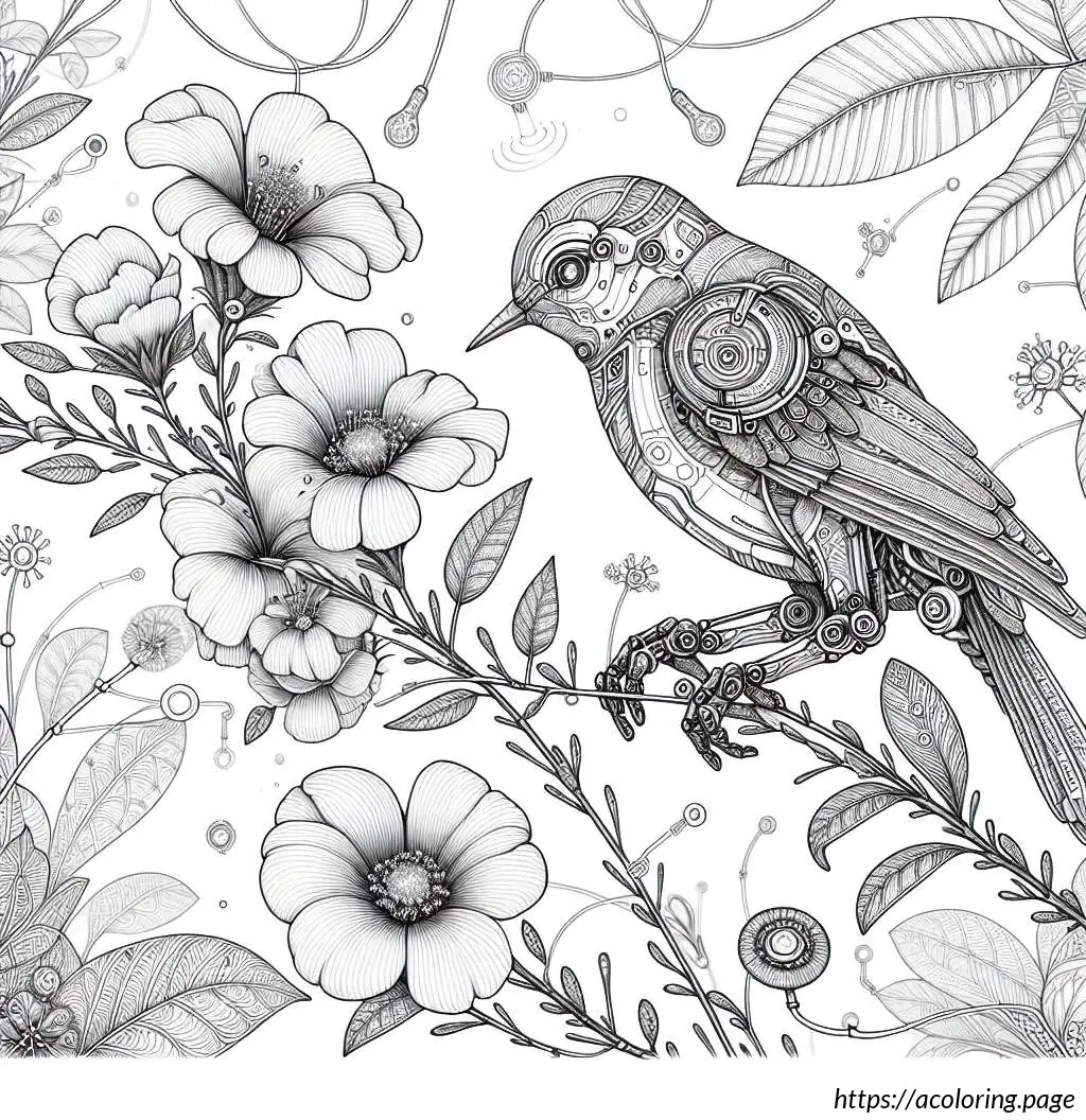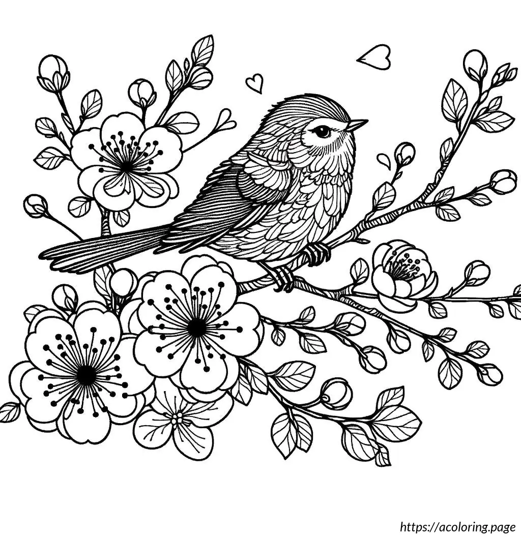This image is a black-and-white line drawing suitable for coloring. It features a detailed depiction of nature elements. In the center of the image sits a plump, small bird on a branch, its feathers drawn with careful detail to suggest softness and layering. The bird is surrounded by lush flora, including a wide variety of flowers—some in full bloom and others still in buds—all attached to winding branches with leaves.
