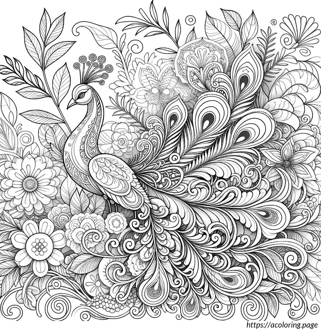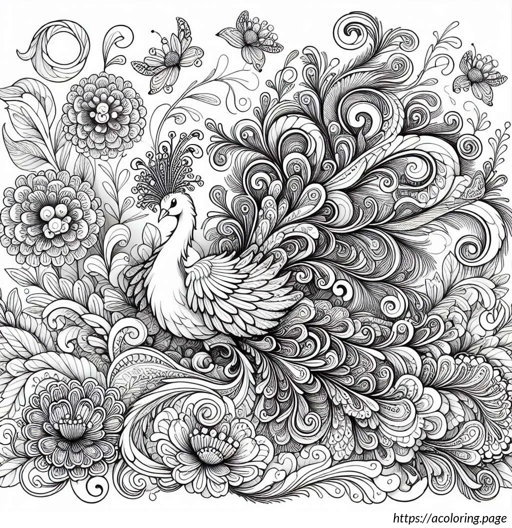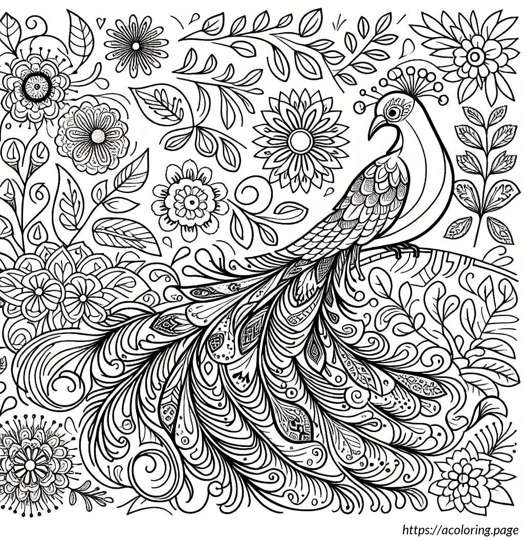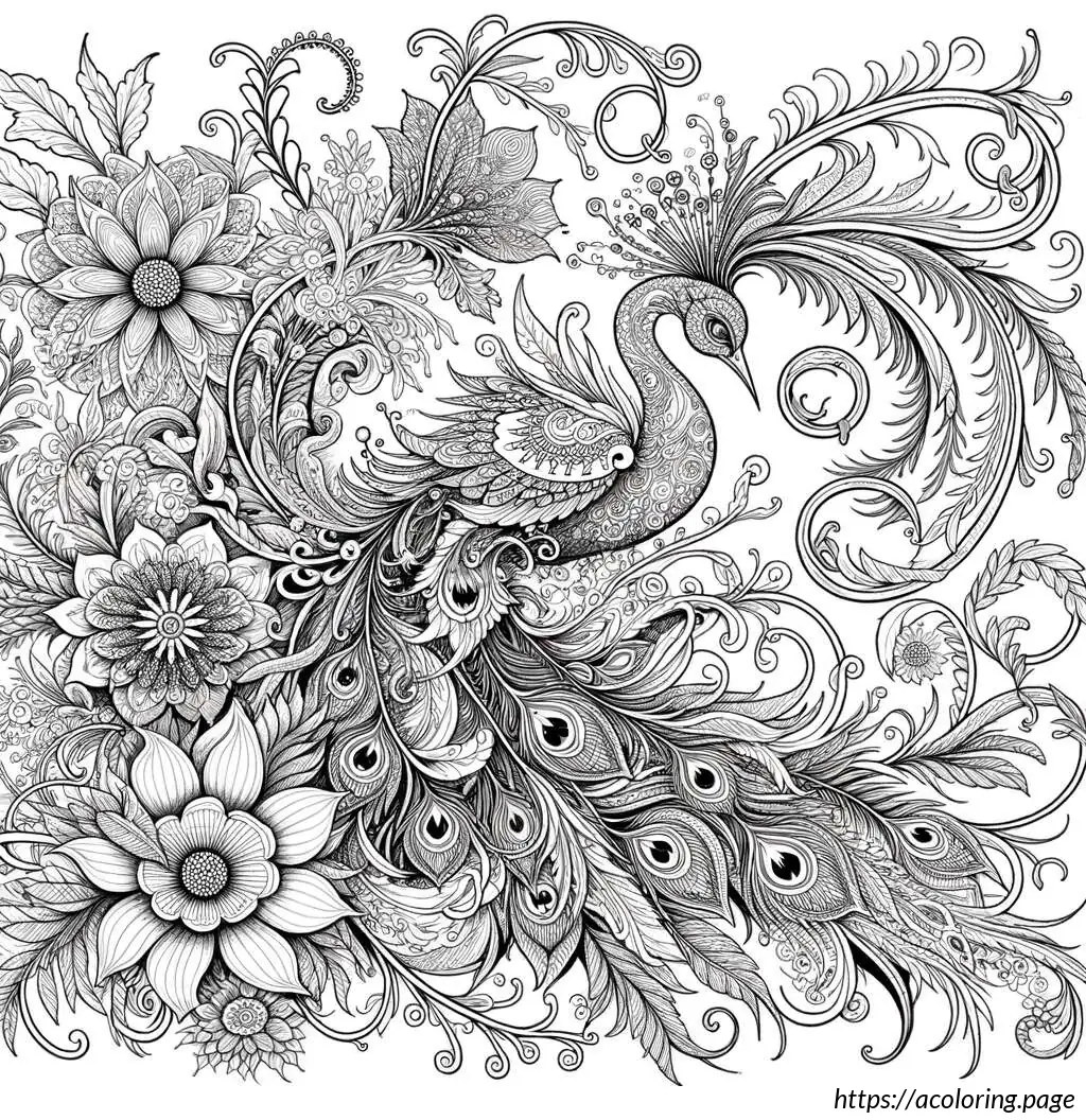 The image displays a beautifully intricate black and white coloring page, primarily featuring a stylized, ornate bird, possibly a peacock, amidst a lush arrangement of flowers and foliage. The bird is adorned with elaborate detailing including swirls, floral patterns, and feather-like motifs. Surrounding the bird are various types of flowers โ both large blooms and smaller, detailed ones โ alongside cascading leaves and swirling tendrils that add to the overall whimsical and artistic composition of the design. This image is likely designed for coloring activities, suitable for both children and adults, encouraging creativity and relaxation.