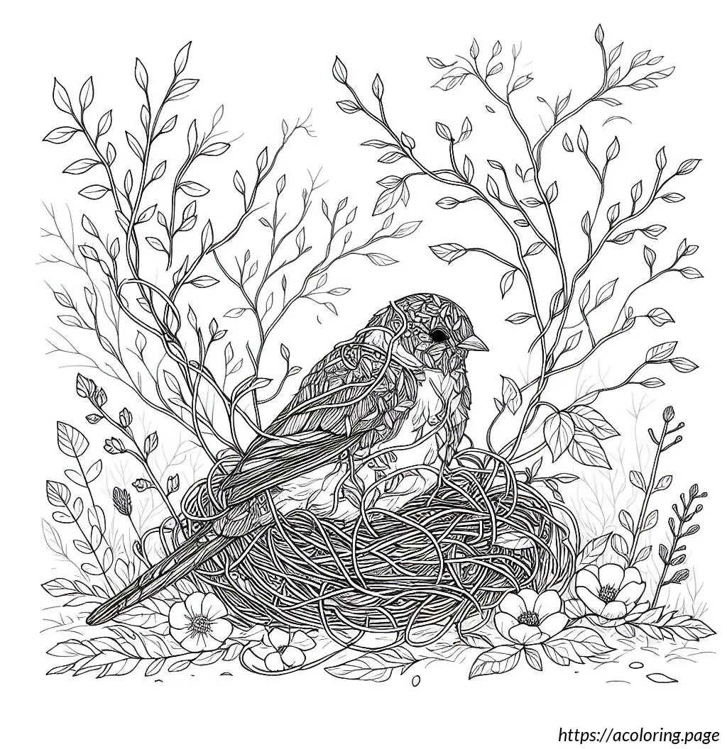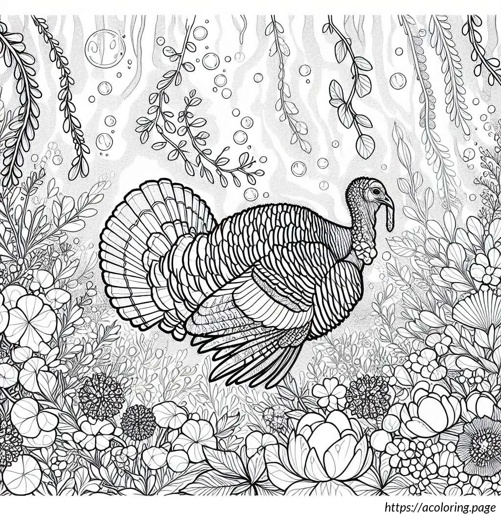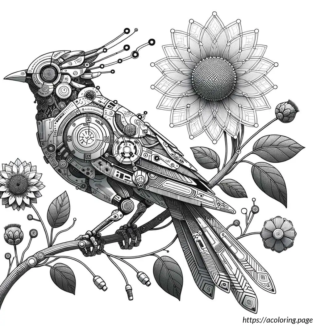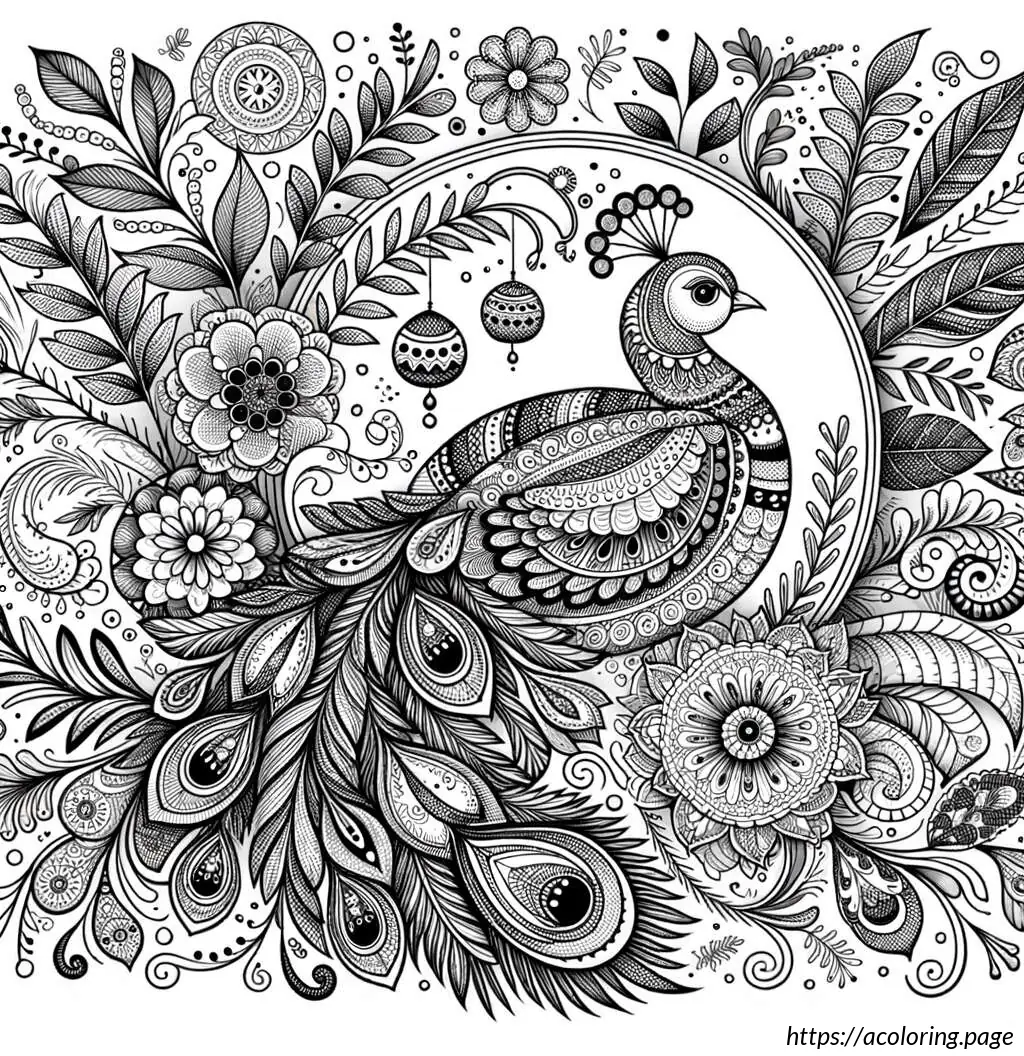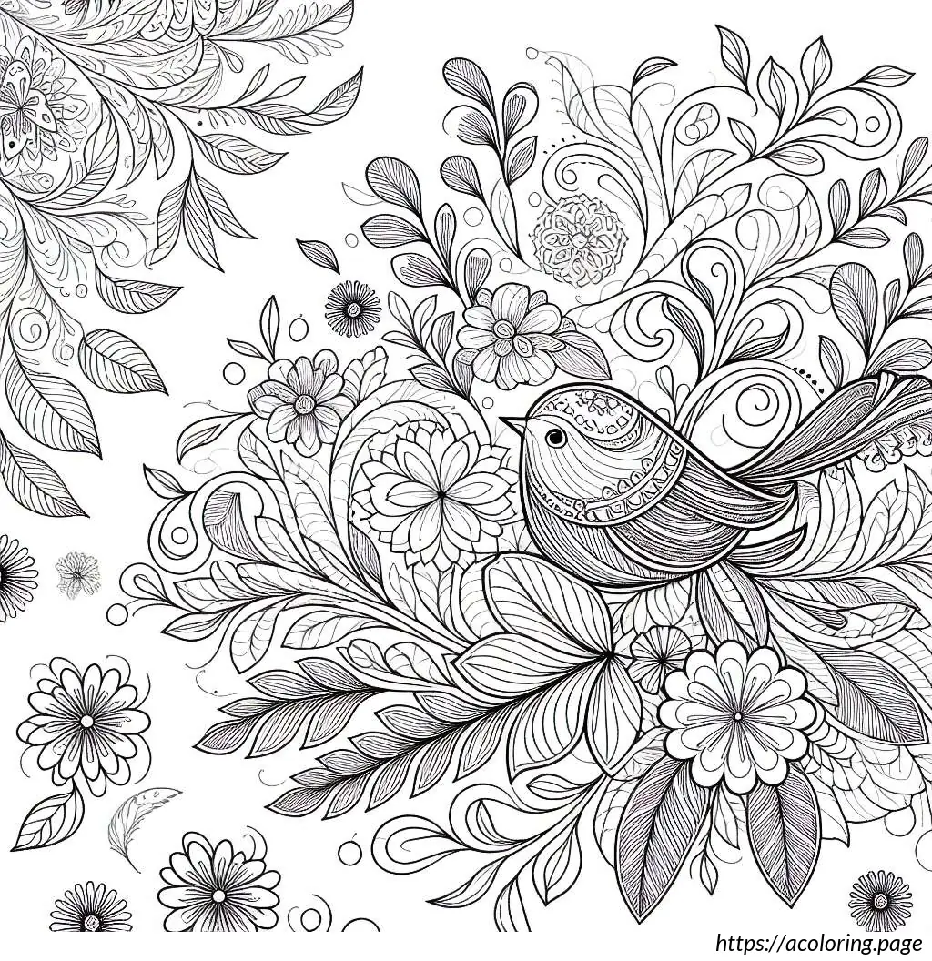 The image displays a beautifully intricate black and white coloring page, primarily featuring a stylized, ornate bird, possibly a peacock, amidst a lush arrangement of flowers and foliage. The bird is adorned with elaborate detailing including swirls, floral patterns, and feather-like motifs. Surrounding the bird are various types of flowers โ both large blooms and smaller, detailed ones โ alongside cascading leaves and swirling tendrils that add to the overall whimsical and artistic composition of the design. This image is likely designed for coloring activities, suitable for both children and adults, encouraging creativity and relaxation.