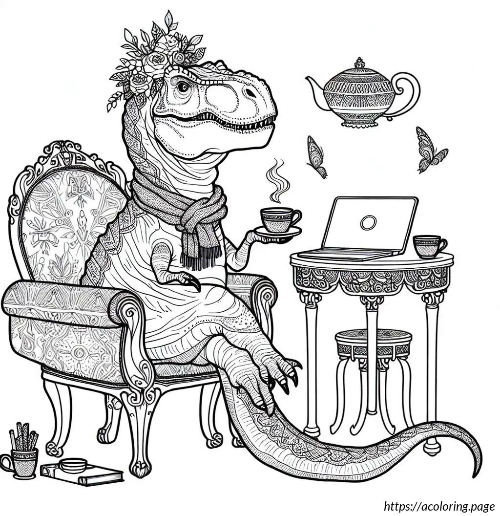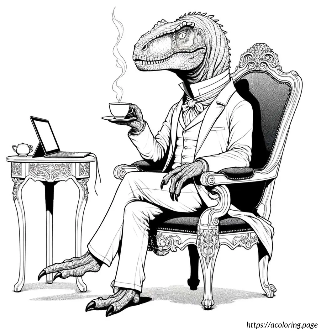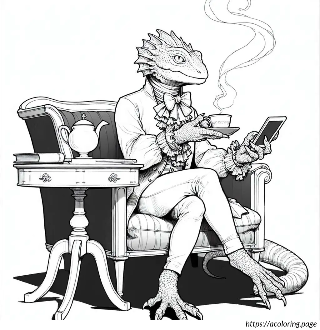 This image features an anthropomorphic lizard-like creature sitting in a classical armchair, portraying a relaxed and possibly contemplative pose. The creature is dressed in a detailed human-like outfit consisting of a frilled shirt with a bowtie. It is holding a cup from which steam is rising, indicating a hot beverage, likely tea or coffee, and is staring, seemingly deep in thought, towards a small computer or digital device placed on a round table next to the chair.