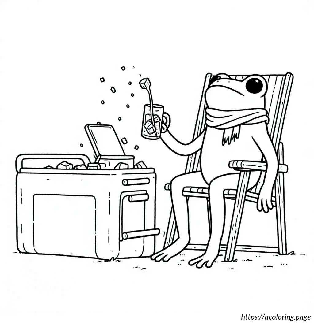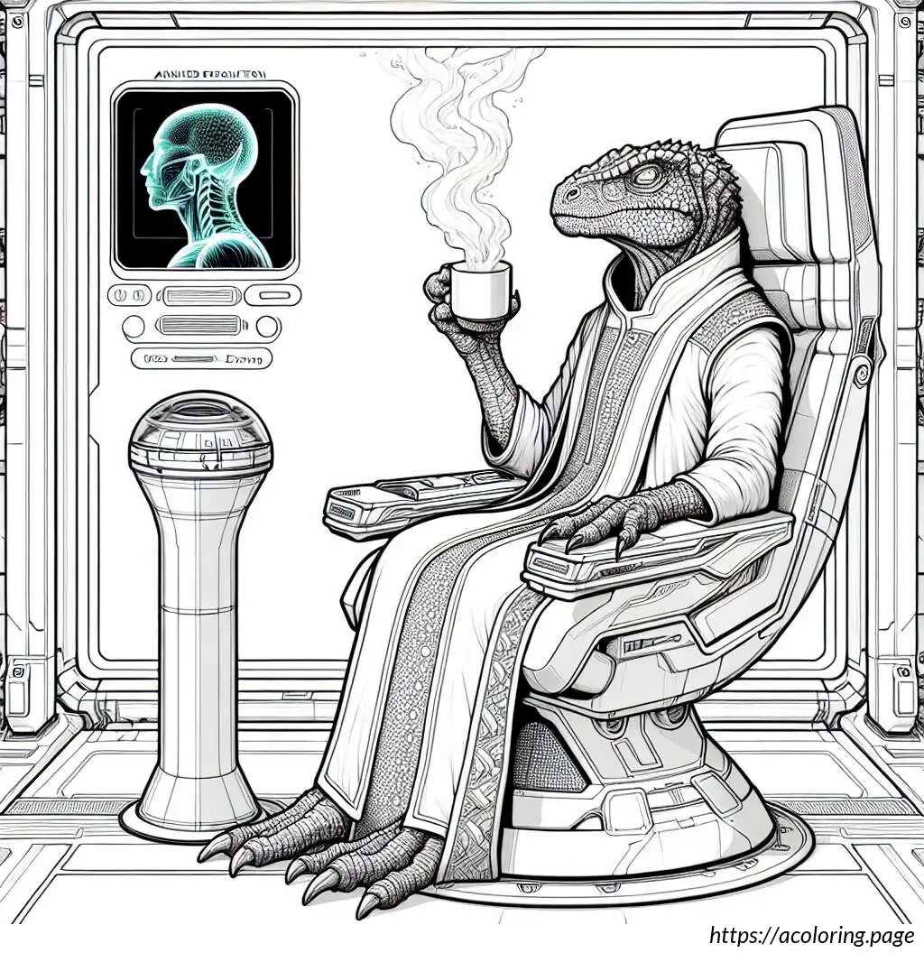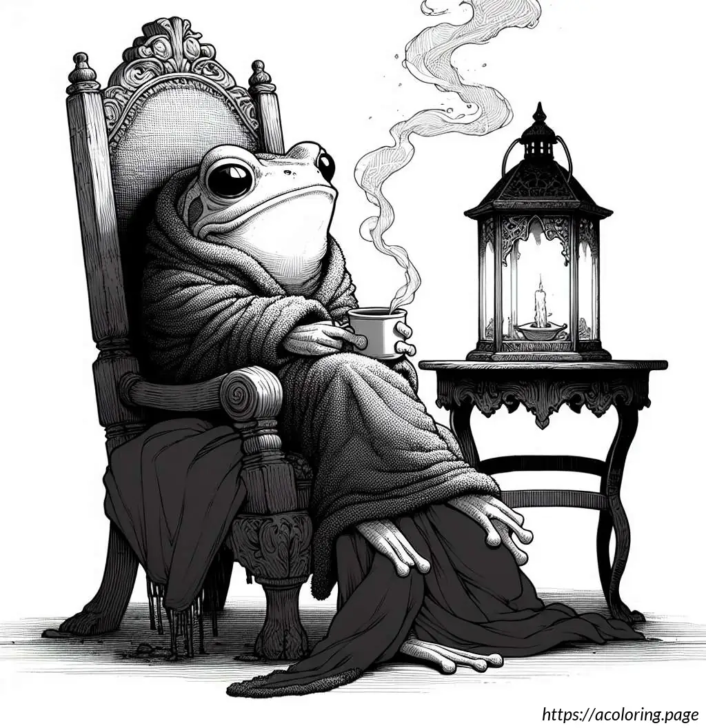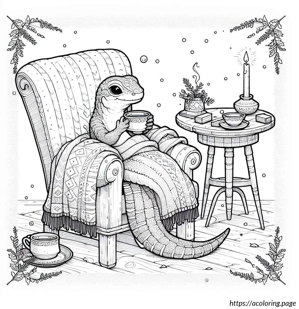 The creature’s legs are elegantly crossed, and one can see a cozy blanket draped over its lap and legs. The scene suggests a setting of leisure and comfort, perhaps within a home environment, conveying an atmosphere of peaceful solitude and modern convenience melding with traditional style. The look and feel of the drawing are cartoonish, marked by clear and bold black outlines, making it visually engaging and whimsical.