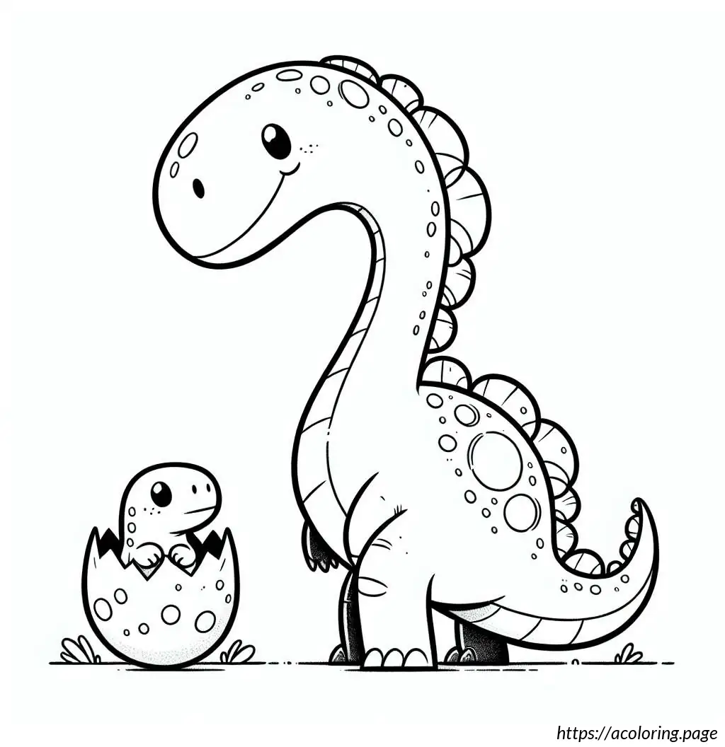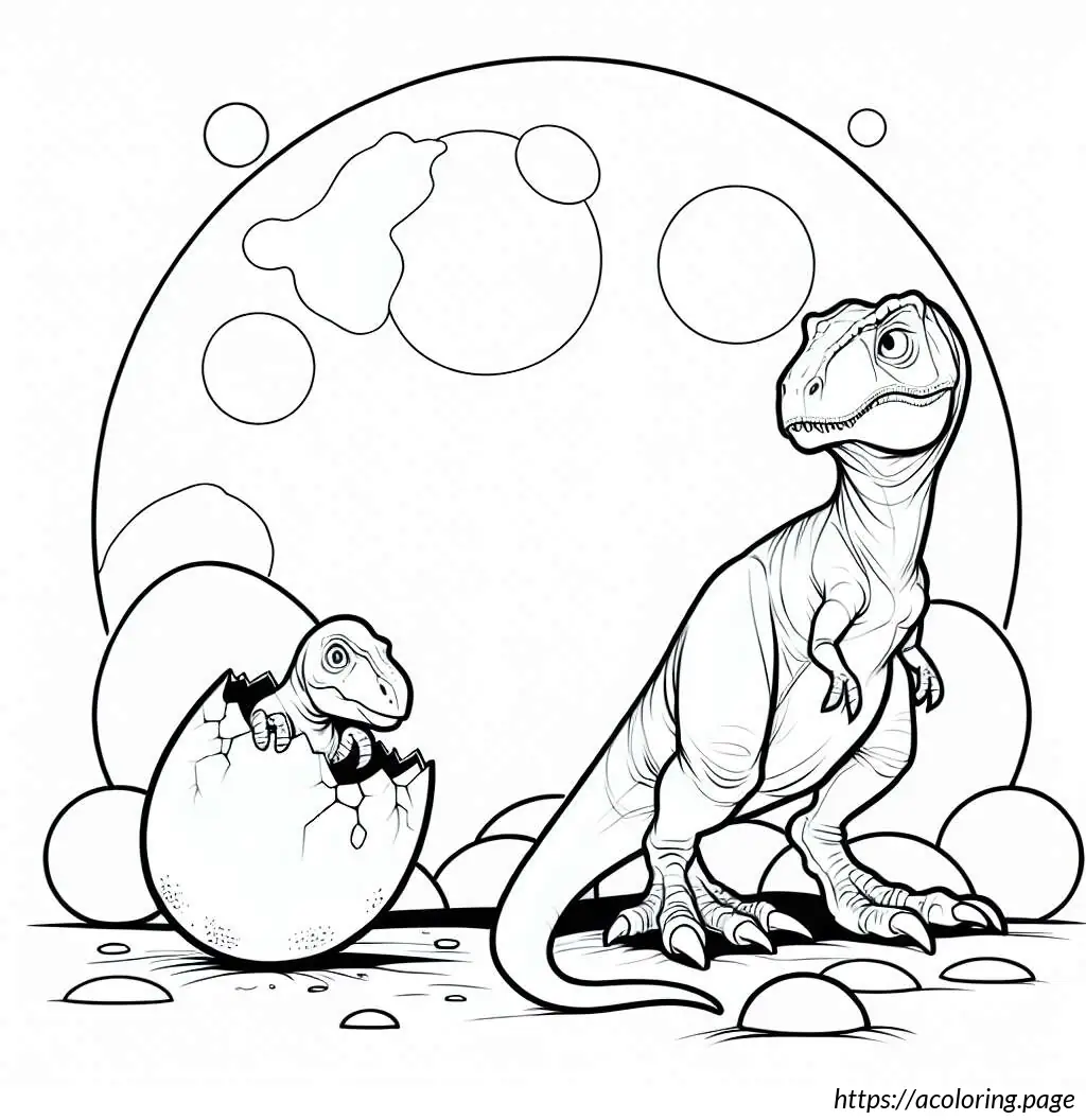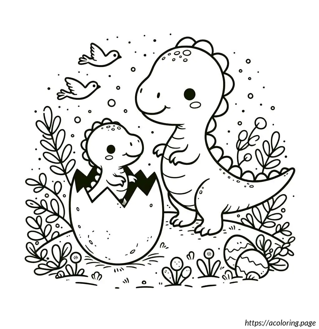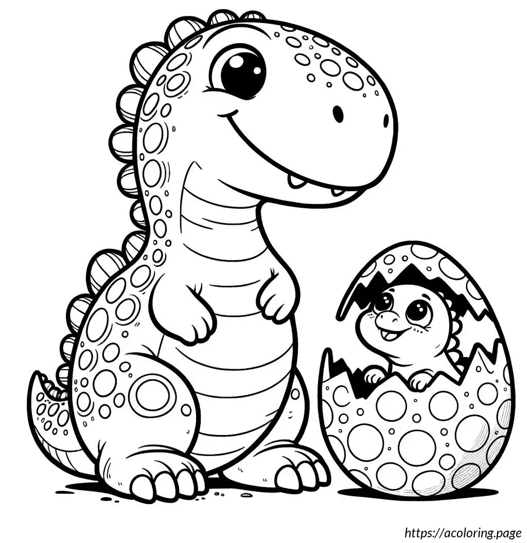 The smaller dinosaur is emerging from an egg, depicted with half of its body visible, including its head and one arm. It has a similar jagged pattern along its back and a simple facial expression with large eyes, showing a look of curiosity or surprise. Both dinosaurs feature a cartoonish design, indicating the illustration is likely aimed at children, possibly for a coloring activity or educational purposes. The drawing is in black and white, with bold lines and clear, distinct sections that would be easy to color.