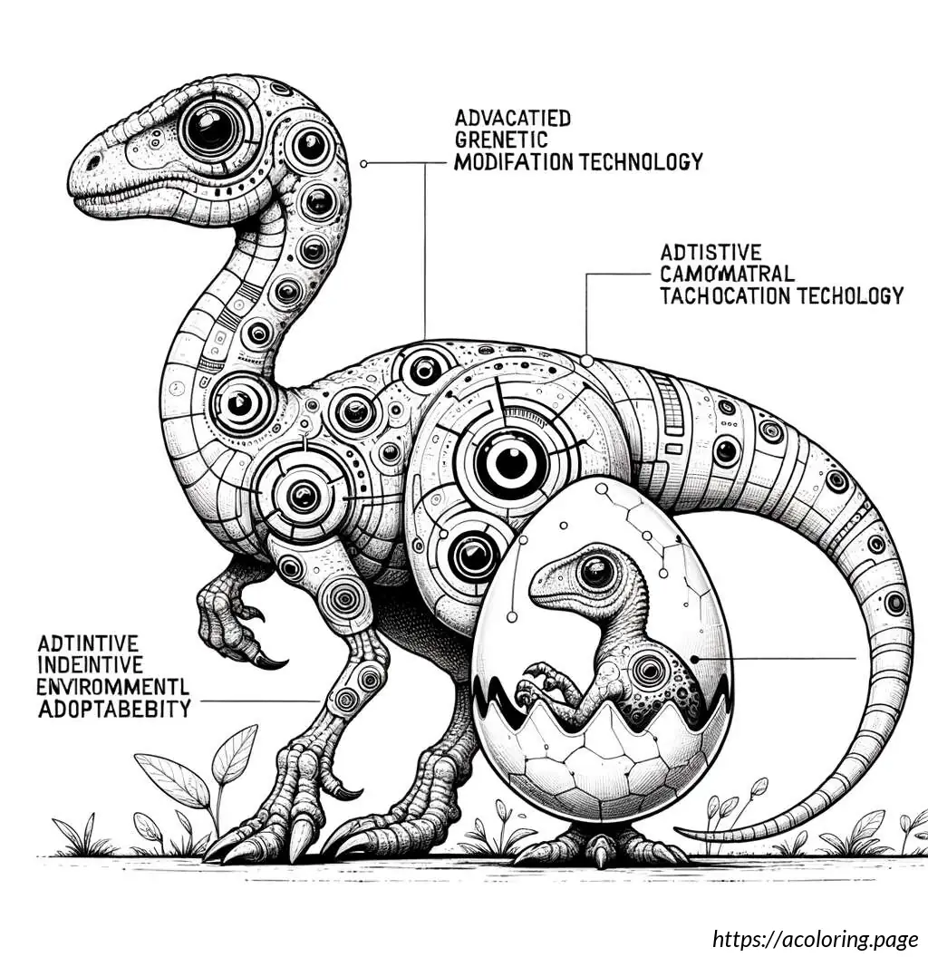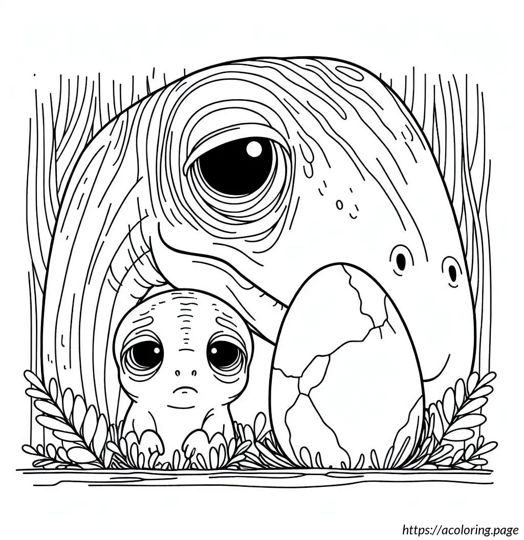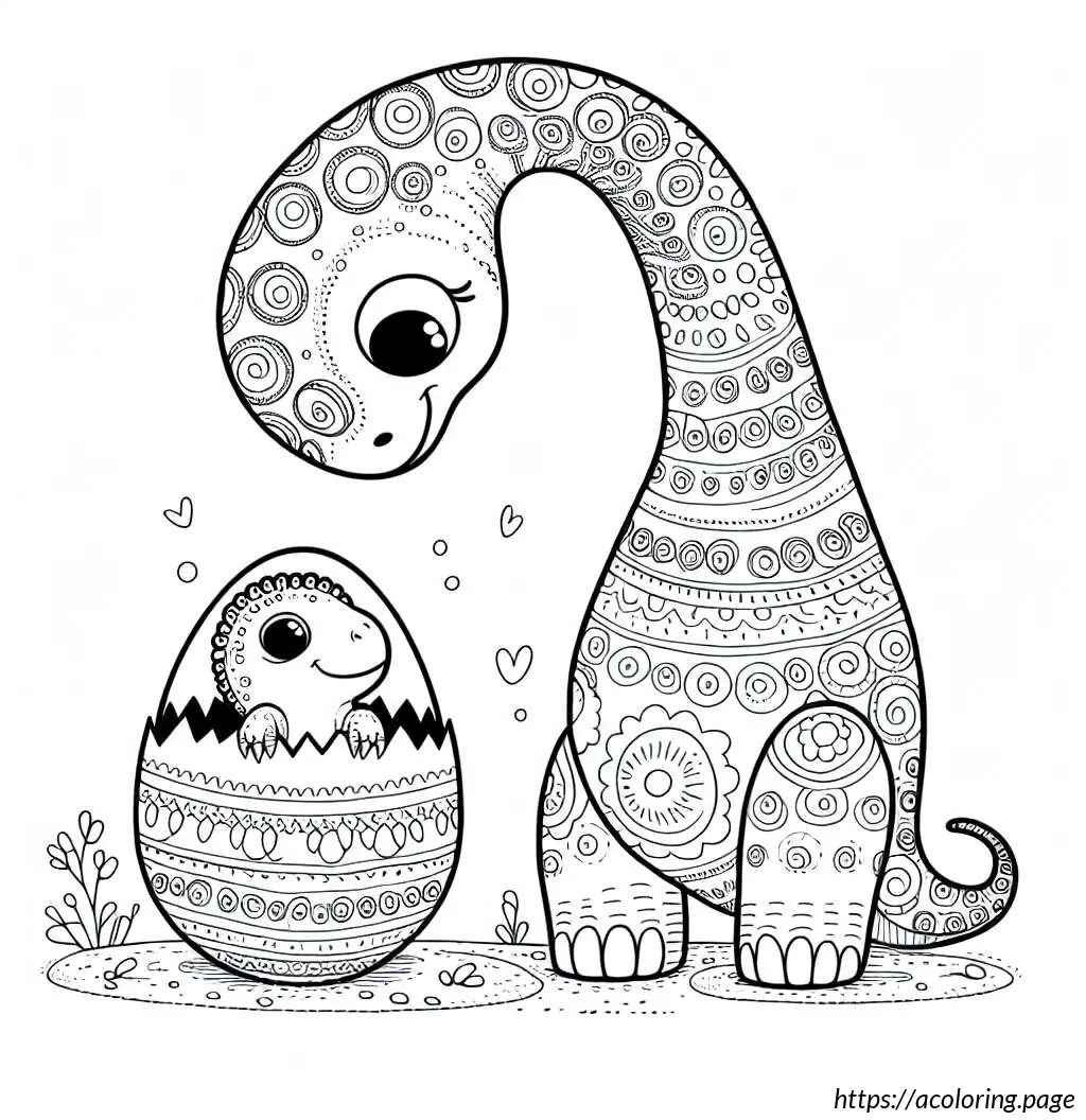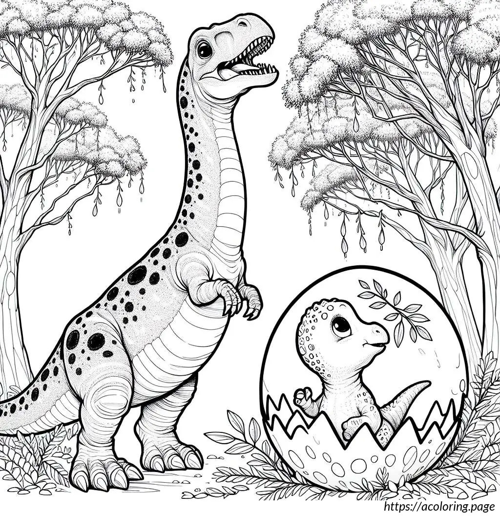 The smaller dinosaur is emerging from an egg, depicted with half of its body visible, including its head and one arm. It has a similar jagged pattern along its back and a simple facial expression with large eyes, showing a look of curiosity or surprise. Both dinosaurs feature a cartoonish design, indicating the illustration is likely aimed at children, possibly for a coloring activity or educational purposes. The drawing is in black and white, with bold lines and clear, distinct sections that would be easy to color.