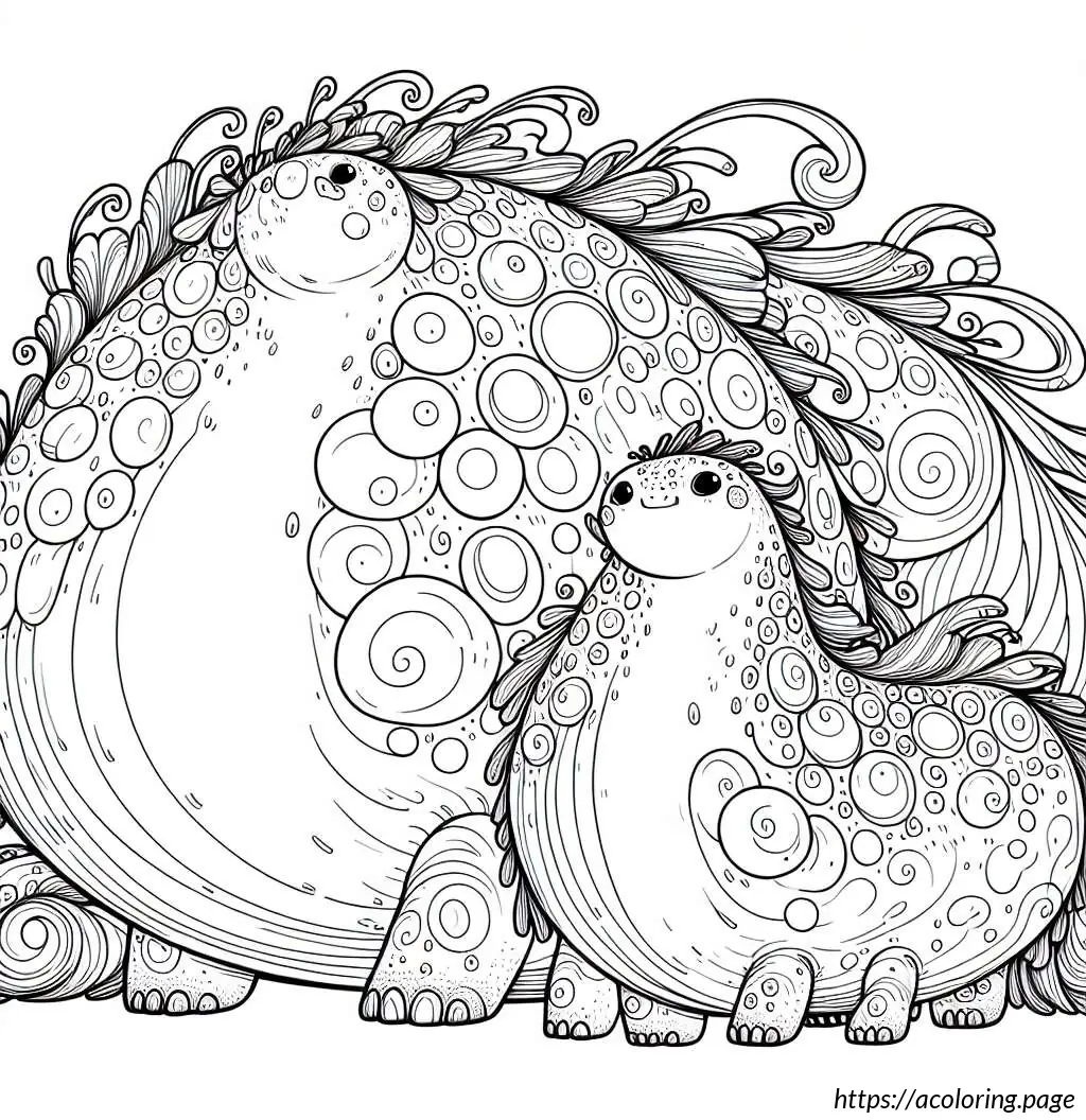 The image features a delightful scene of two cartoon-style dinosaurs. The larger dinosaur, which appears friendly and welcoming, has a rounded body with a series of large spots or circles and a jagged, triangular pattern running down its back. It has a long neck and a smiling face, and its eyes are directed downwards towards the smaller dinosaur.