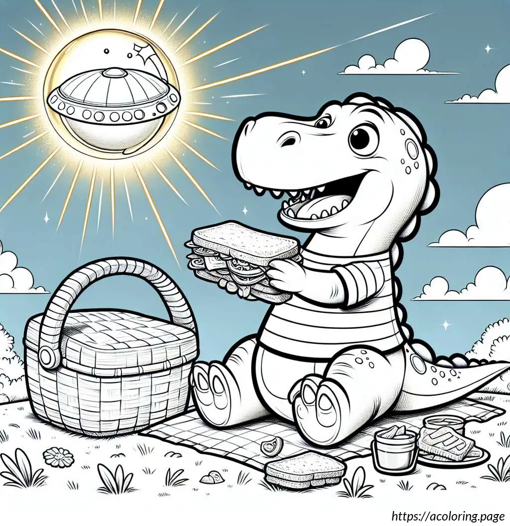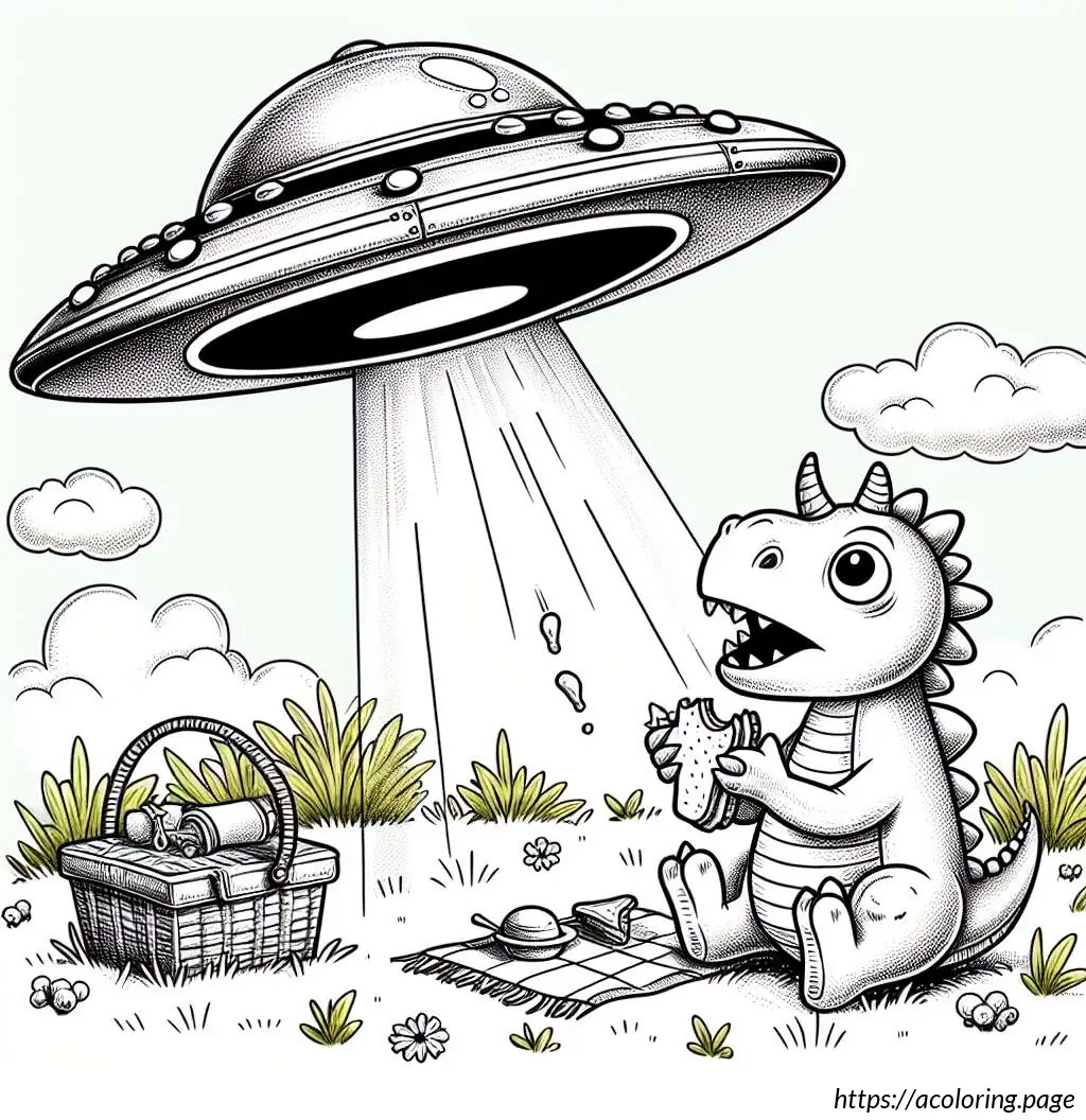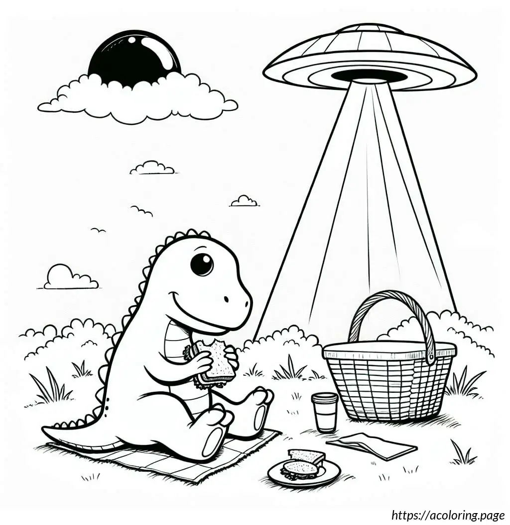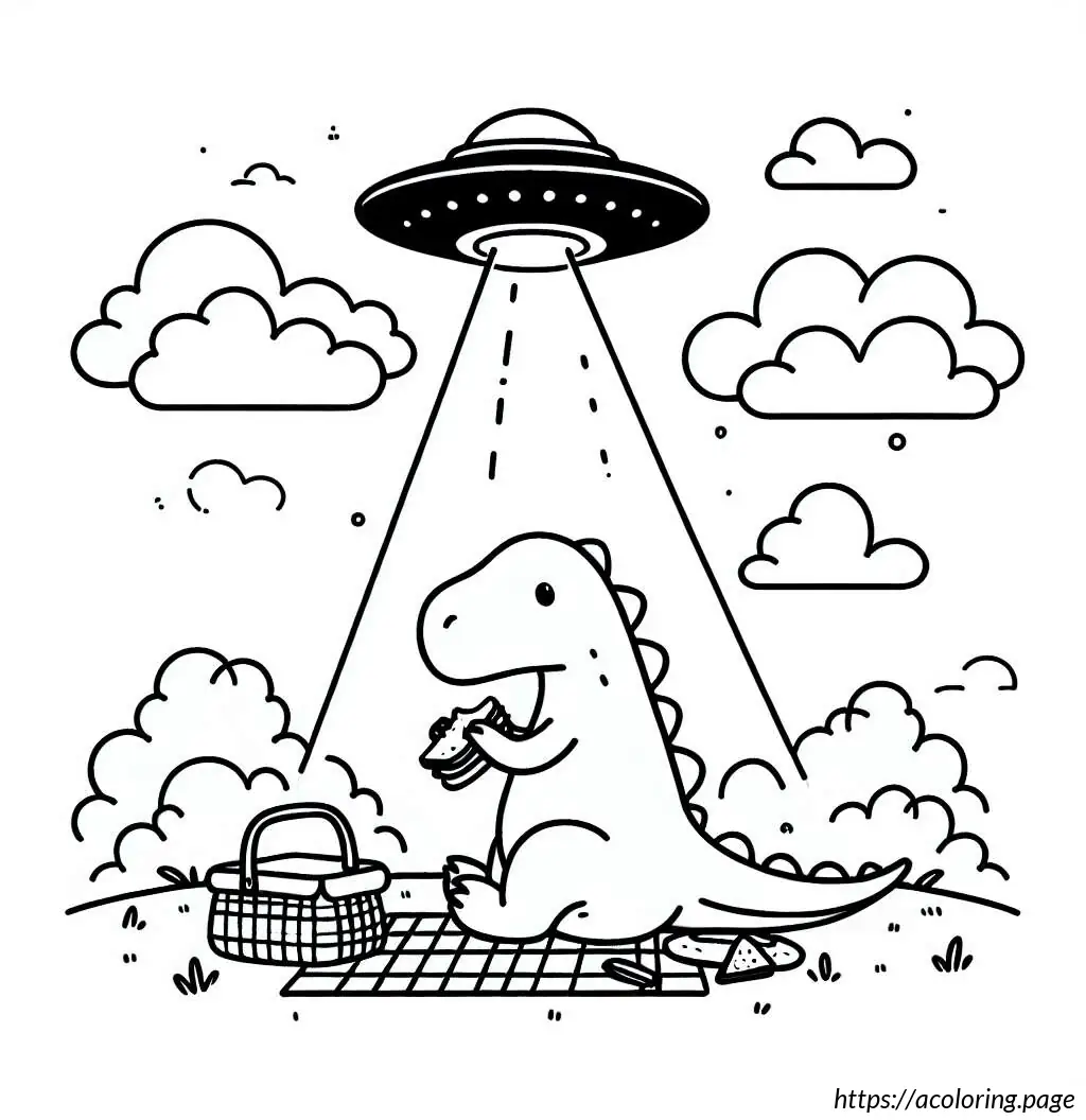 This image is a whimsical black-and-white illustration that features a cartoon dinosaur sitting on grass, looking surprised as it is being abducted by a flying saucer. The UFO, depicted above the dinosaur, emits a beam of light which envelops the dinosaur, drawing it upwards. The dinosaur, which has horns on its head and appears somewhat perplexed, is holding a sandwich. Next to the dinosaur, there’s a picnic basket on a small blanket, suggesting that the dinosaur was in the middle of a meal outdoors when this unexpected event began to unfold. There are also a couple of fluffy clouds in the sky, adding to the outdoor, daytime setting of the scene.